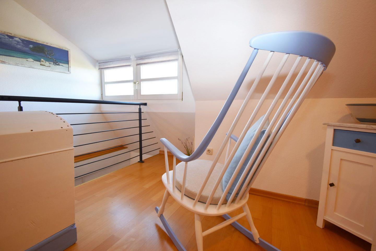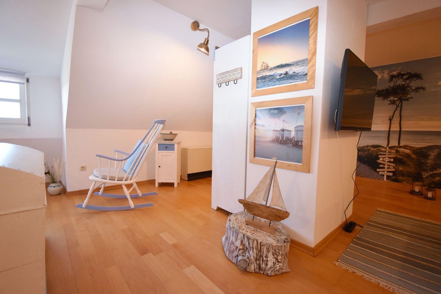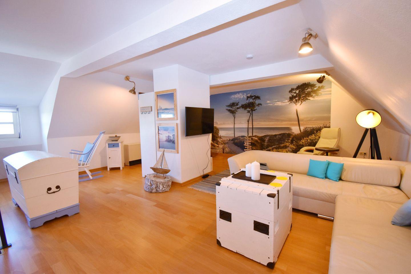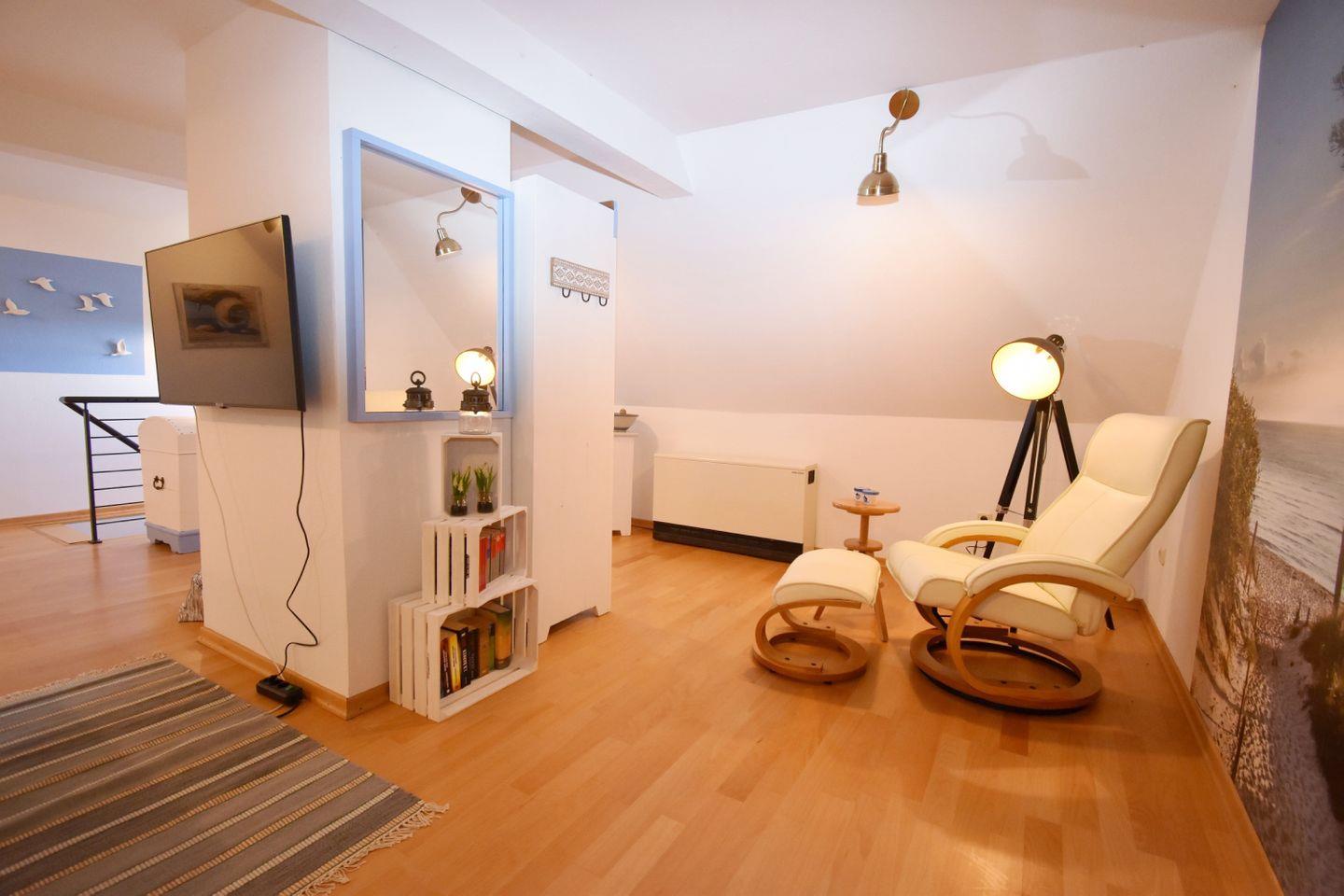 Im Dachgeschoss befindet sich der offene Wohnbereich: ein Ecksofa für entspannte Abende, eine gemütliche Leseecke und viel Raum zum Durchatmen. Das Sofa kann bei Bedarf als zusätzliche Schlafgelegenheit genutzt werden. Kostenfreies WLAN über einen Gigacube steht ebenfalls zur Verfügung.
