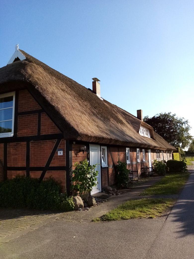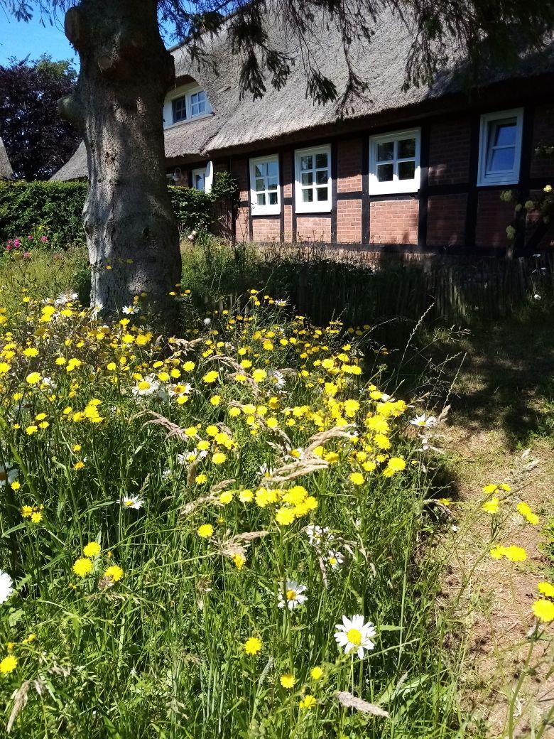 Vor dem Haus finden Sie einen Fahrradschuppen mit überdachtem Freisitz, ideal für kurze Pausen nach Radtouren oder Spaziergängen. Ein kleiner, seitlich gelegener, eingezäunter Gartenbereich kann ebenfalls genutzt werden.