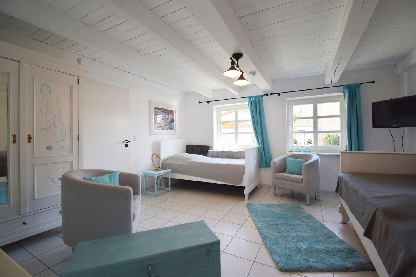 Die 110?m² große Wohnung erstreckt sich über zwei Etagen und verbindet gemütlichen Wohnkomfort mit nostalgischem Flair. Im Erdgeschoss liegen zwei Schlafzimmer: ein Zimmer mit Doppelbett und ein weiteres mit zwei Einzelbetten – ideal für Familien oder kleine Gruppen. Die großzügige Küche lädt zu gemeinsamen Kochabenden ein und bietet direkten Zugang zum hellen Duschbad, das auch vom Elternschlafzimmer erreichbar ist.
