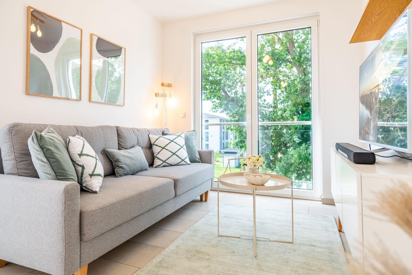 Wohnbereich - Ein lichtdurchfluteter Raum mit einem gemütlichen Schlafsofa, einem modernen Flachbild-Smart-TV und einem großzügigen Essbereich. Große Fenster lassen viel Tageslicht herein und bieten einen herrlichen Blick auf das glitzernde Haff.