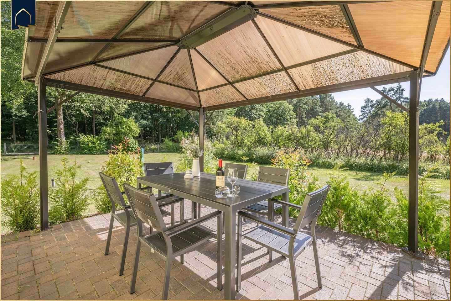 Der Garten ist ein echtes Highlight: Sonnenliegen, Gartenmöbel, Sonnenschirm und eine große Terrasse bieten alles, was Sie für entspannte Stunden im Freien benötigen. Die Kinder können sich auf der großzügigen Liegewiese oder dem Spielplatz austoben, während die Erwachsenen den Abend an der Feuerstelle oder beim Grillen ausklingen lassen. Ein Sichtschutz sorgt für ungestörte Privatsphäre, während Fliegengitter und moderne Ausstattung den Aufenthalt besonders angenehm machen.