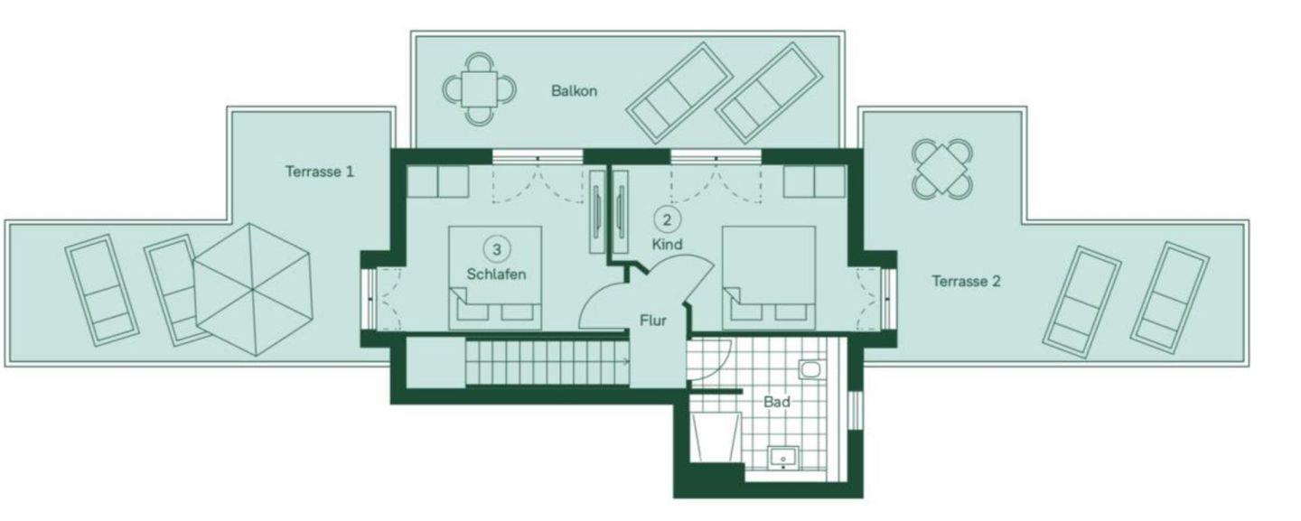 Zwei Balkone sowie zwei hochwertig ausgestattete Dachterrassen mit moderner Einrichtung – darunter ein Esstisch, bequeme Sessel und Sonnenliegen – laden dazu ein, die frische Luft in vollen Zügen zu genießen. Ob beim gemütlichen Frühstück im Freien, beim Entspannen auf der Sonnenliege oder bei einem Glas Wein unter dem funkelnden Sternenhimmel – hier finden Sie die perfekten Orte, um die Natur und den Moment zu genießen.