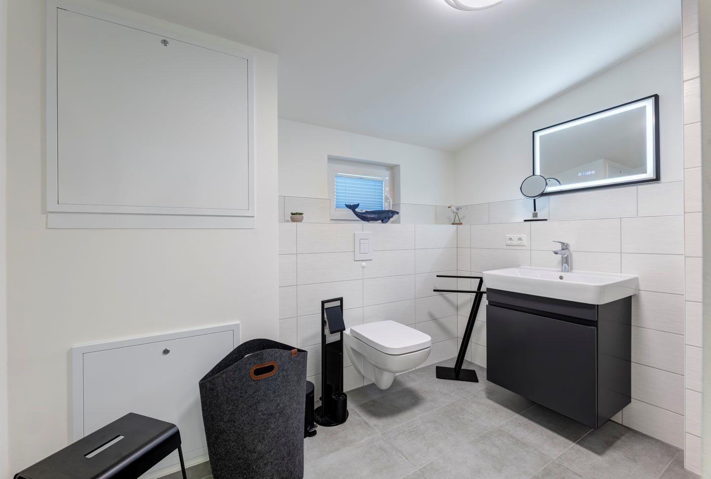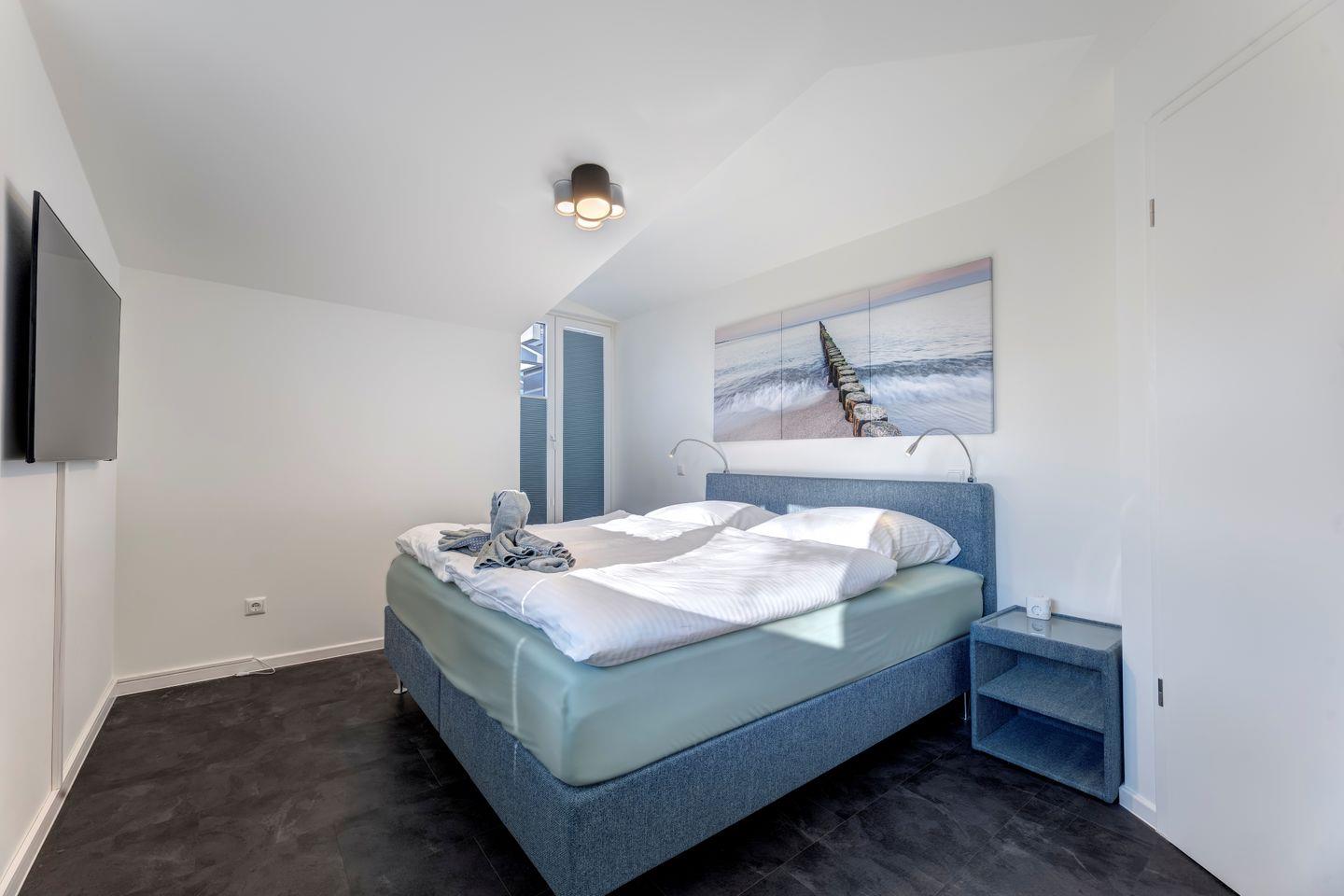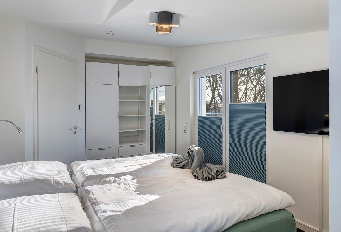 Im oberen Stockwerk befinden sich zwei stilvolle Schlafzimmer mit komfortablen Boxspringbetten und großen Fenstern, die einen beeindruckenden Blick auf den Wald und das Haff bieten. Beide Schlafzimmer verfügen über jeweils eine eigene Terrasse, ausgestattet mit bequemen Terrassenmöbeln, die zum Verweilen und Genießen der idyllischen Umgebung einladen. Hier können Sie den Tag entspannt ausklingen lassen oder die frische Morgenluft in Ruhe genießen.