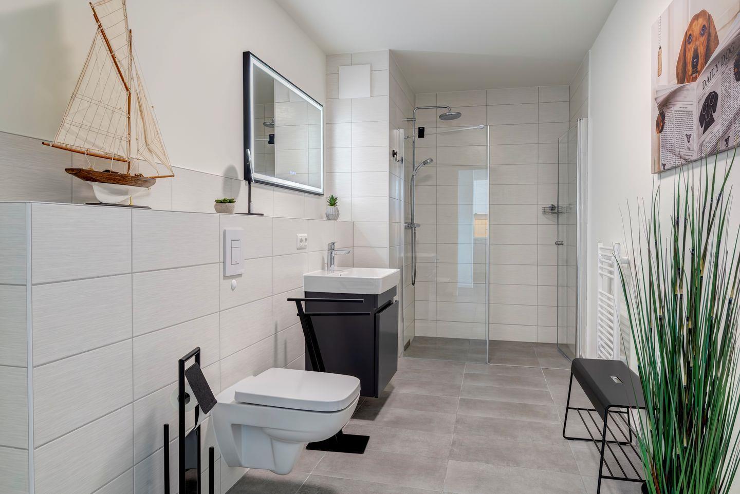 Zwei moderne Badezimmer mit bodengleichen Duschen bieten maximalen Komfort.