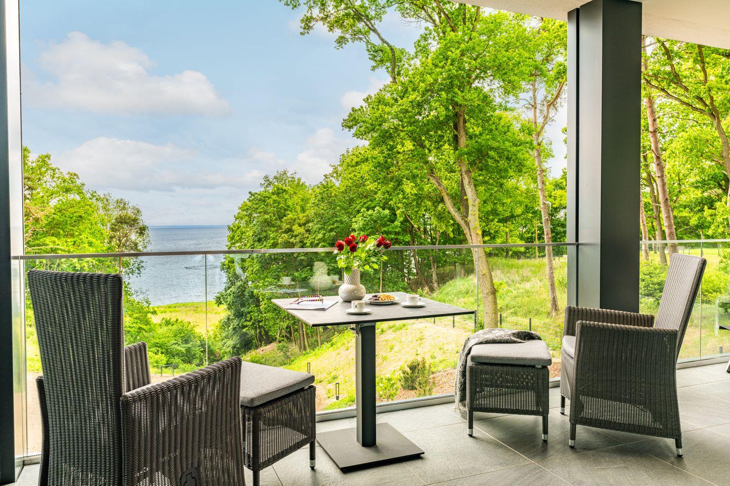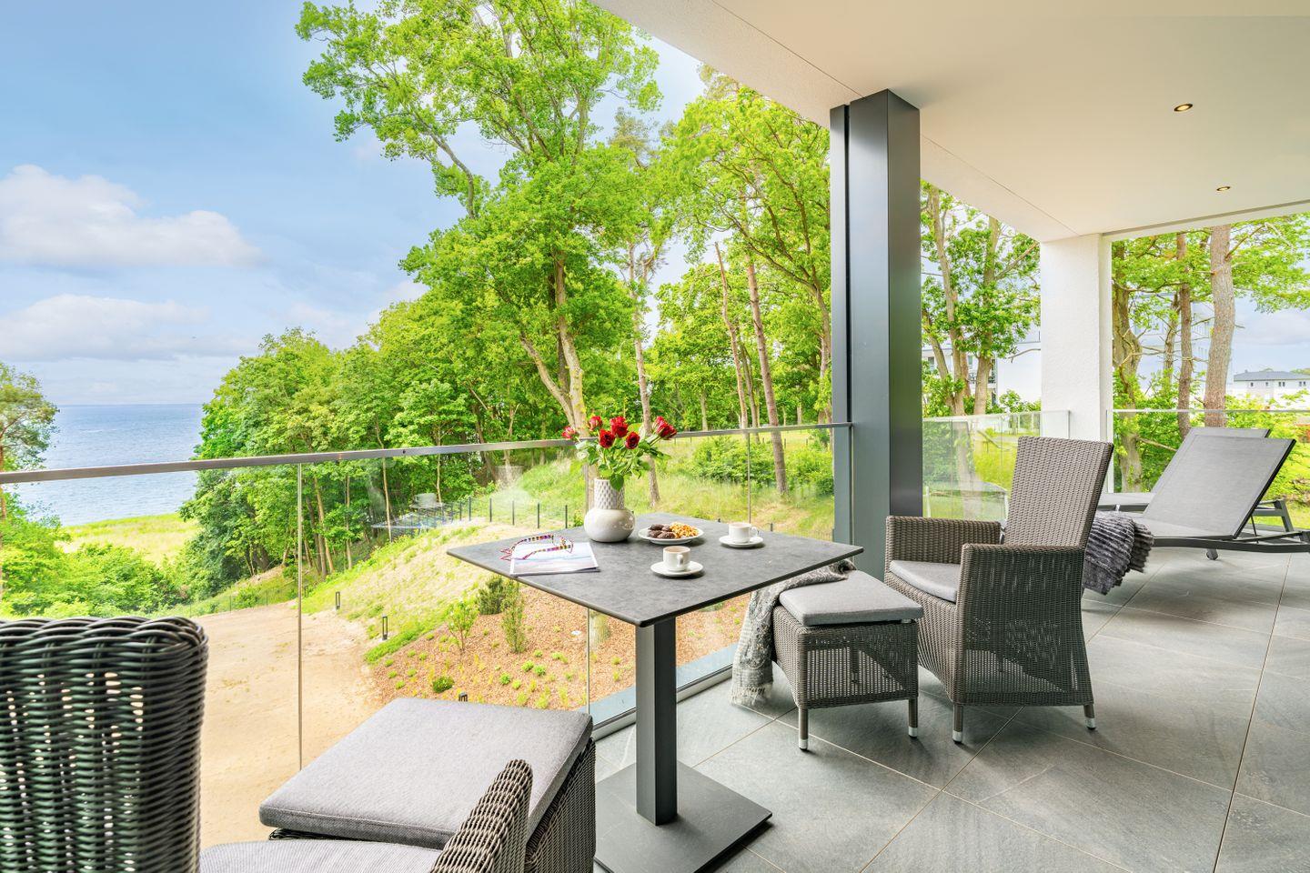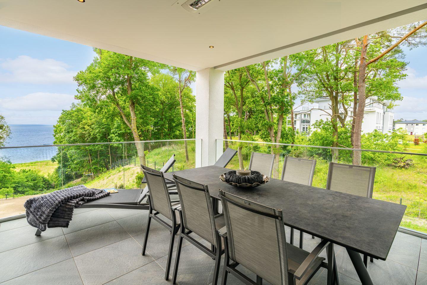 Der 28?m² große, überdachte Sonnenbalkon ist eine Oase für alle Sinne. Mit Relaxsesseln, Sonnenliegen, großem Esstisch, Seitenmarkise und Heizstrahler ausgestattet, bietet er Raum für entspannte Stunden – windgeschützt, ungestört, mit einzigartigem Blick über das glitzernde Haff.