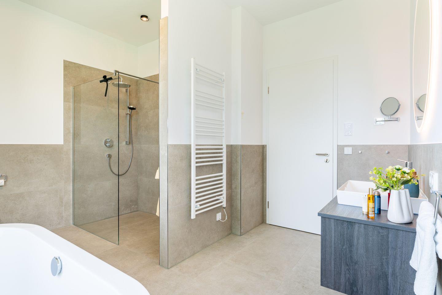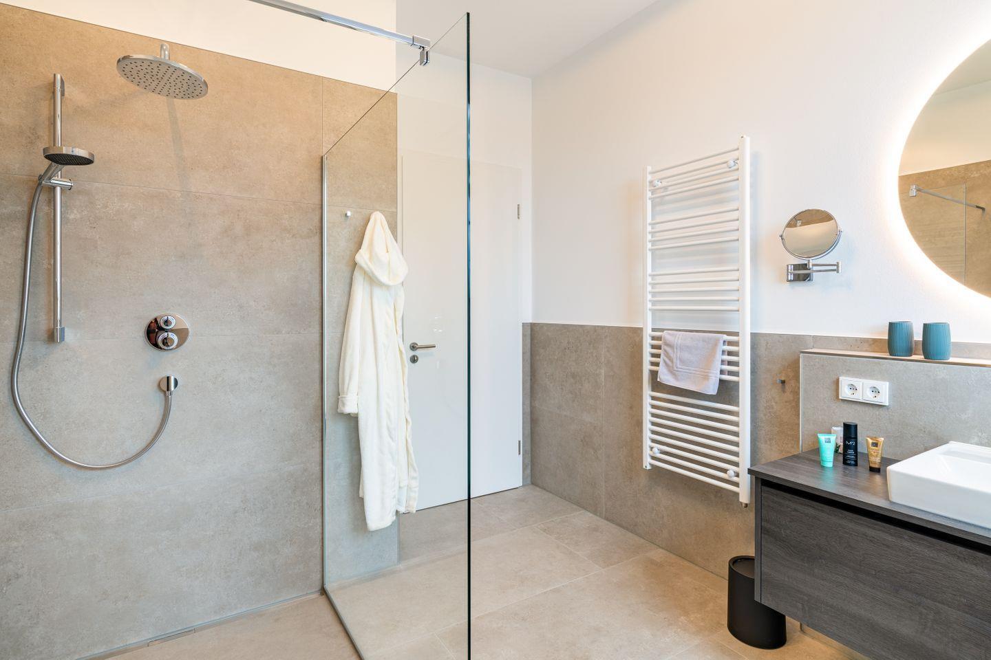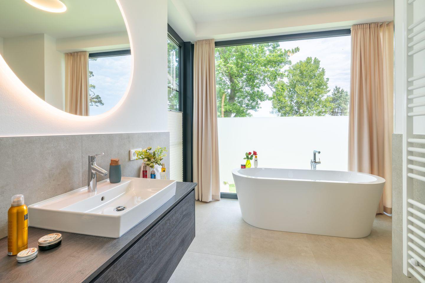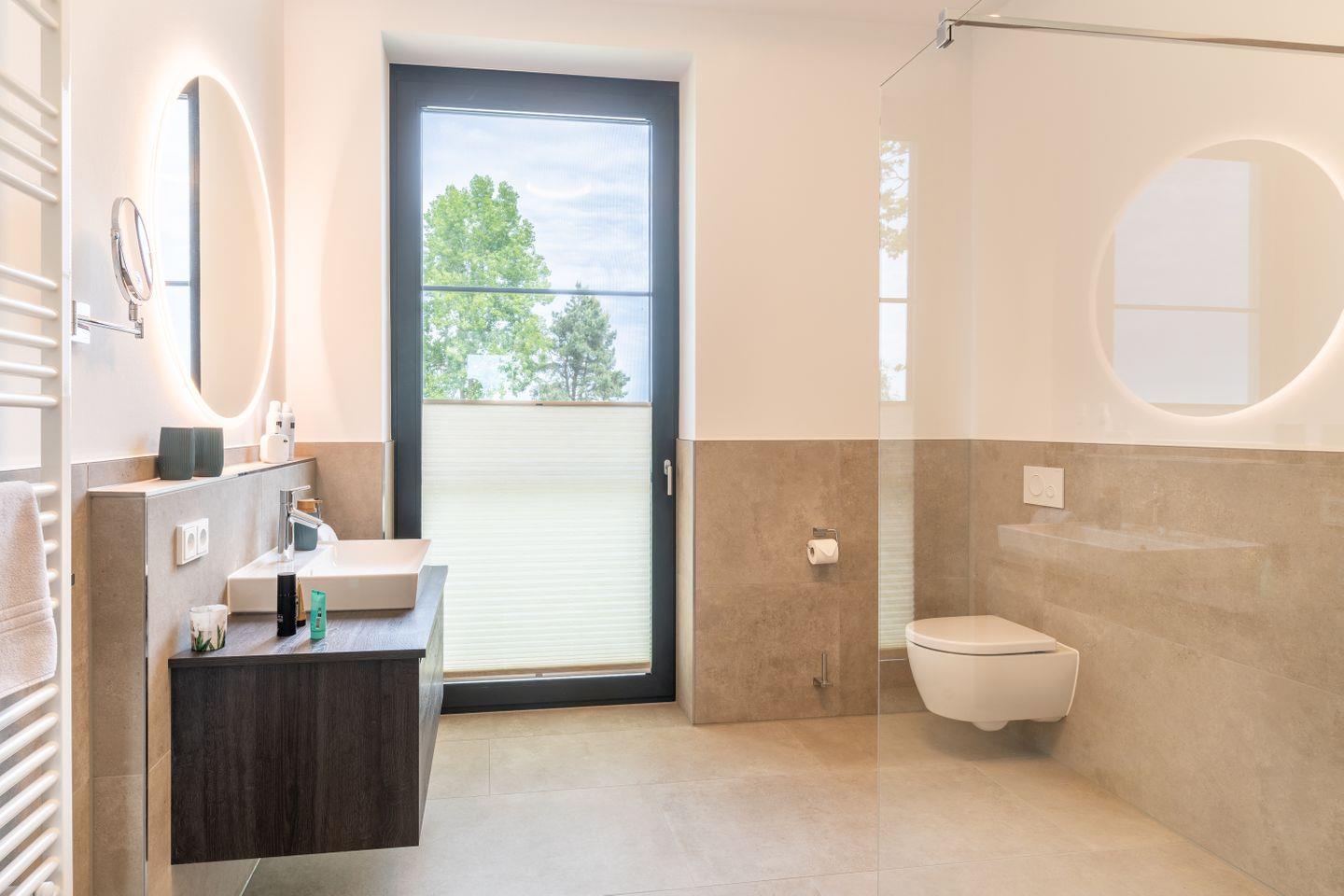 Das Hauptschlafzimmer überzeugt zusätzlich mit einem eleganten Bad en suite, ausgestattet mit bodengleicher Dusche und freistehender Badewanne. Der direkte Zugang zum Balkon und der freie Blick über das Haff verleihen diesem Raum eine besondere Qualität – ein exklusiver Ort für stille Momente.