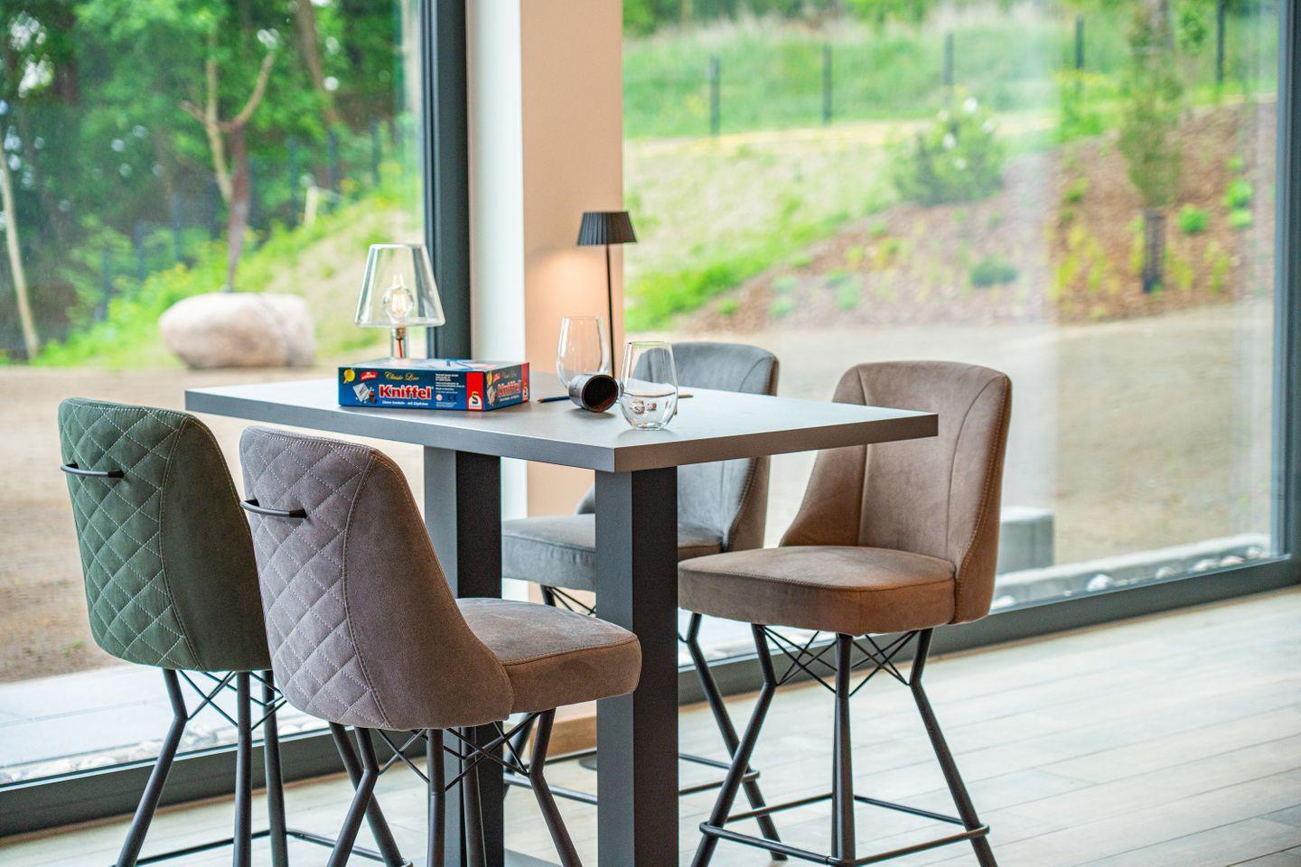 Am stilvollen Esstisch mit sechs bequemen Stühlen genießen Sie Ihre Mahlzeiten mit weitem Blick über das Haff. Der angrenzende Wohnbereich mit Ledersofa, drehbarem Sessel, Smart-TV und einem zentral platzierten Gaskamin lädt zu stilvollen Abenden voller Wärme und Leichtigkeit ein.
