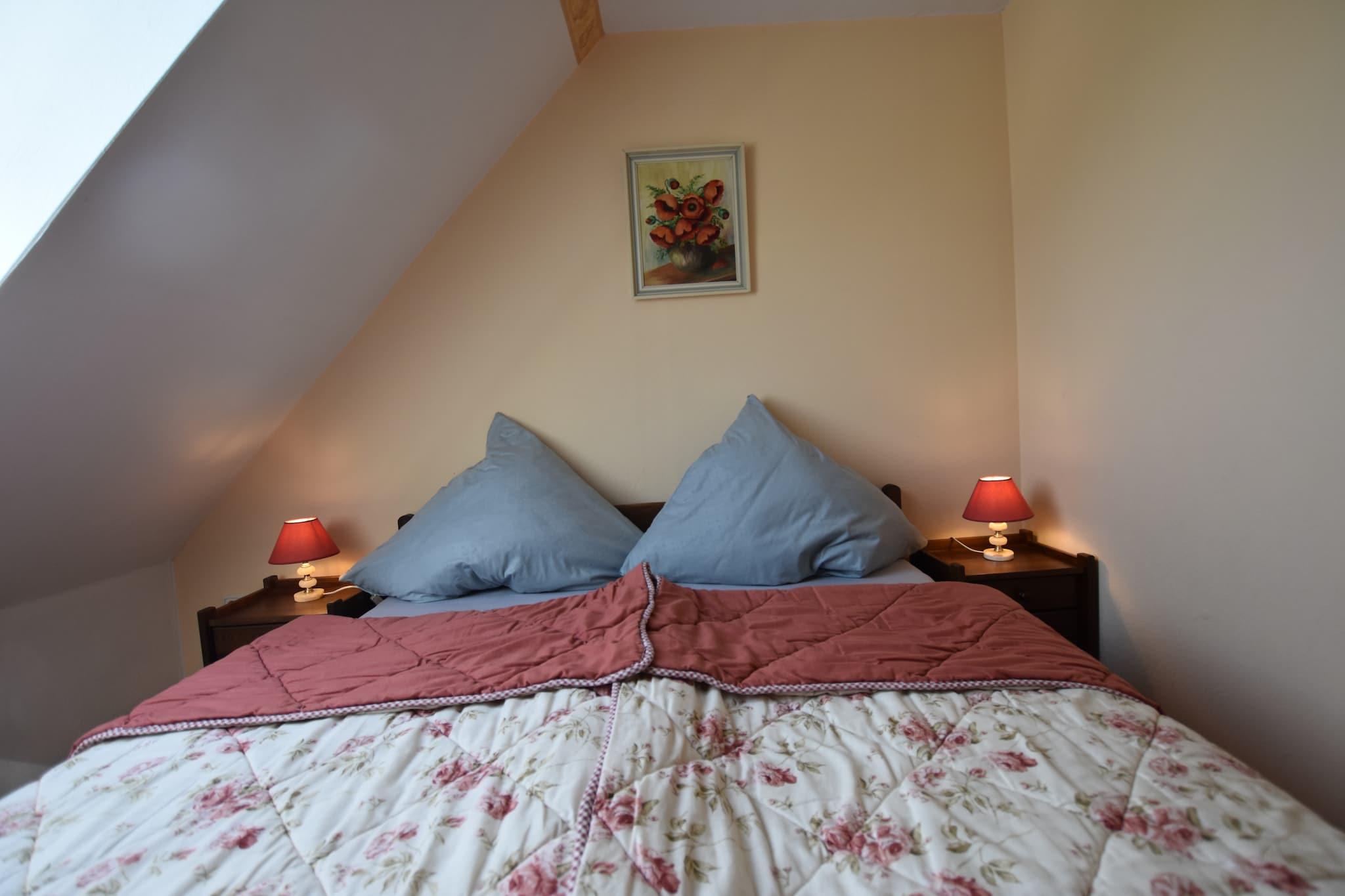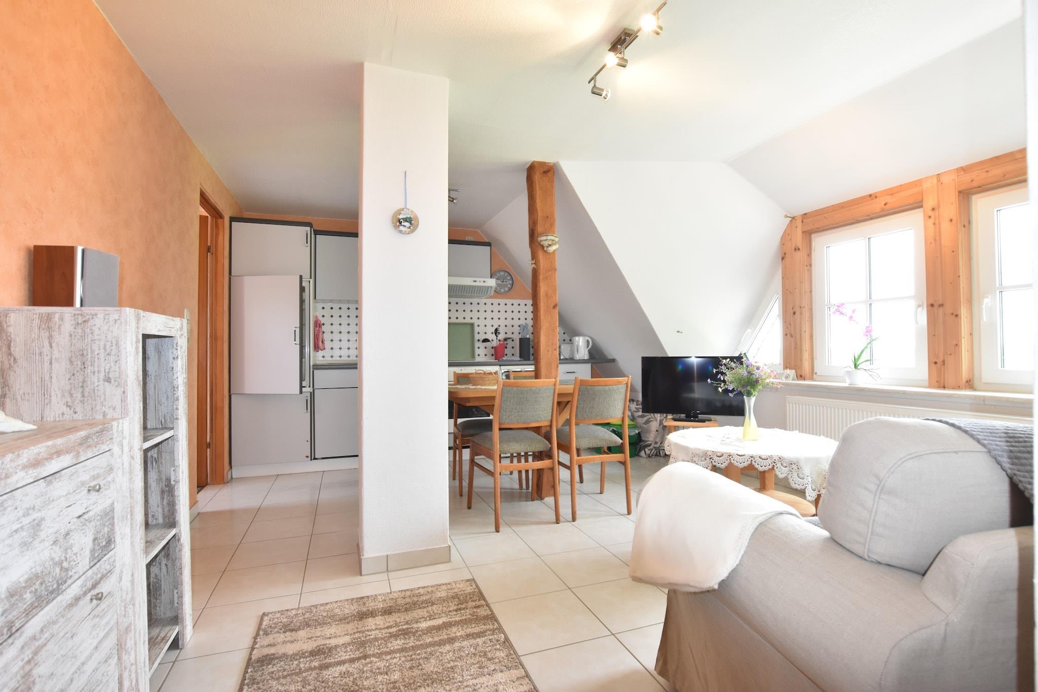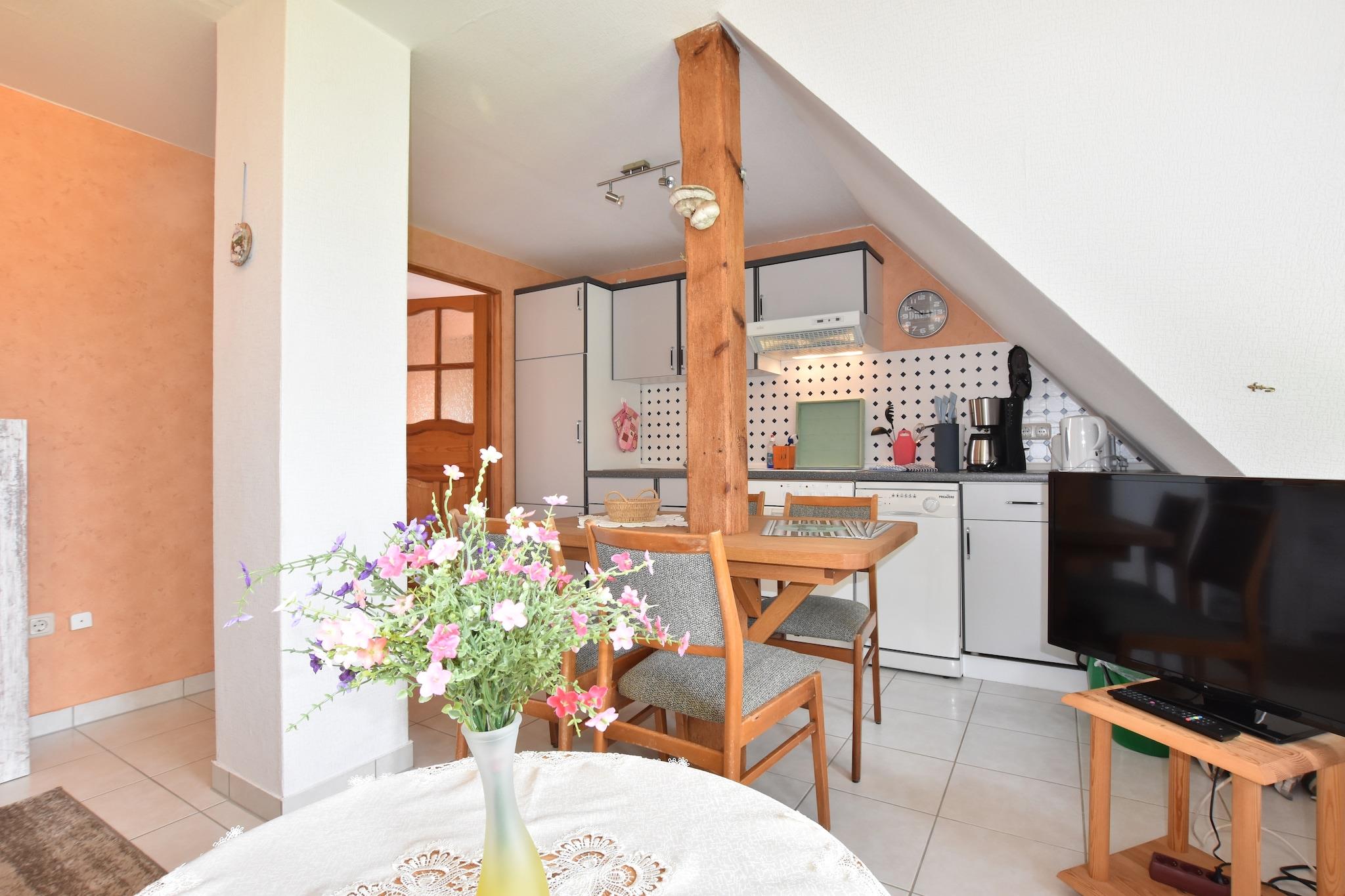 Dachgeschoss: (offene Küche(Kochplatte, Wasserkocher, Toaster, Dunstabzugshaube, Kaffeemaschine, Spülmaschine, Kühl-/Gefrierkombination), Wohn/Esszimmer(TV, Sitzecke, Radio), Schlafzimmer(2x Einzelbett), Schlafzimmer(Doppelbett king size), Badezimmer(Dusche, Toilette)) Terrasse, Garten, Gartenmöbel, Grill, Parkplatz, Tischtennisplatte