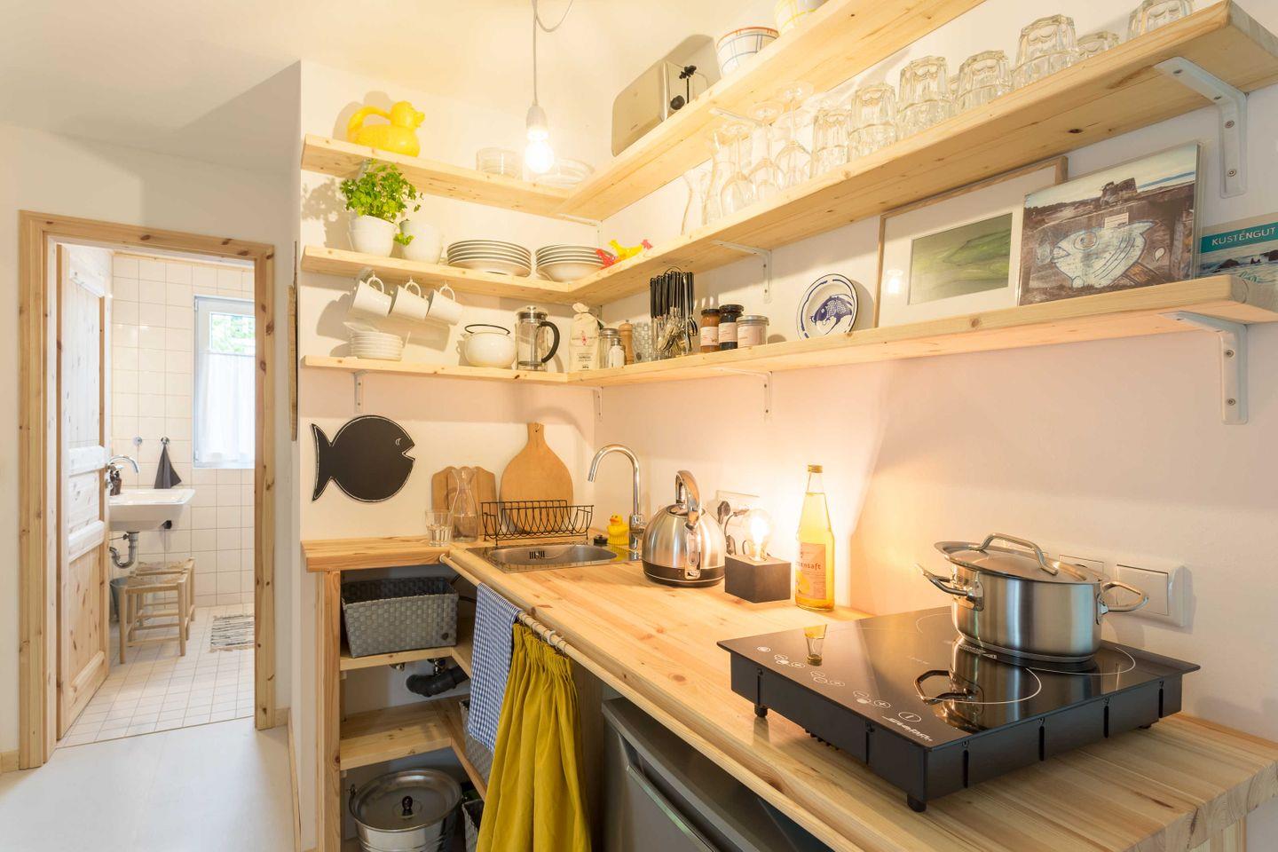 Lazy "Maileen" ist ein kleiner Bungalow mit 2 Schlafzimmern. Sie treten direkt in den großen Wohnbereich. Die liebevoll gestalteten Schlafzimmer bieten die Möglichkeit, die Betten getrennt oder zusammen zu stellen. Das Bad verfügt über eine ebenerdige Dusche. Bewusst haben wir uns auch in der Küche auf das wesentliche beschränkt - es gibt ein Induktionskochfeld und einen Kühlschrank mit Gefrierfach.