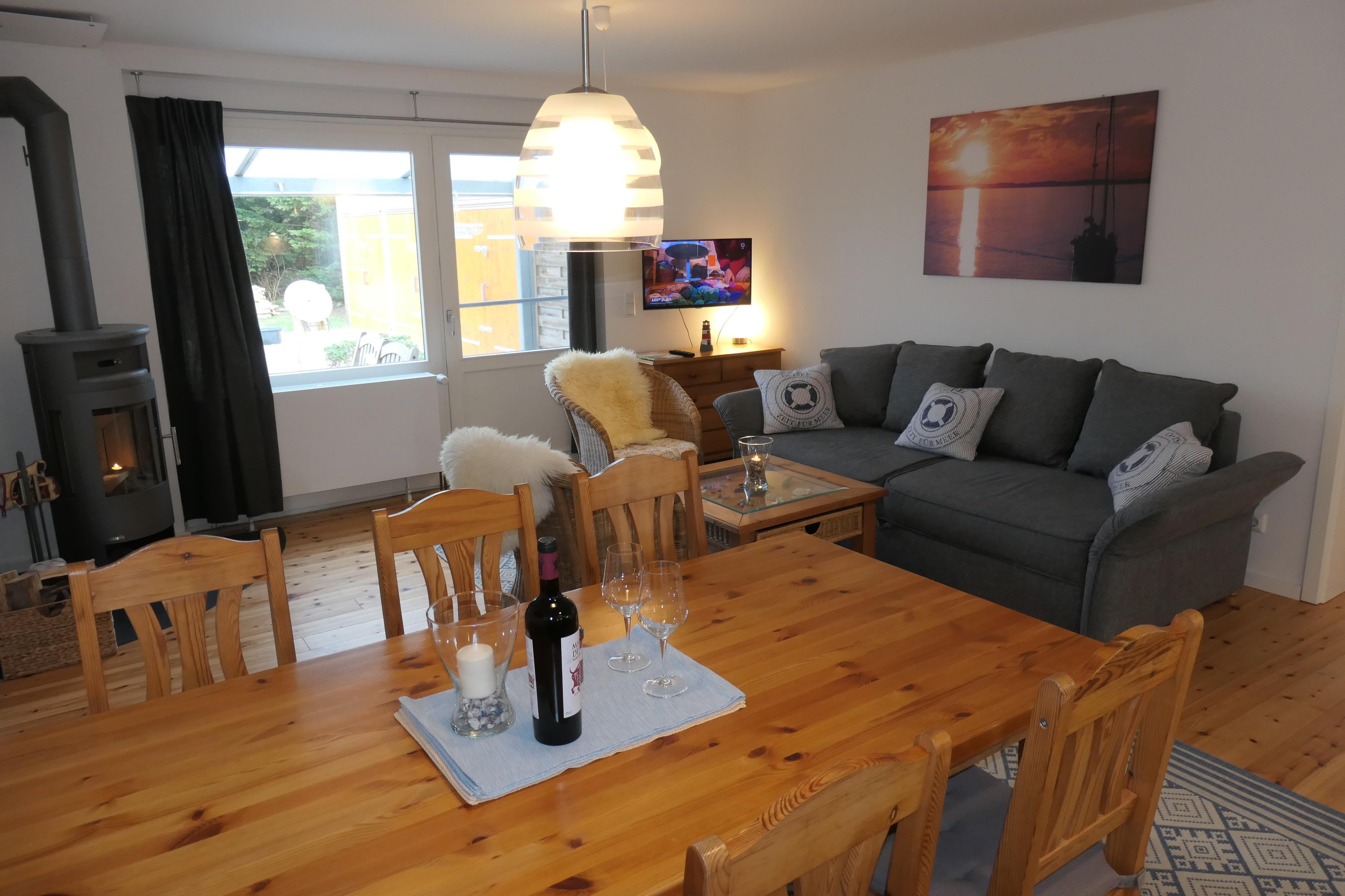 Großzügige Ferienwohnung in Gelting-Niesgrau mit 2 Terrassen, Kaminofen und nur 300 m zur Ostsee, ideal für Naturliebhaber und Familien.