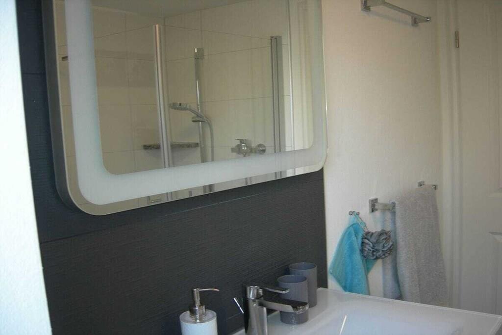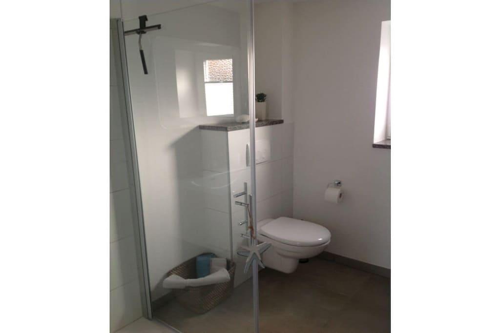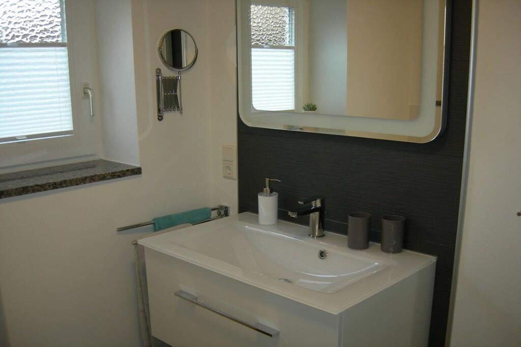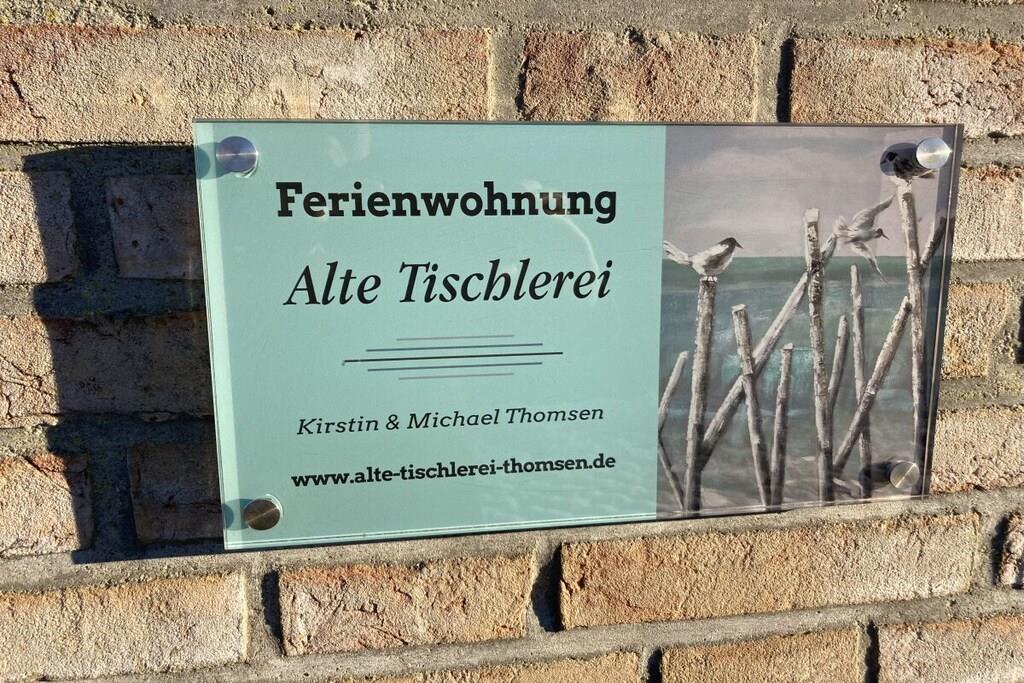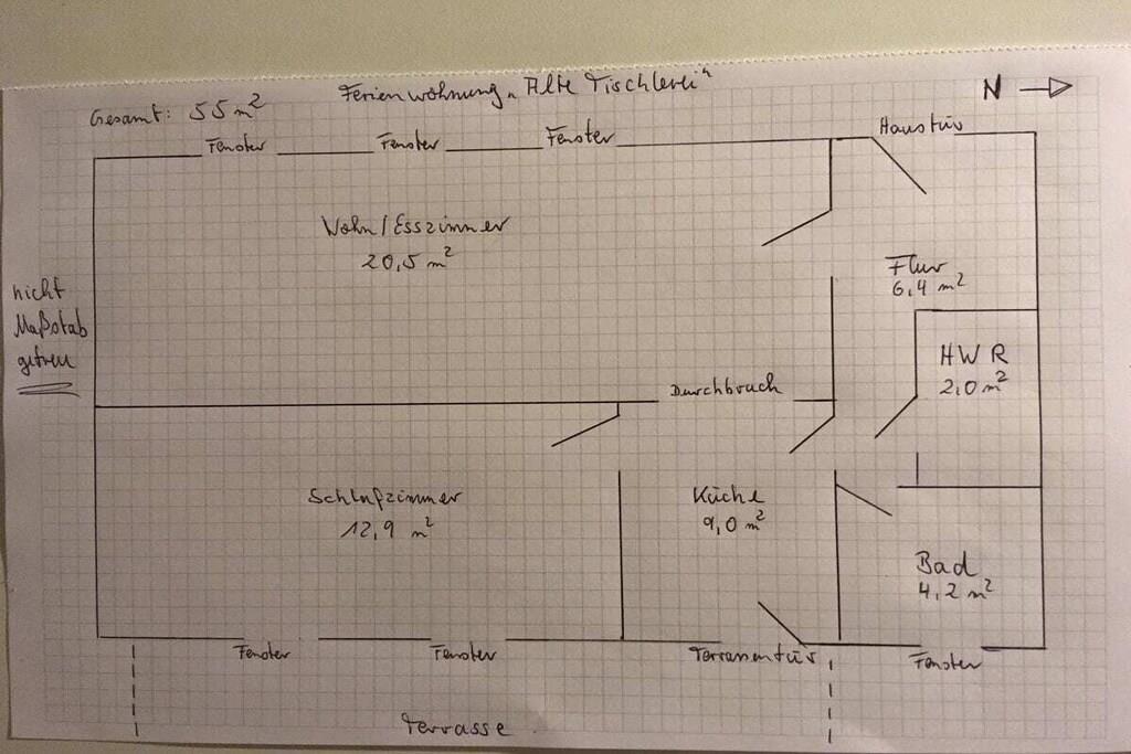 Modern, ebenerdige Ferienwohnung - 55 m²- rechts neben dem Haupthaus - ideal für 2 Gäste. Gemütliches Wohnzimmer mit ausziehbarer Wohnlandschaft, rustikaler Esstisch und Schwingstühlen. Durchgang zur modernen neuen Einbauküche mit Allem was dazugehört, Spülmaschine, Kühl-Gefrierkombination, Ceran Kochfeld- Backofen, Kaffee -Pad Maschine. Die Küchenausgangstür führt zur 15 m² gepflasterten mit Weidenplatten abgegrenzten Terrasse - im Sommer mit einem Pavillon überdacht- mit Blick nach Osten in den blühenden Obst-Blumengarten zum Genießen und Relaxen! Ein Schlafzimmer mit geschmiedetem Doppelbett und geräumigen Schrank. Das neue Bad besteht aus einer ebenerdiger Dusche, Hänge WC und Glasspültisch. Ein geräumiger Flur mit Sitzbank und angrenzendem HWR runden die gemütliche Atmosphäre in der - Alten Tischlerei- ab.