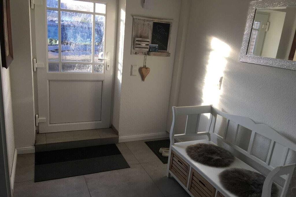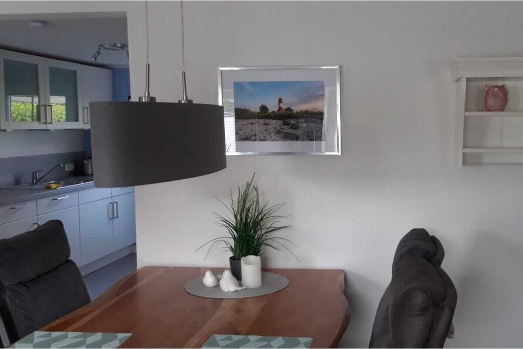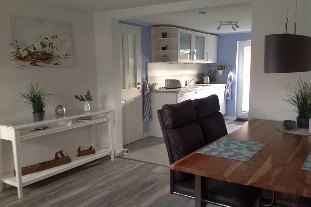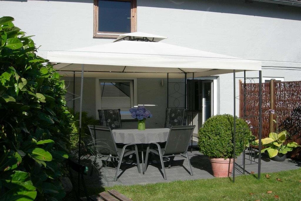 Moderne Ferienwohnung in Gelting mit Terrasse und blühendem Garten für entspannte Tage zu zweit.