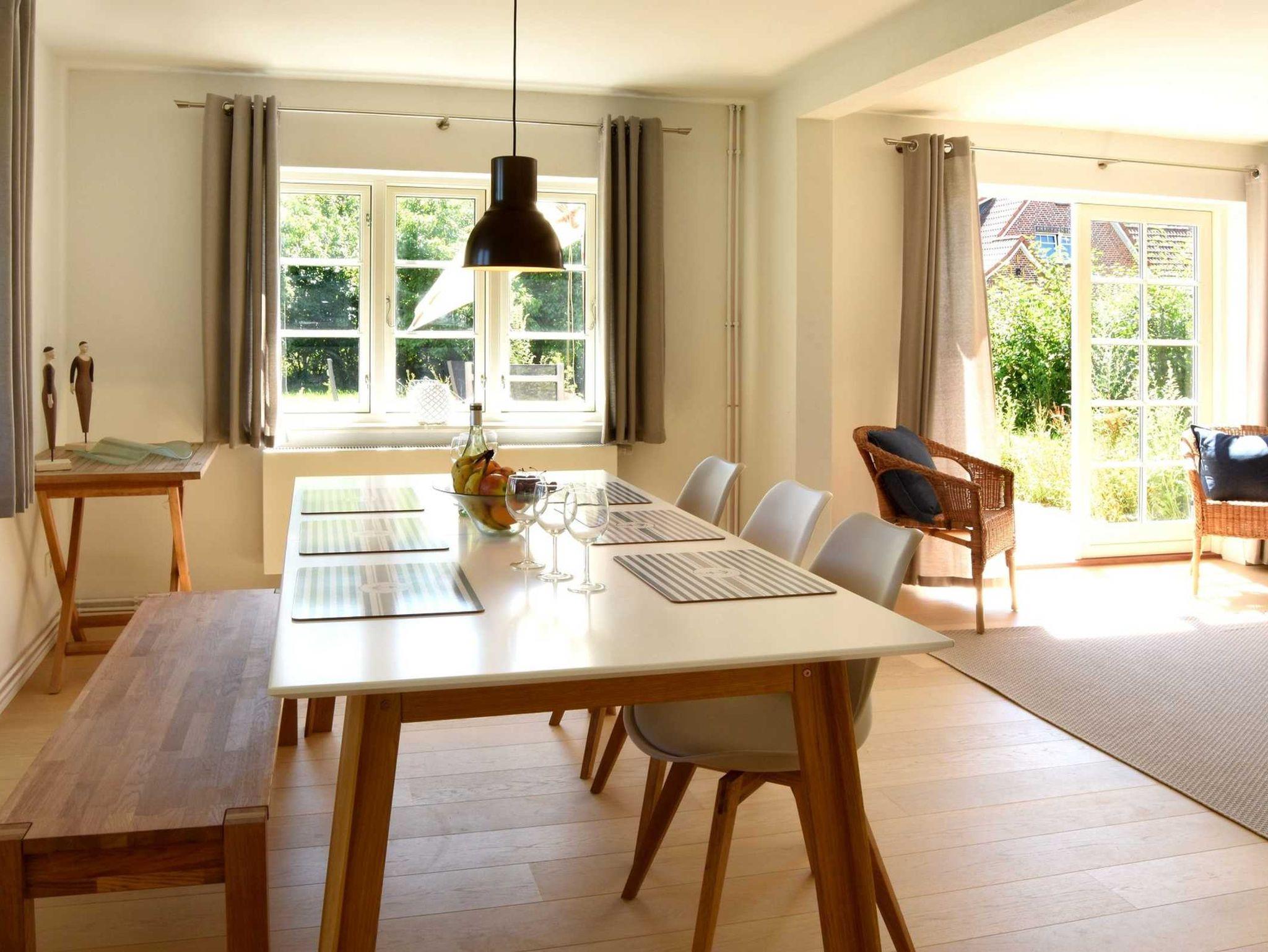 Das Ferienhaus Altes Schusterhus ist ein historisches Reetdachhaus im klassischen norddeutschen Baustil. Das ca. 1870 erbaute Haus wurde 2015 vollständig restauriert und stilvoll mit viel Liebe zum Detail eingerichtet. Der lichtdurchflutete großzügige Wohn- und Essbereich mit hellen Eichendielenboden garantiert bei jeder Wetterlage einen behaglichen Aufenthalt. Im Erdgeschoss befinden sich neben dem Wohn- und Essbereich mit direktem Zugang zur Terrasse und Garten, zwei Doppelschlafzimmer, eine geräumige Diele, die Küche und ein großes Badezimmer mit Dusche und Badewanne. Das Obergeschoss unterteilt sich in ein Kinderzimmer mit Schlafmöglichkeiten für bis zu drei Kinder, einen offenen Studiobereich und eine weitere Toilette.