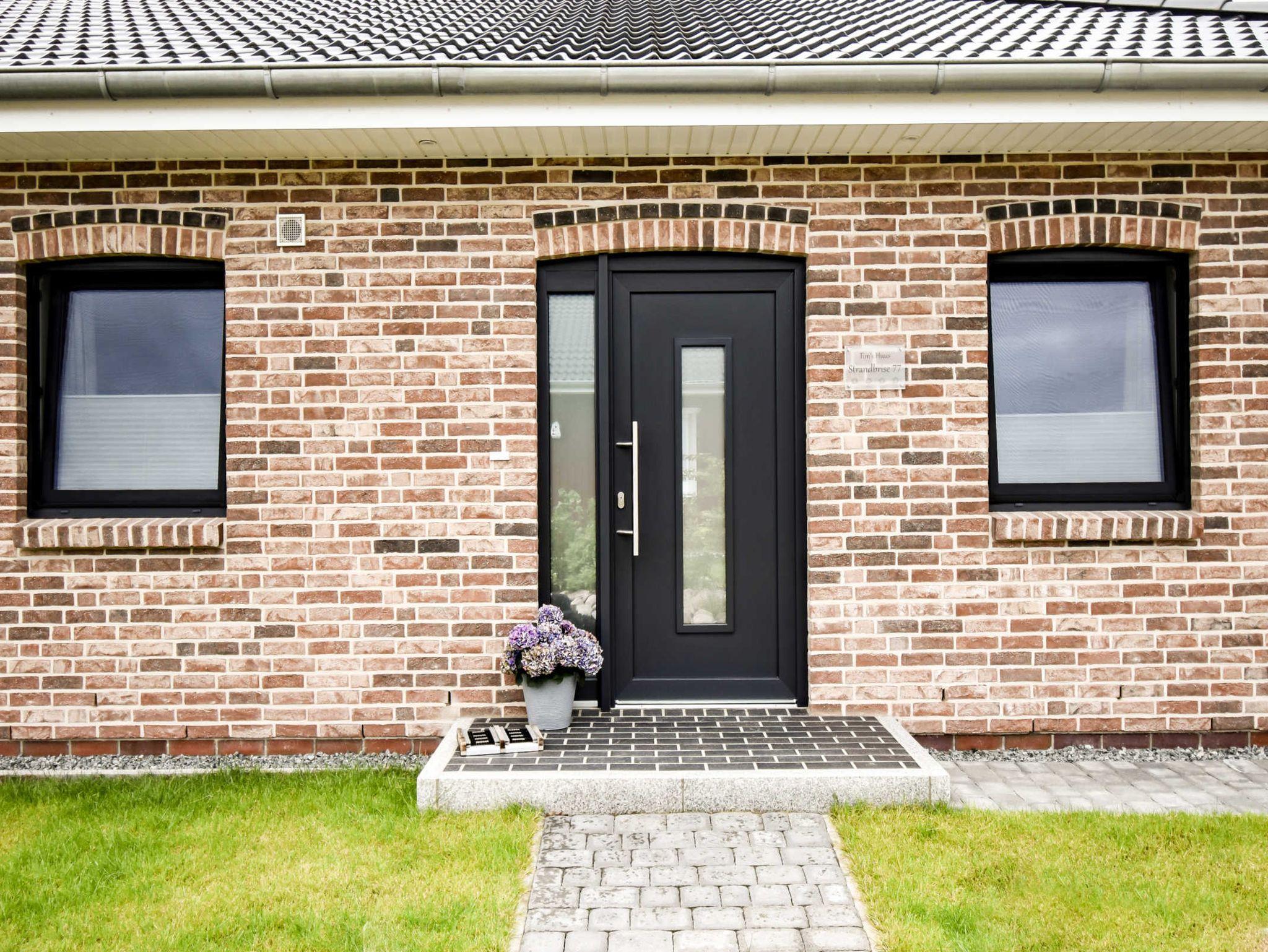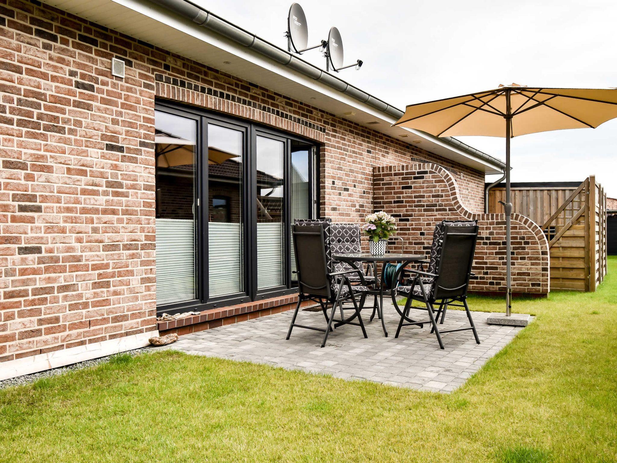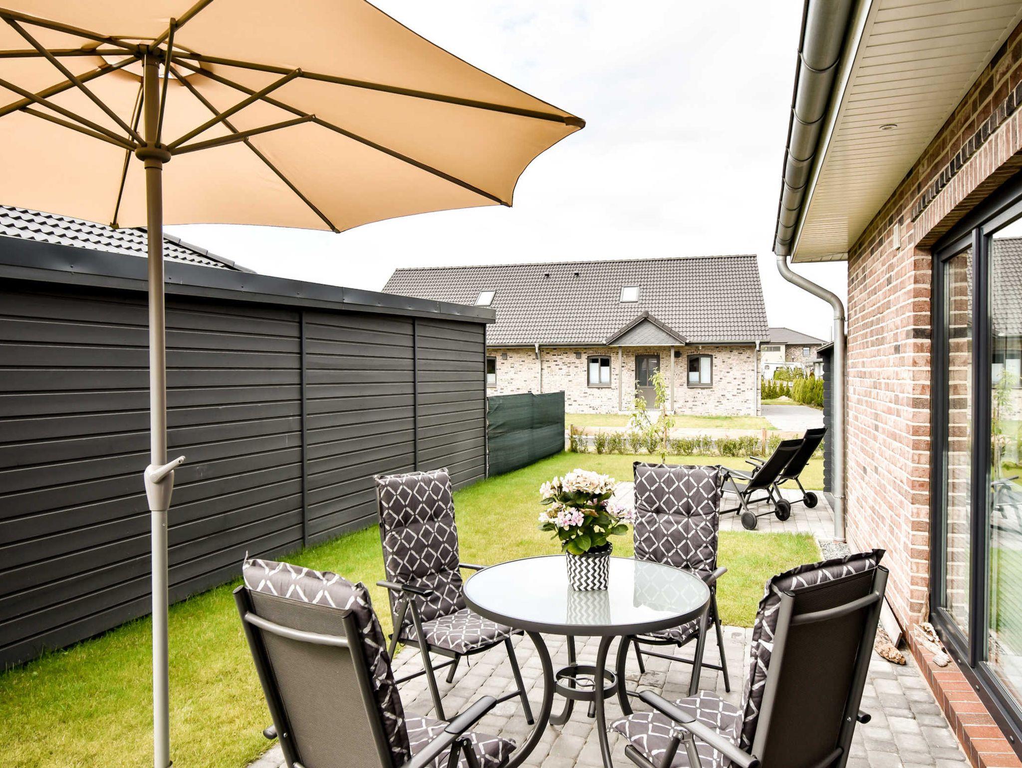Maritim modernes Ferienhaus nahe Ostsee mit Terrasse, Garten und Fußbodenheizung für erholsamen Urlaub.