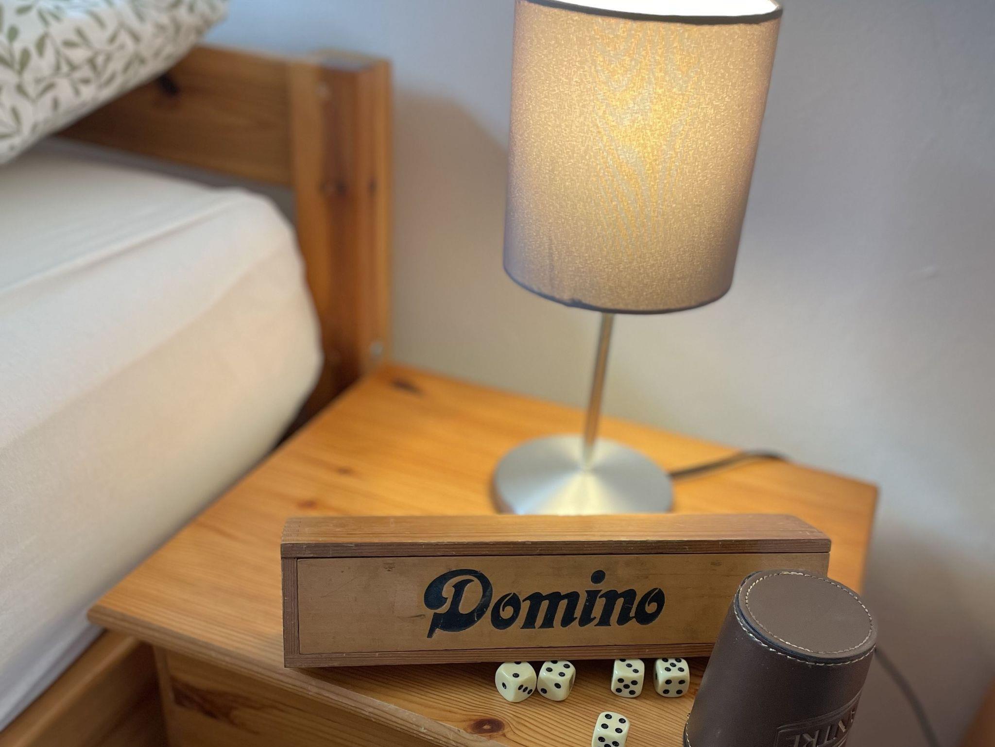 einen Schlafraum mit Doppelbett und Kinderbett und einen Schlafraum mit zwei Einzelbetten und ein Duschbad. Das Badezimmer ist über das erste Schlafzimmer zu erreichen.