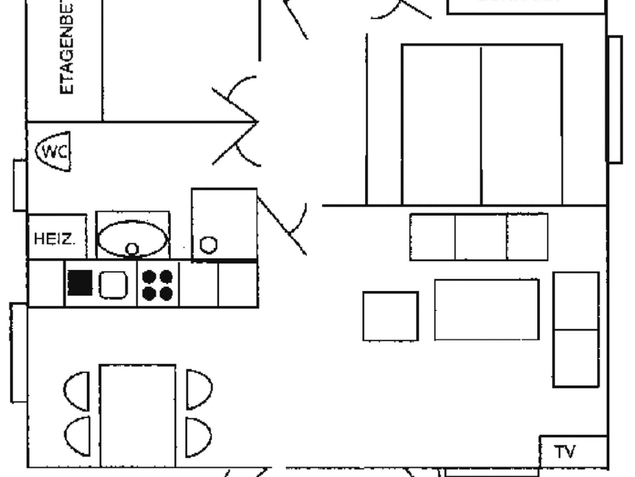 Ferienhaus (50 qm), Wohnraum mit Küche, 1 Schlafraum(Doppelbett), 1 Schlafraum (Etagenbett), Dusche/WC, Kinderbett möglich, Fahrräder vorhanden, Endreinigung und Bettwäsche sind inklusive.