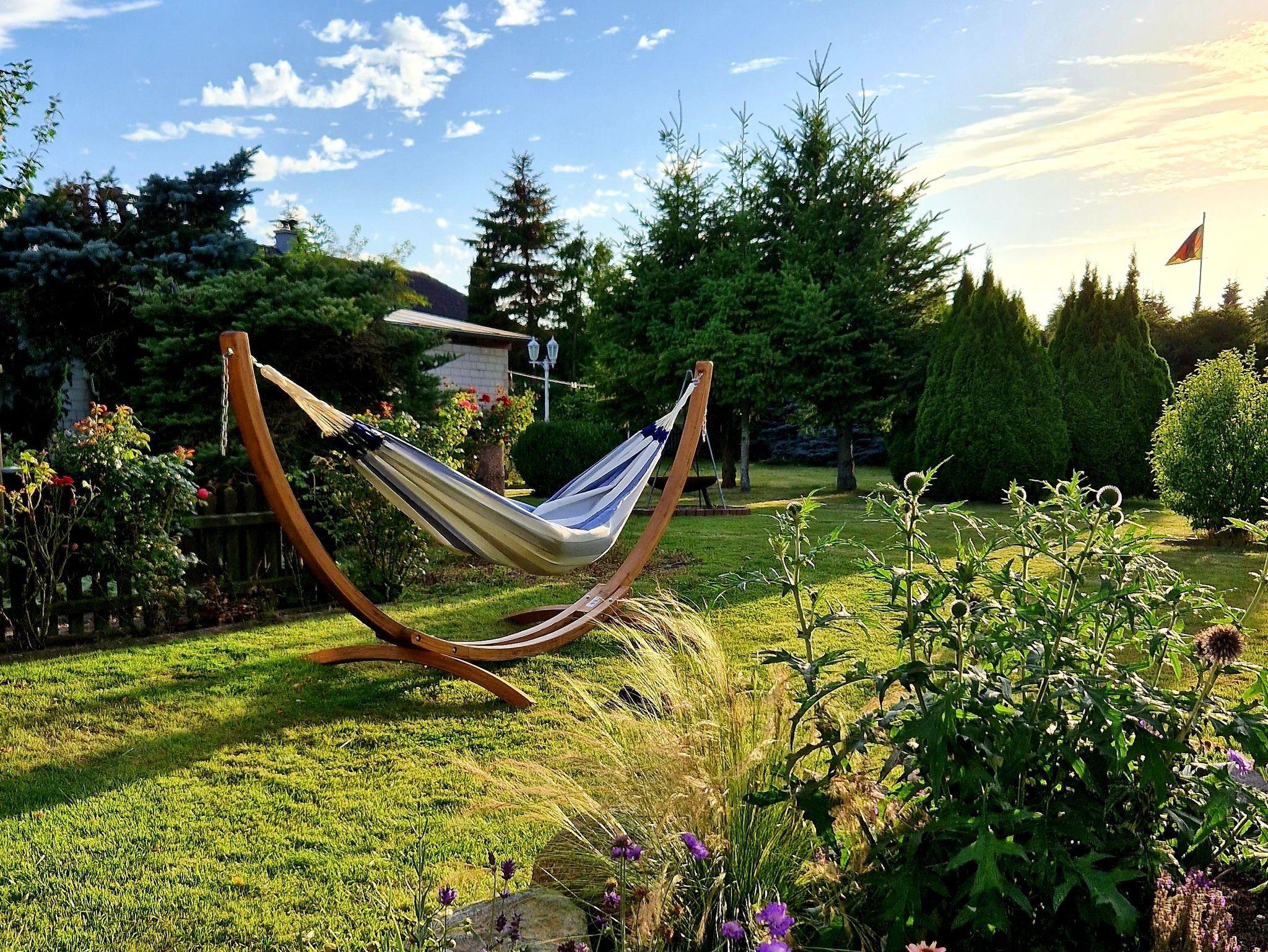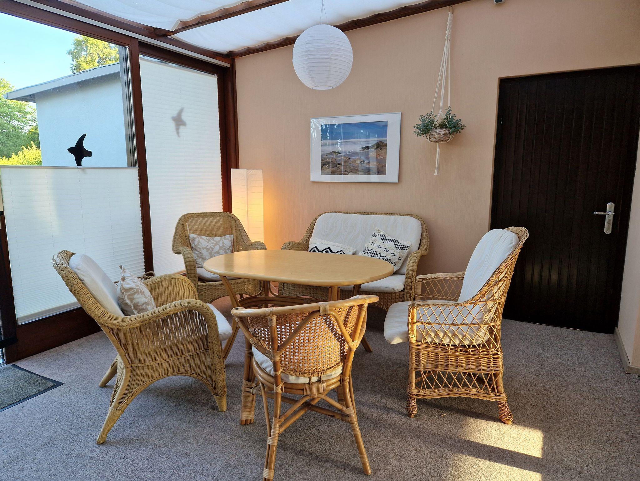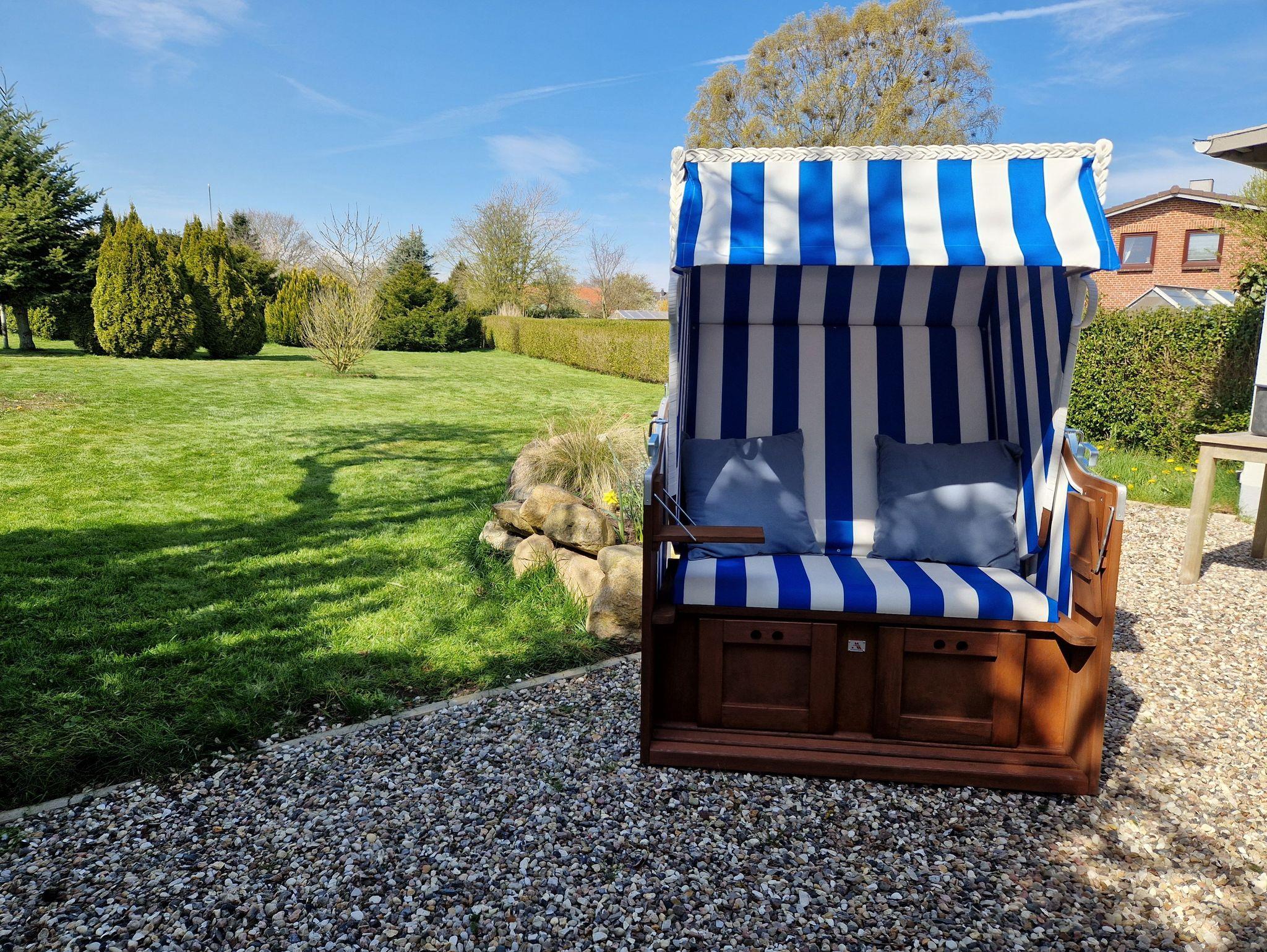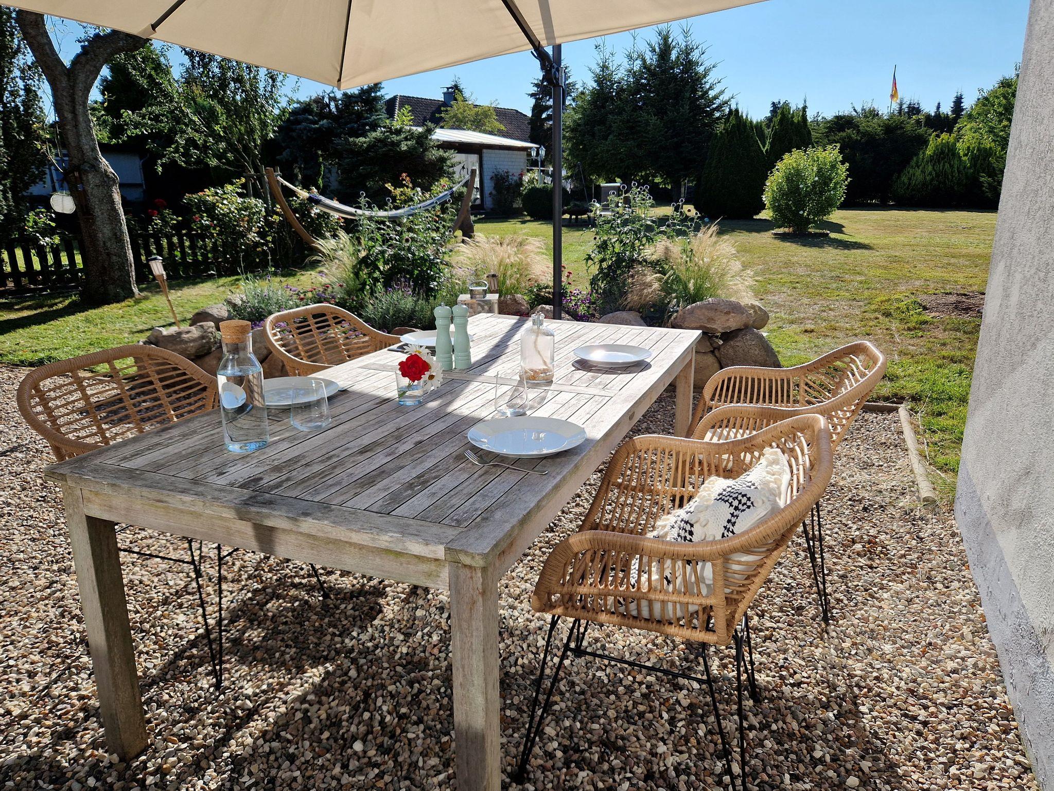 Die Terrasse in Südwestrichtung ist mit Sitzmöbeln, Sonnenschirm, Sonnenliegen, Strandkorb und einem Grill ausgestattet. Im großen Garten warten das Poolhaus und eine komfortable Hängematte auf Besuch. Der Pool ist über eine Folie sonnenbeheizt und von ungefähr Ende Mai bis Ende August nutzbar. Mitgebrachte Fahrräder können in der Garage mit Lademöglichkeit für E-Bikes sicher untergebracht werden. Direkt am Haus befindet sich ein Pkw-Stellplatz.