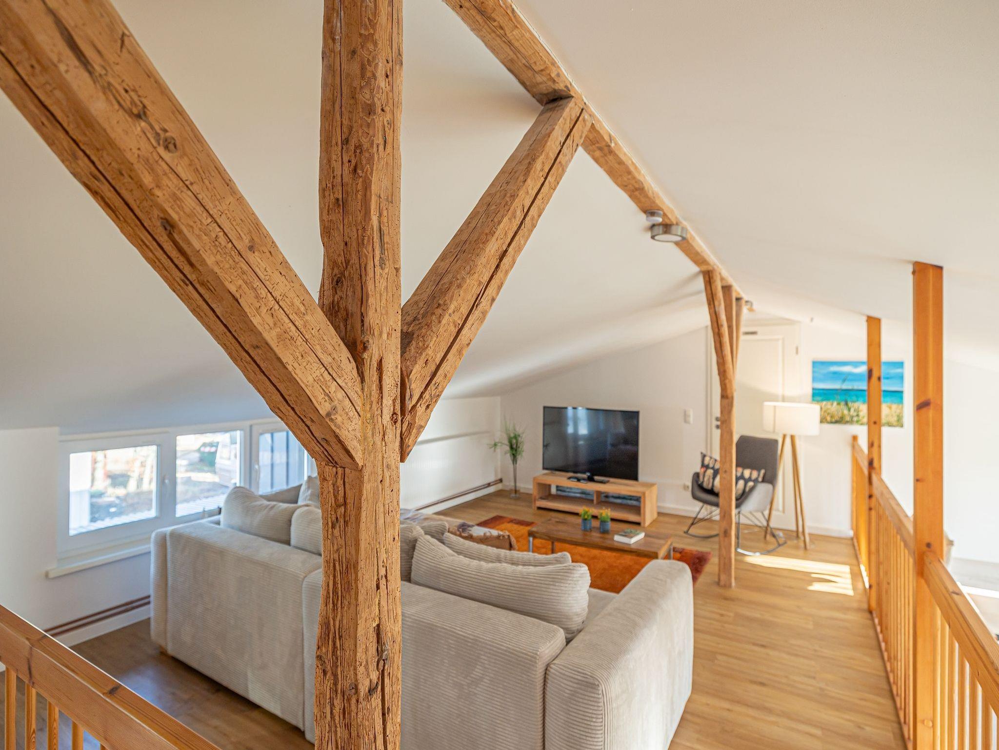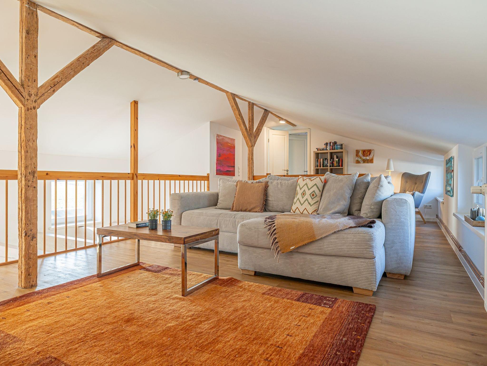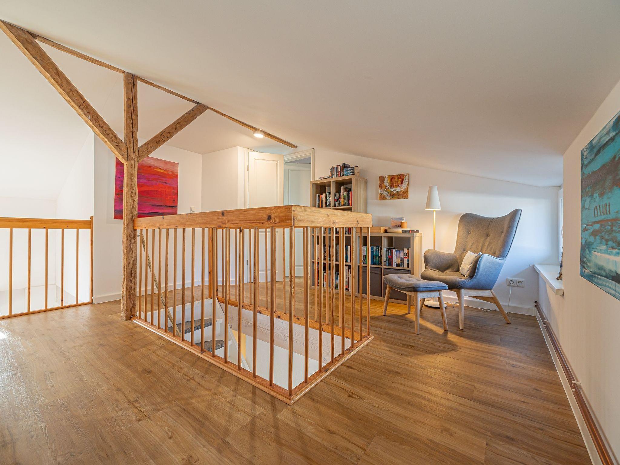 • großer, offener Wohnbereich auf der Galerie mit Schlafsofa und Leseecke