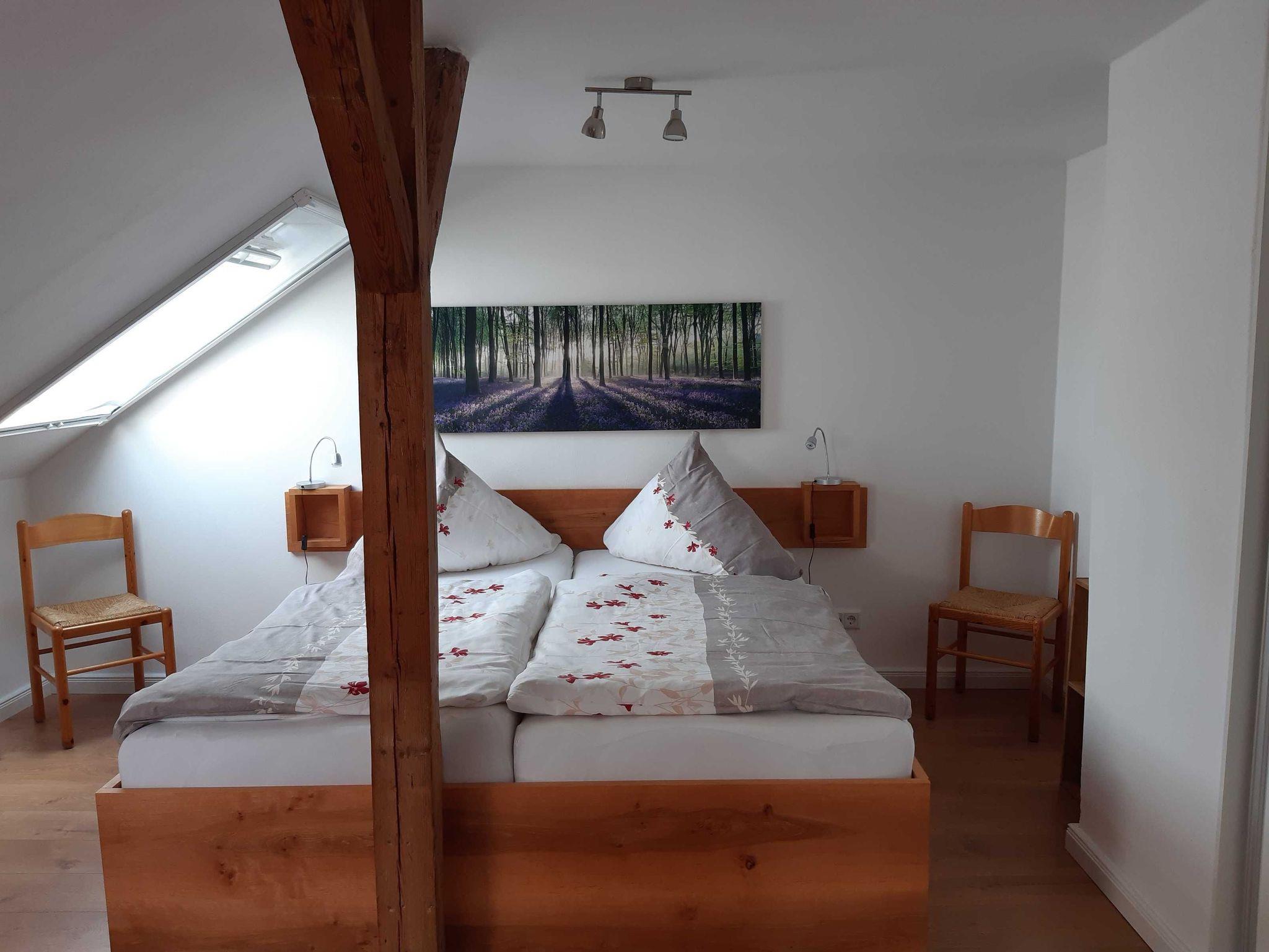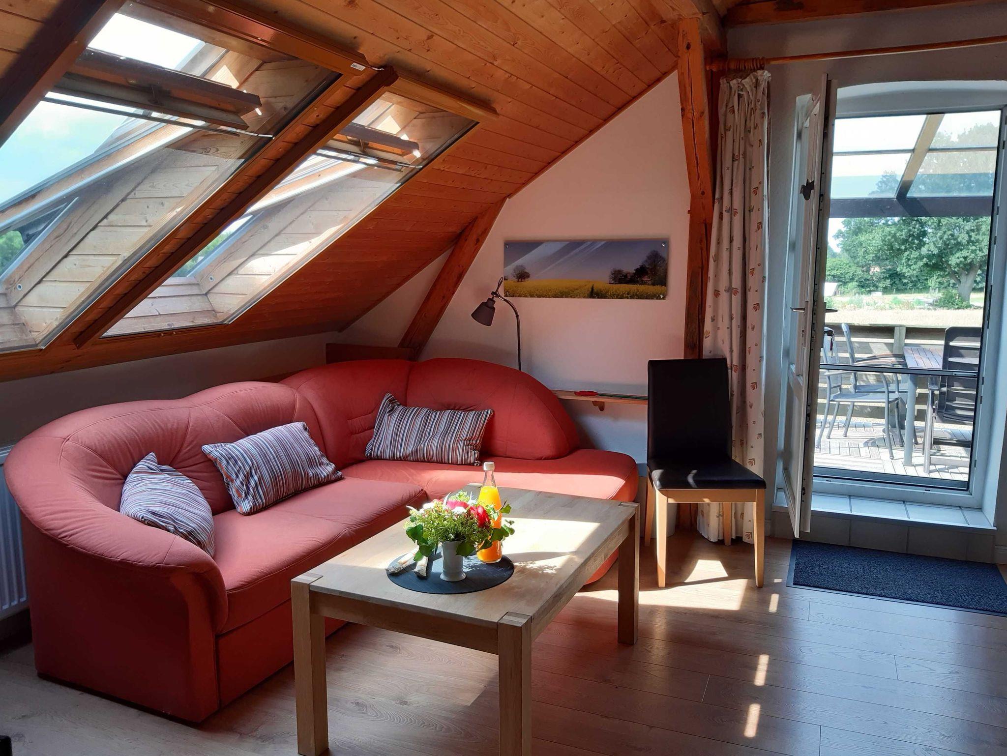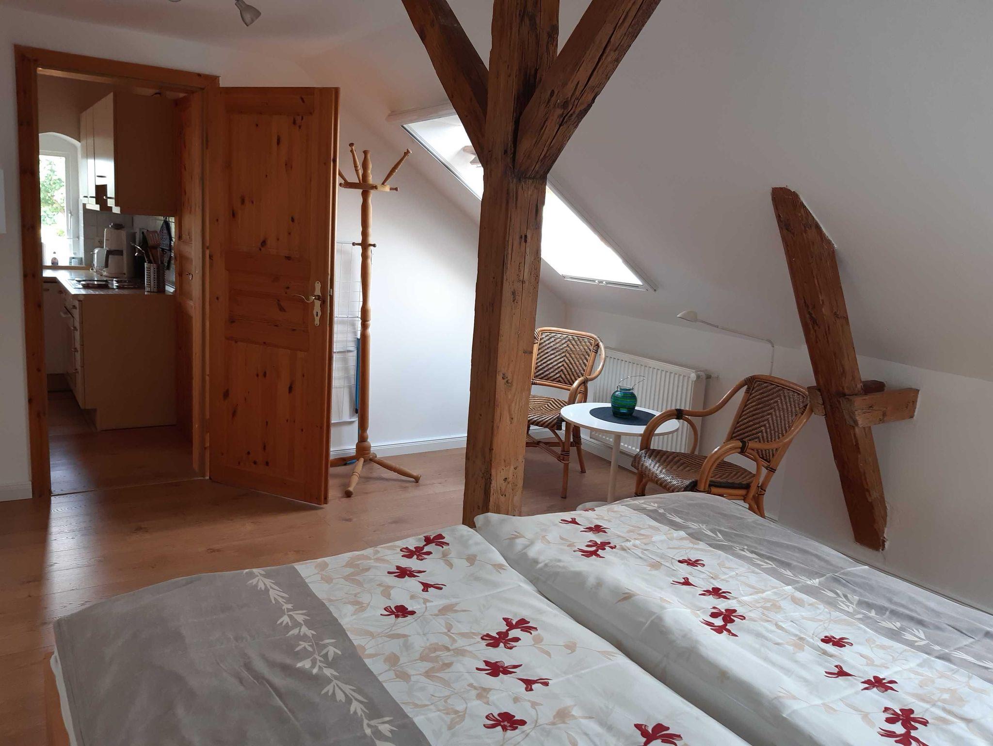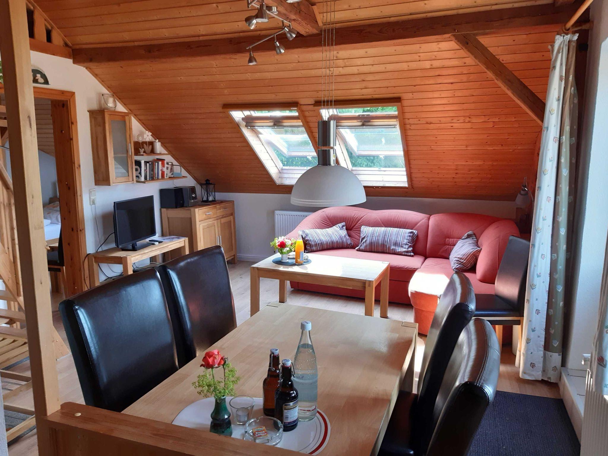 Die Ferienwohnung Vossberg für bis zu 4 Personen (2 Erwachsene und 2 Kinder bis 14 Jahren) befindet sich im Obergeschoss und ist über eine Außentreppe zu erreichen. Freiliegende Hollzbalken und eine Holzdecke schaffen ein behagliches Ambiente.