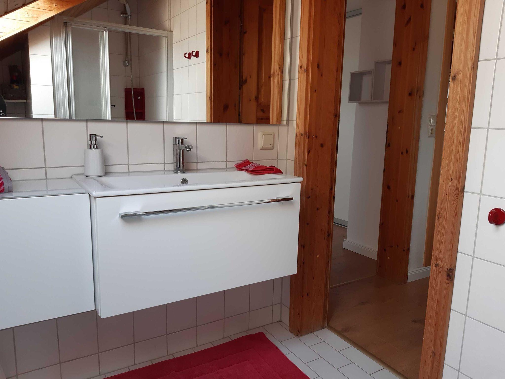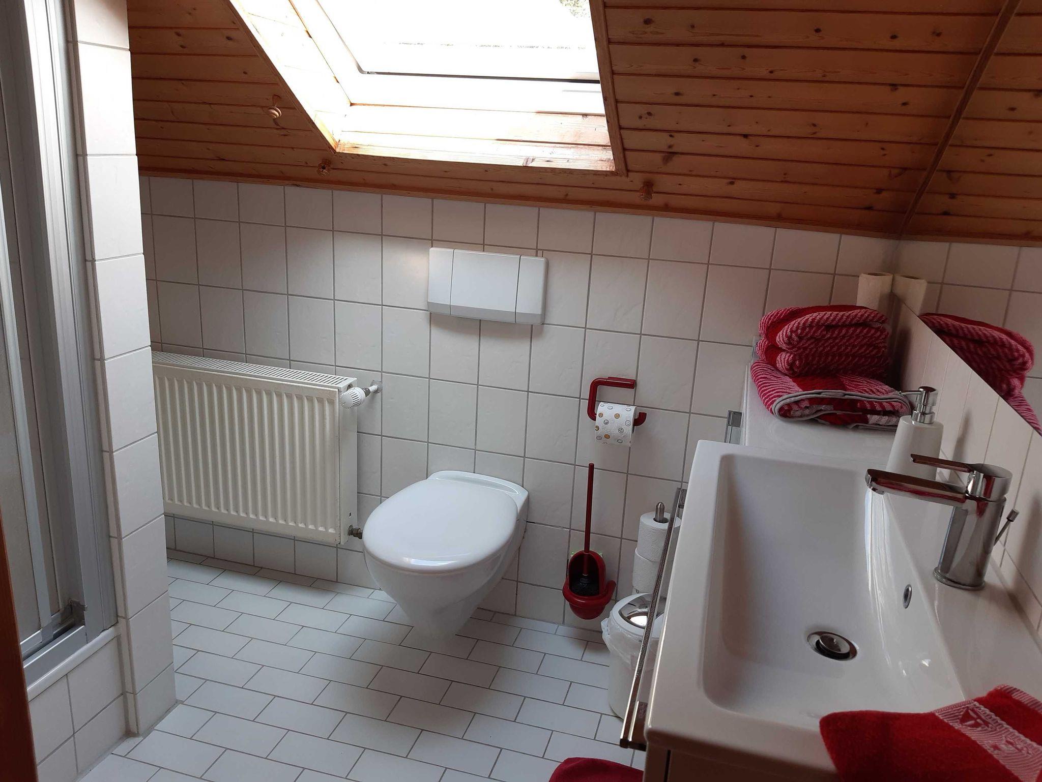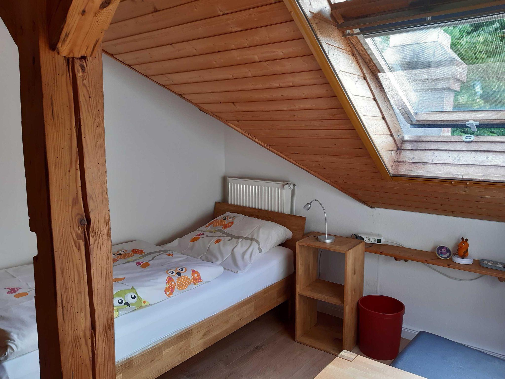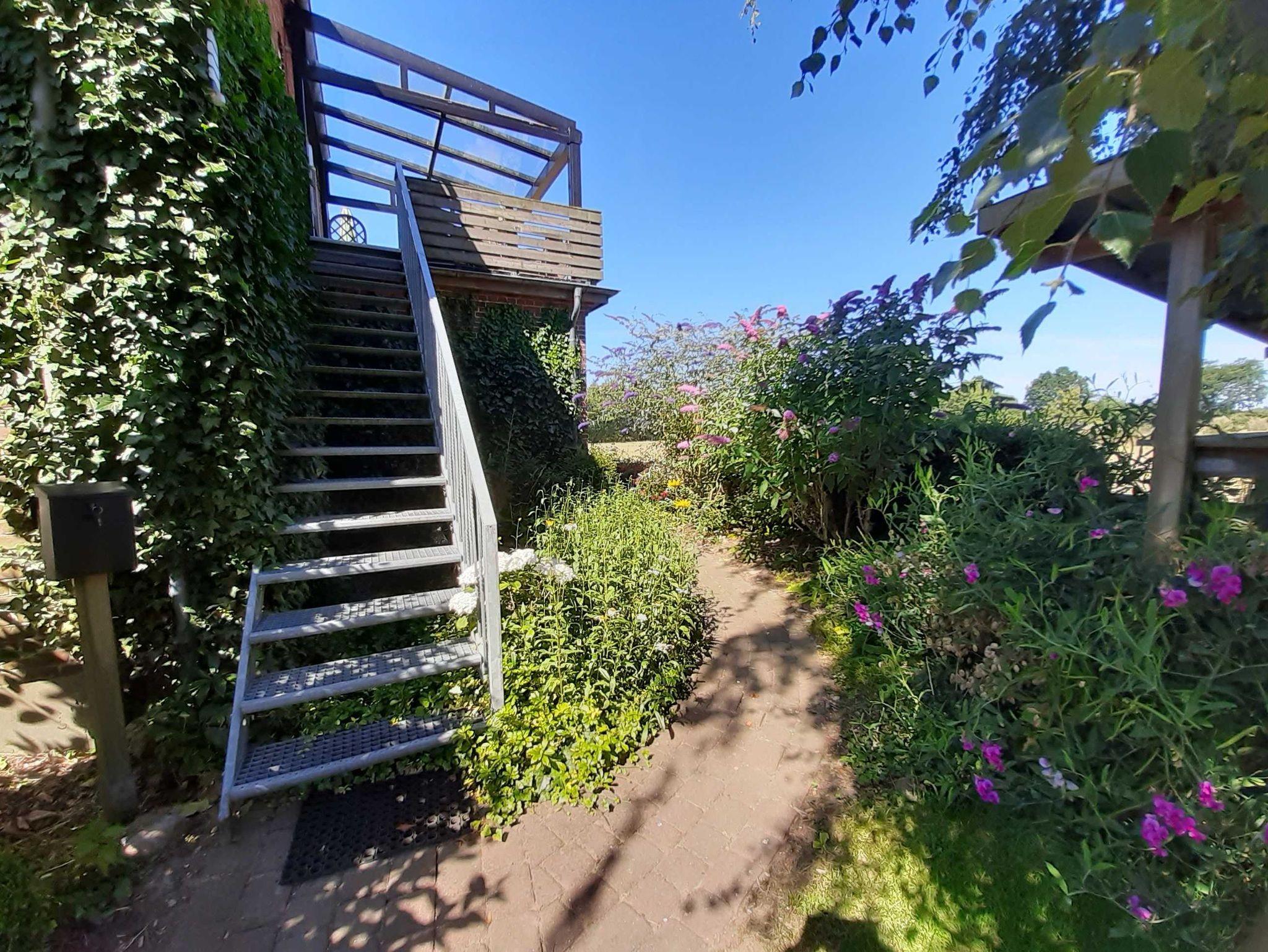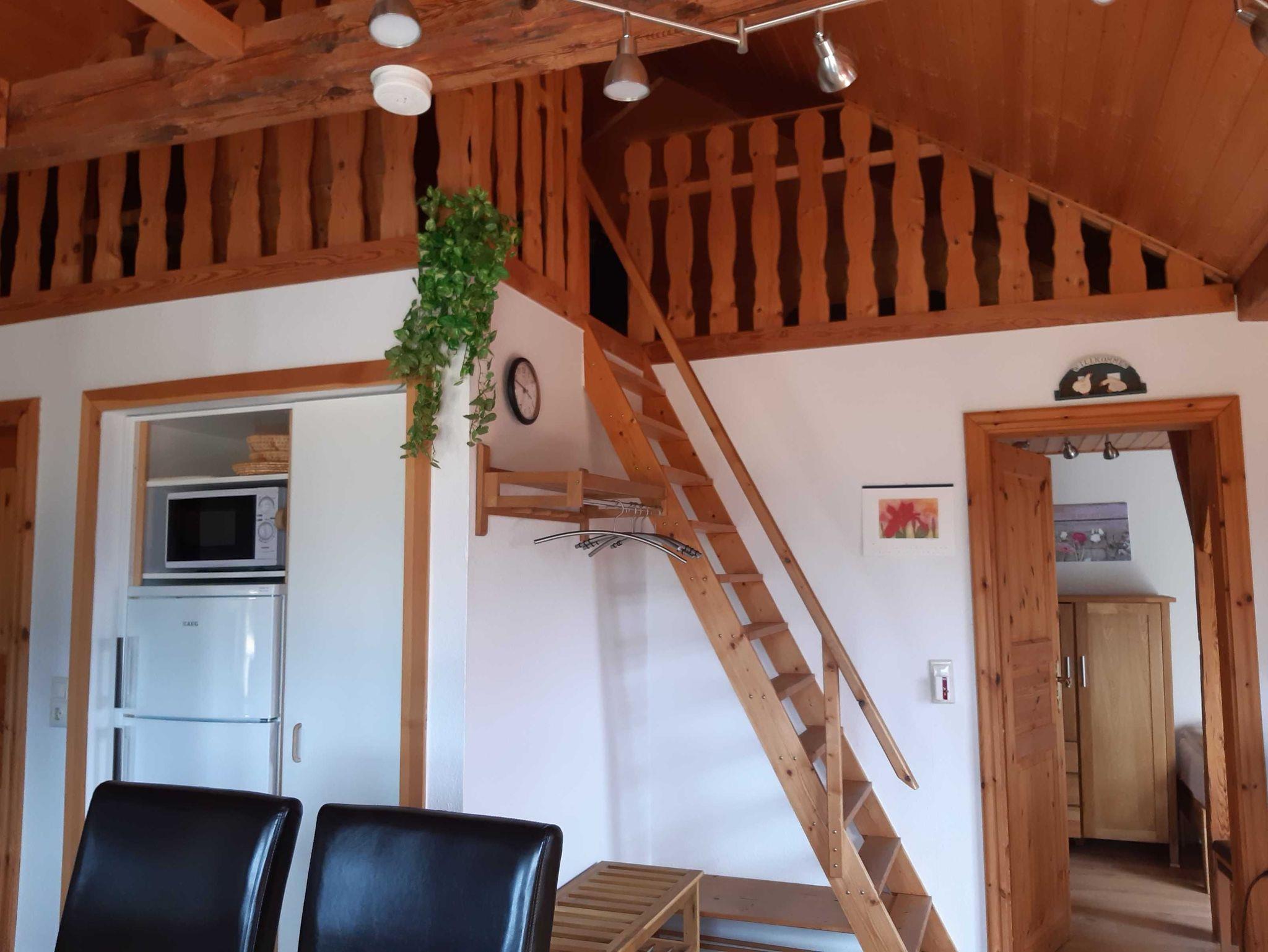 Die Ferienwohnung Vossberg für bis zu 4 Personen (2 Erwachsene und 2 Kinder bis 14 Jahren) befindet sich im Obergeschoss und ist über eine Außentreppe zu erreichen. Freiliegende Hollzbalken und eine Holzdecke schaffen ein behagliches Ambiente.