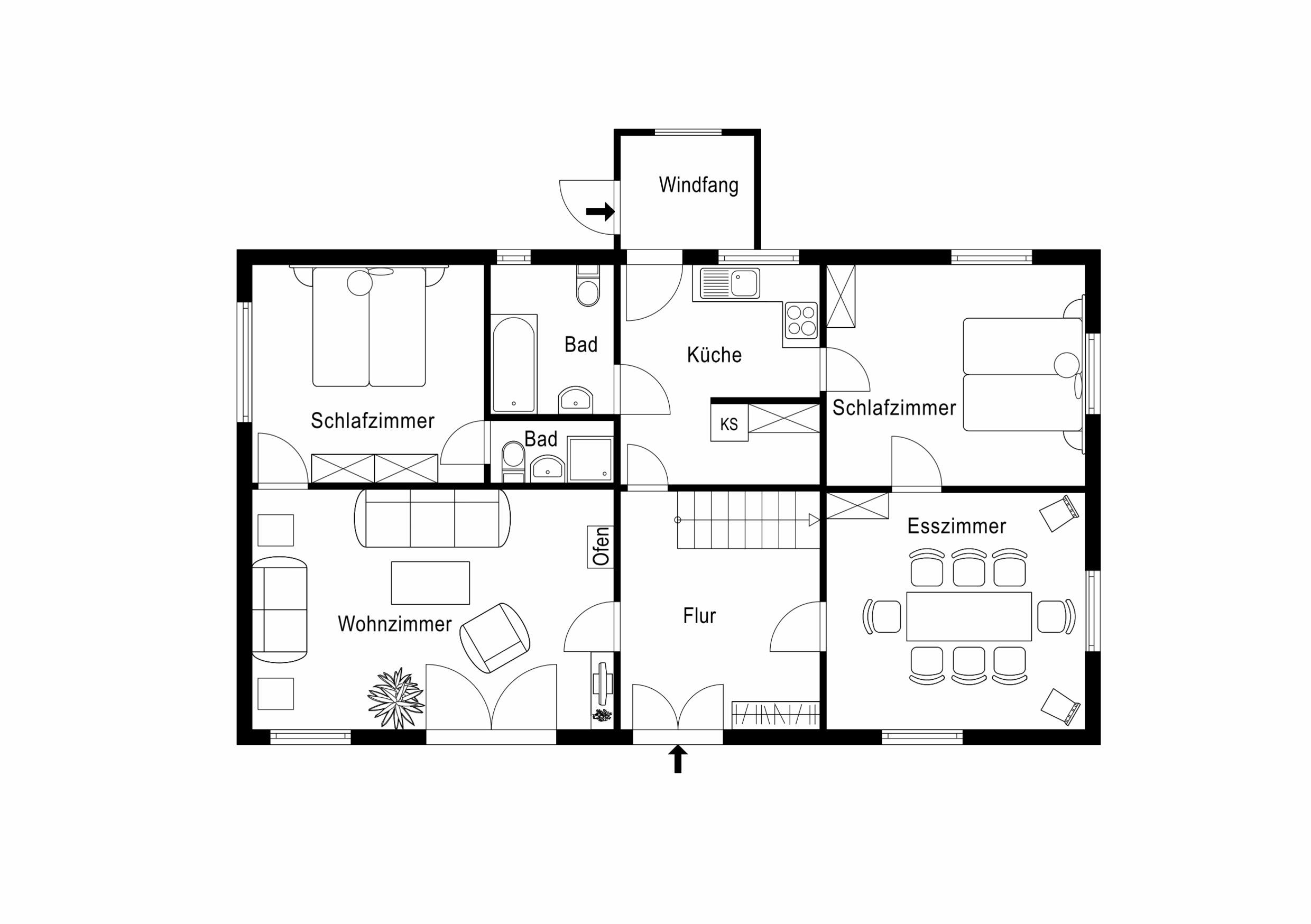 EG: großes Wohnzimmer mit Kaminofen und Zugang zu Terrasse und Garten, Esszimmer, Küche, zwei Bäder (eines ensuite zu einem Doppelschlafzimmer mit Dusche, eines mit Duschbadewanne), zwei Doppelschlafzimmer