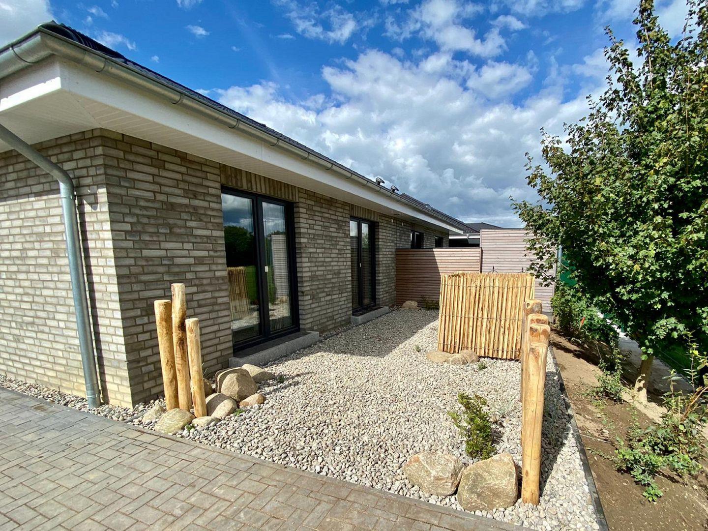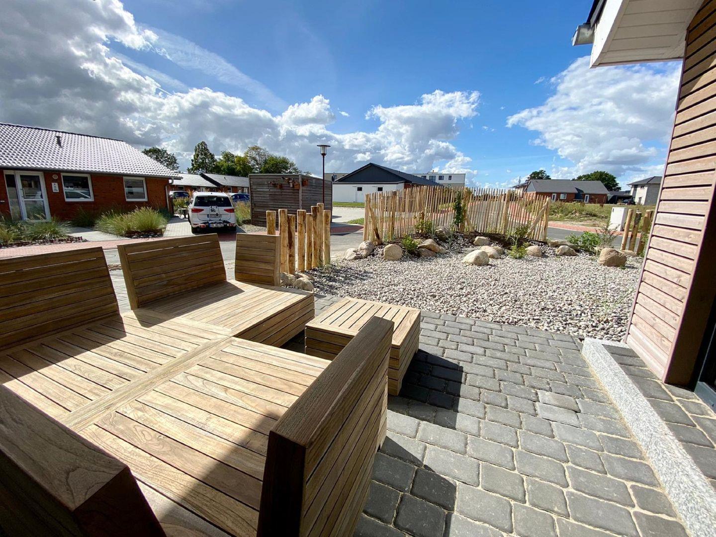 Moderne Doppelhaushälfte Sandpiper in Gelting mit Terrasse, Garten und maritimem dänischem Stil.