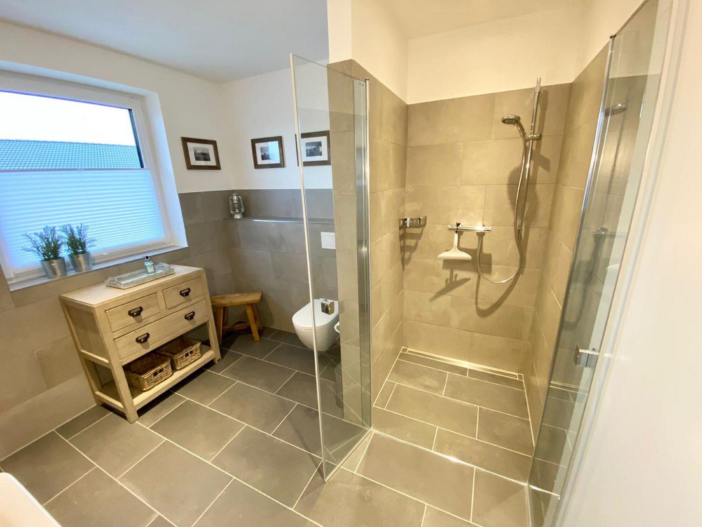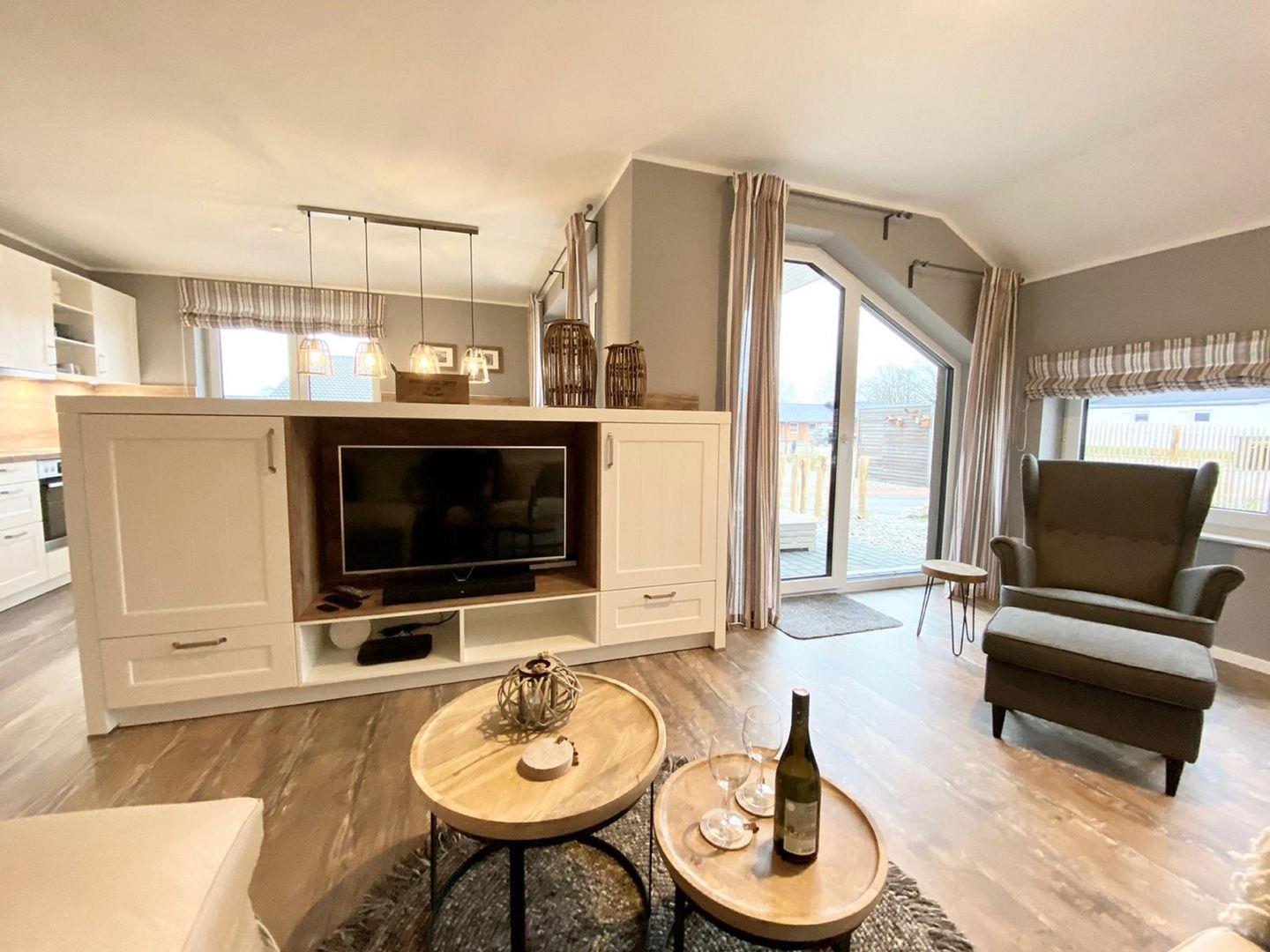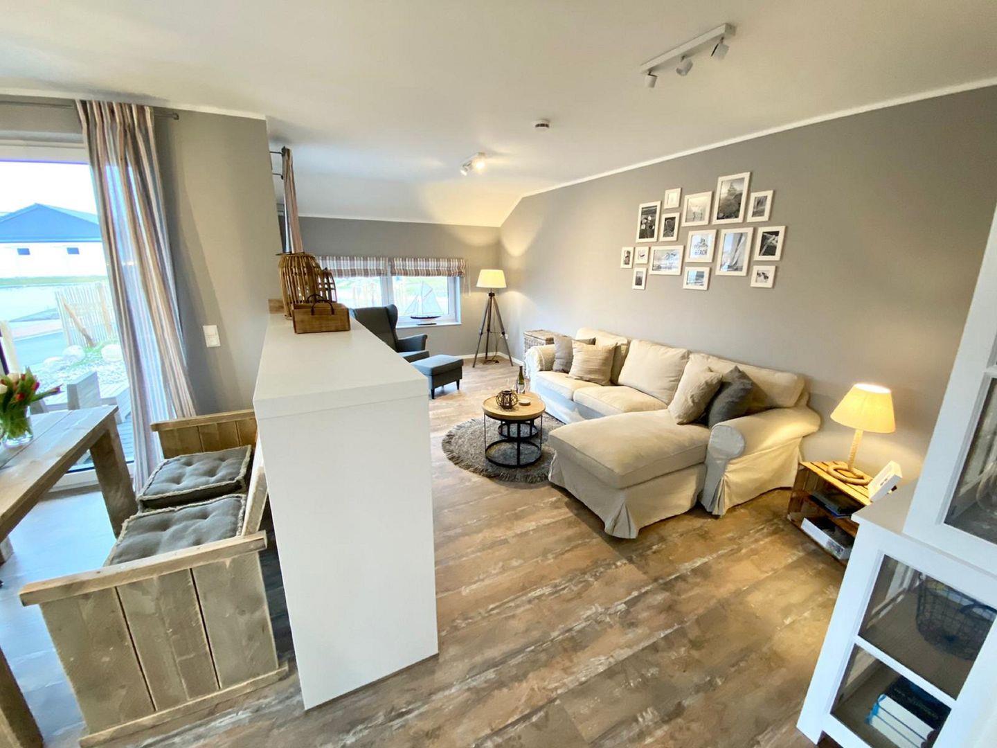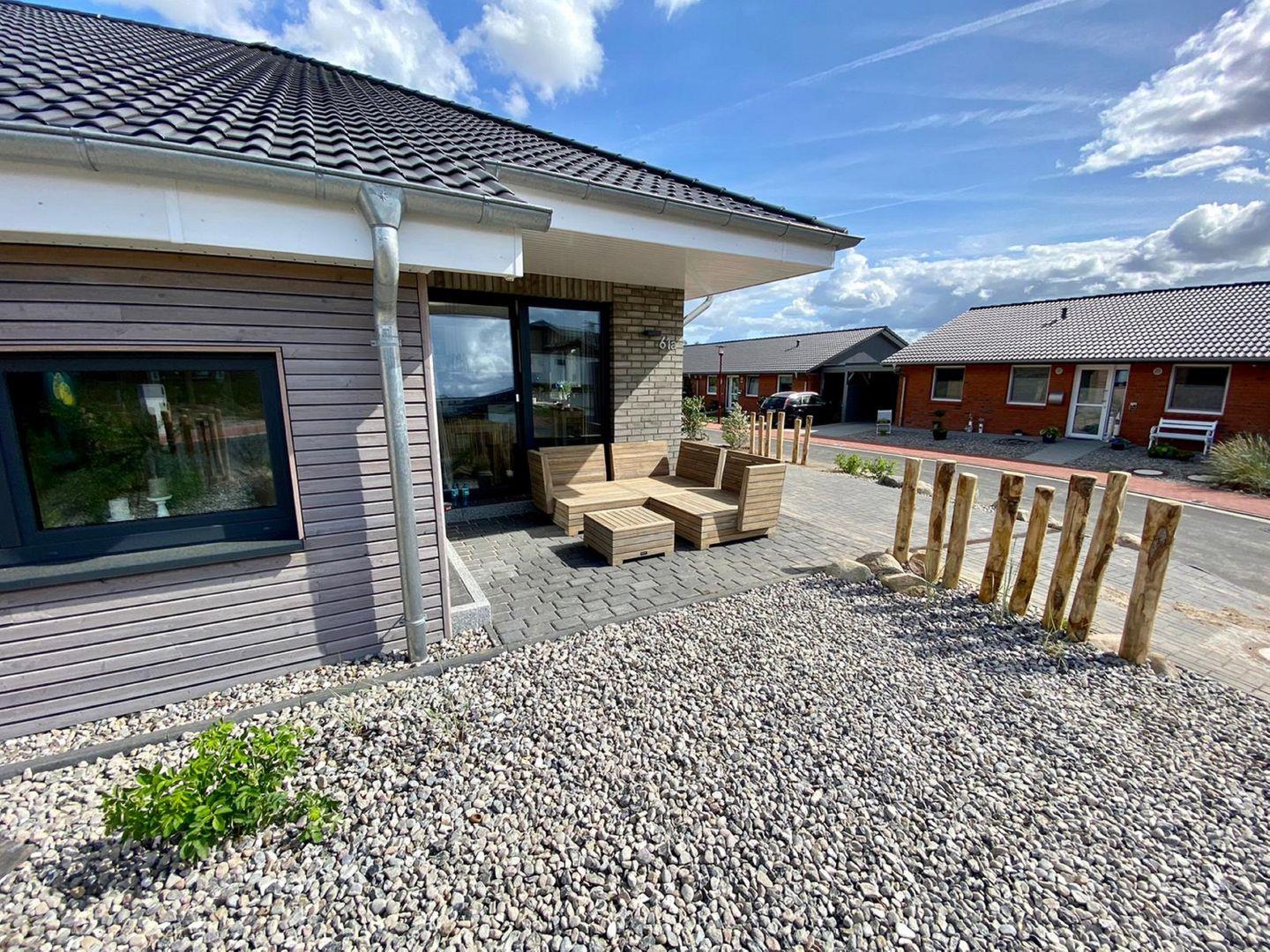 Die Doppelhaushälfte ist ebenerdig und sehr modern und im maritimen, dänischen Stil eingerichtet. Die vollausgestattete Küche mit Essbereich ist offen zum gemütlichen Wohnbereich. Die 2 Schlafzimmer sind jeweils mit einem Doppelbett eingerichtet. Das Badezimmer bietet eine ebenerdige Dusche. Ein Gäste-WC ist vorhanden. Auf der Terrasse befindet sich eine Lounge Ecke. Im Garten gibt es eine Gartenhütte, in der mitgebrachte Fahrräder untergestellt werden können. Vor dem Haus sind PKW-Stellplätze.