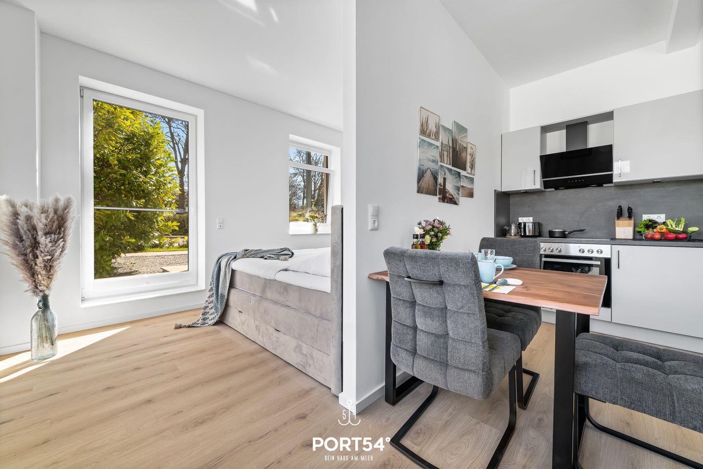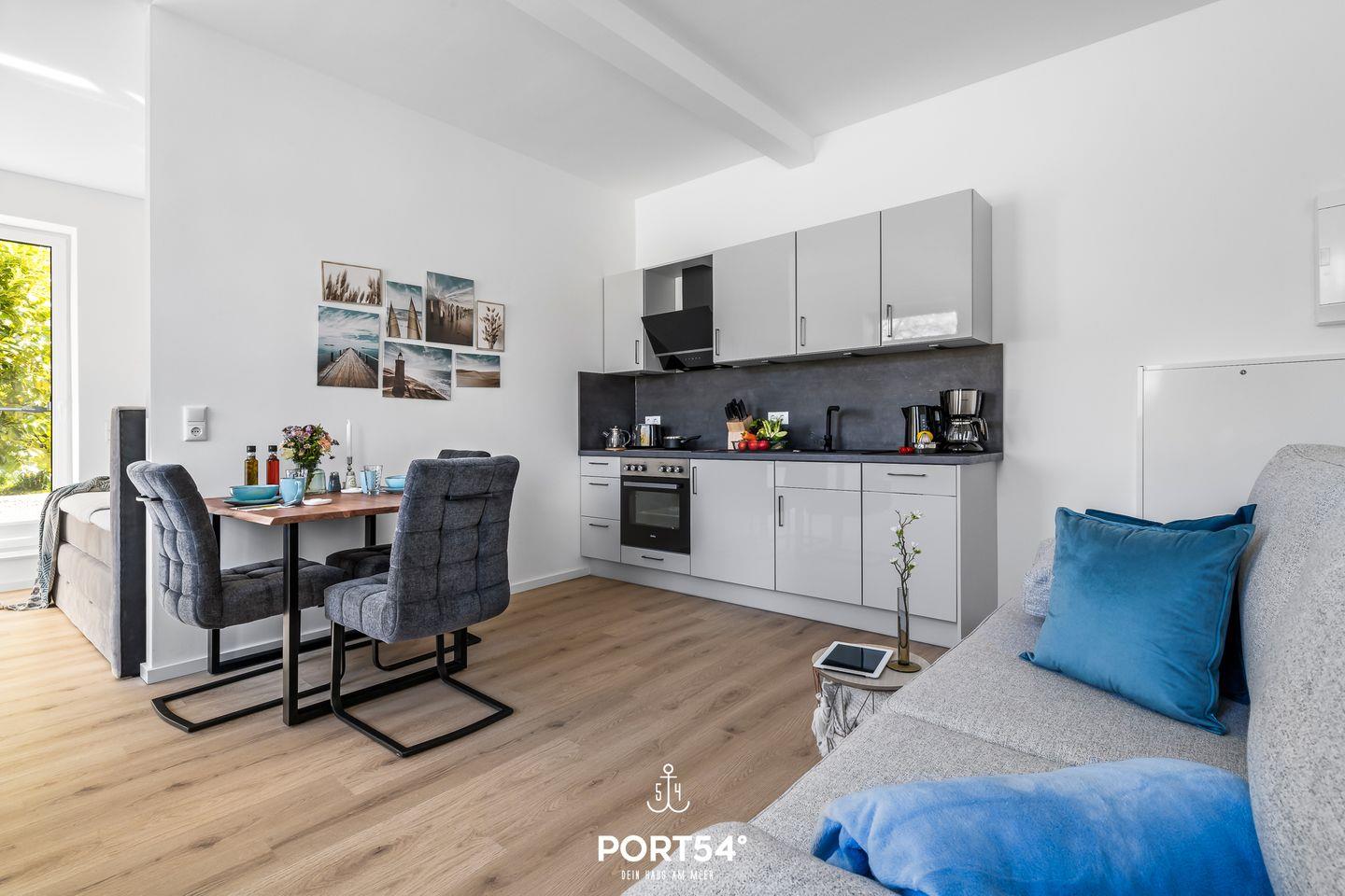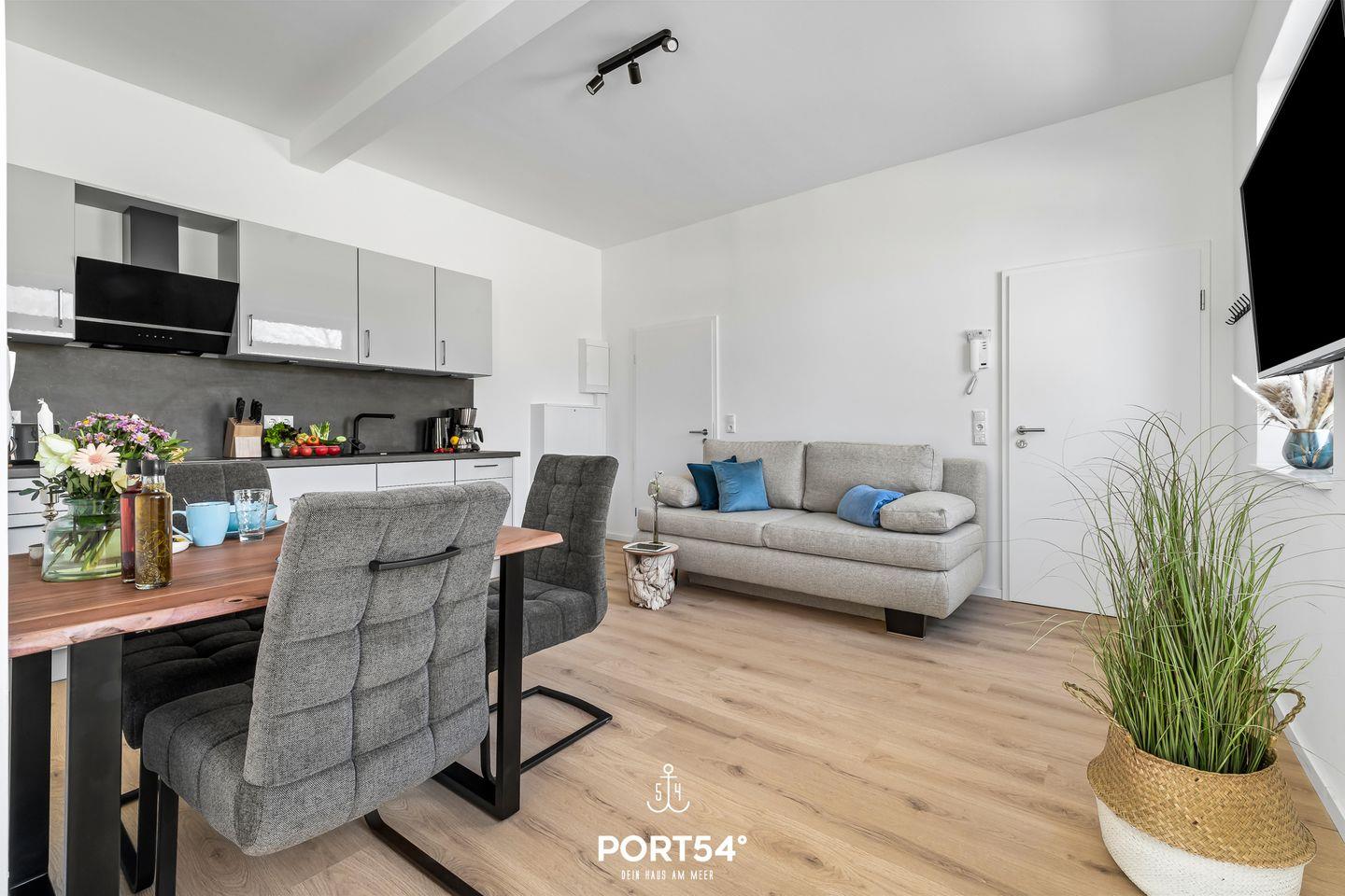 Die kernsanierte Ferienwohnung "Strandgut" bietet auf 37m² einen offenen Wohnbereich mit integrierter Küchenzeile und Essbereich, ein offen gestaltetes Schlafzimmer und ein Duschbad. Vom Wohnbereich aus lässt sich die möblierte Terrasse in Ost-Ausrichtung betreten und ab dem frühen Morgen die Sonne genießen. Im Schlafbereich steht ein Boxspring-Doppelbett. Zwei weitere Schlafplätze bietet die gemütliche Schlafcouch. Am Haus befindet sich ein gemeinschaftlicher Abstellraum für Fahrräder.