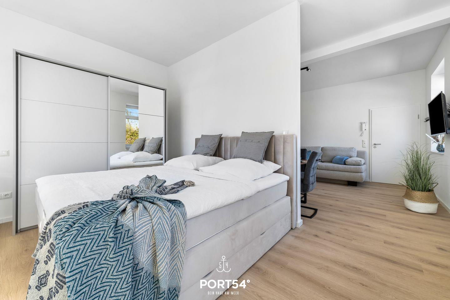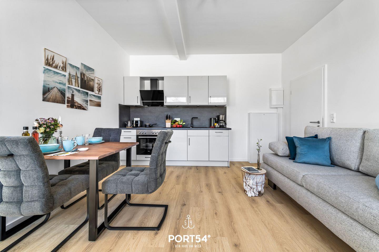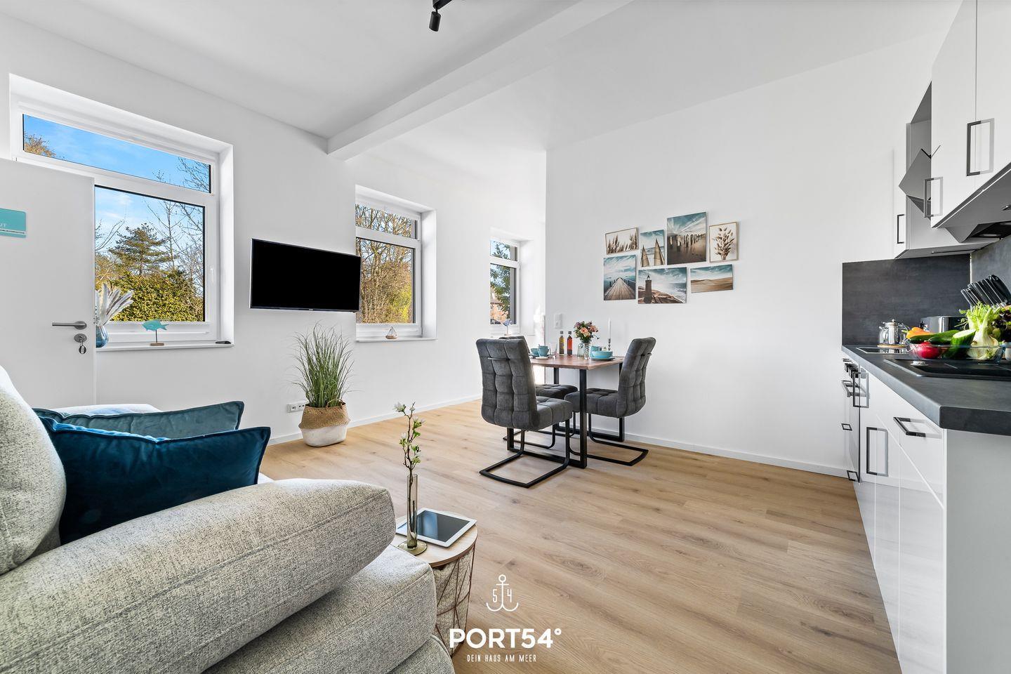 Die kernsanierte Ferienwohnung "Strandgut" bietet auf 37m² einen offenen Wohnbereich mit integrierter Küchenzeile und Essbereich, ein offen gestaltetes Schlafzimmer und ein Duschbad. Vom Wohnbereich aus lässt sich die möblierte Terrasse in Ost-Ausrichtung betreten und ab dem frühen Morgen die Sonne genießen. Im Schlafbereich steht ein Boxspring-Doppelbett. Zwei weitere Schlafplätze bietet die gemütliche Schlafcouch. Am Haus befindet sich ein gemeinschaftlicher Abstellraum für Fahrräder.