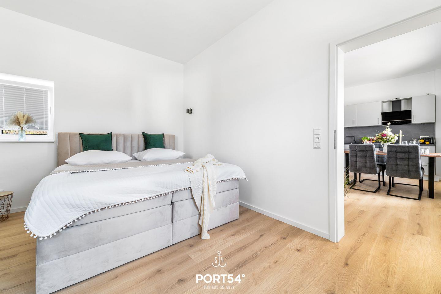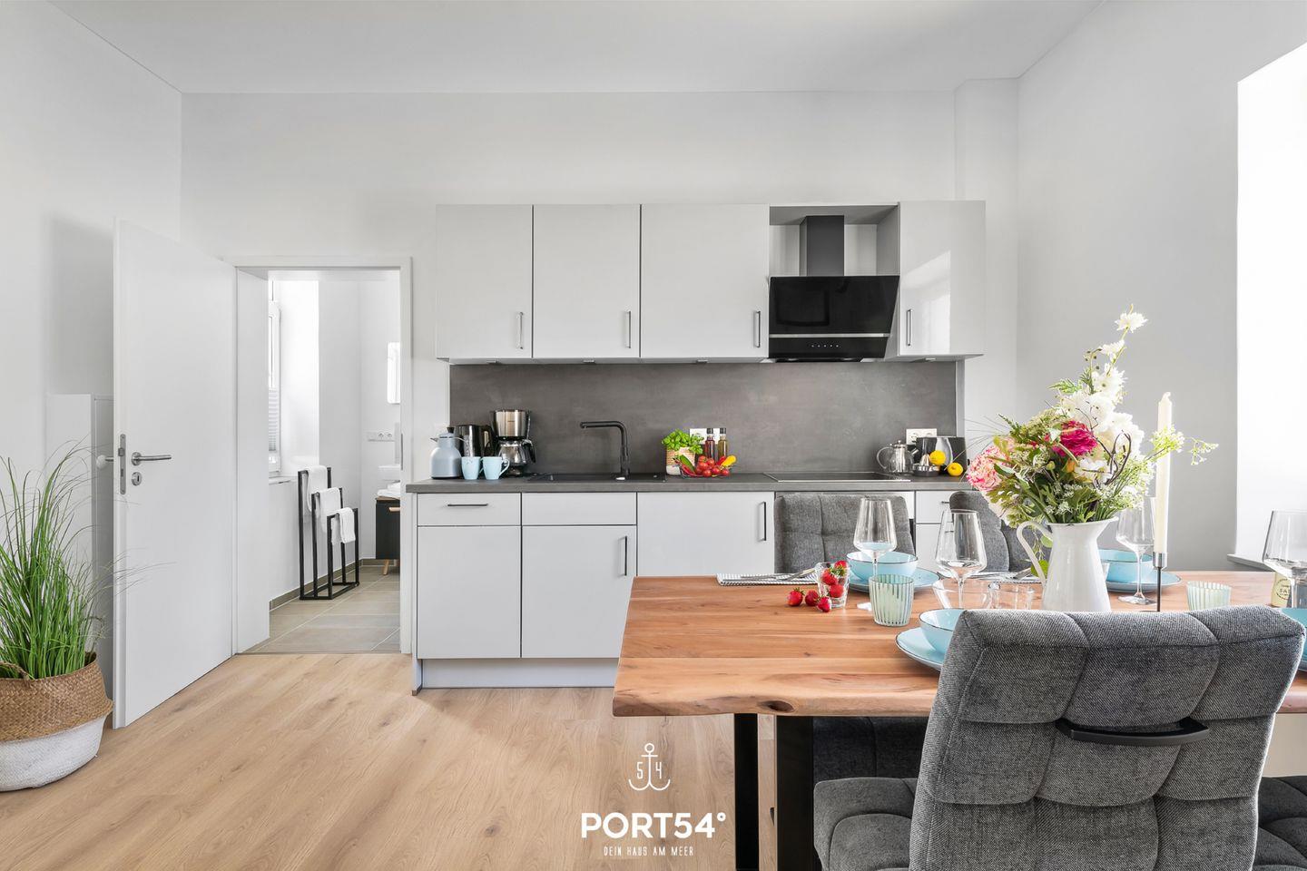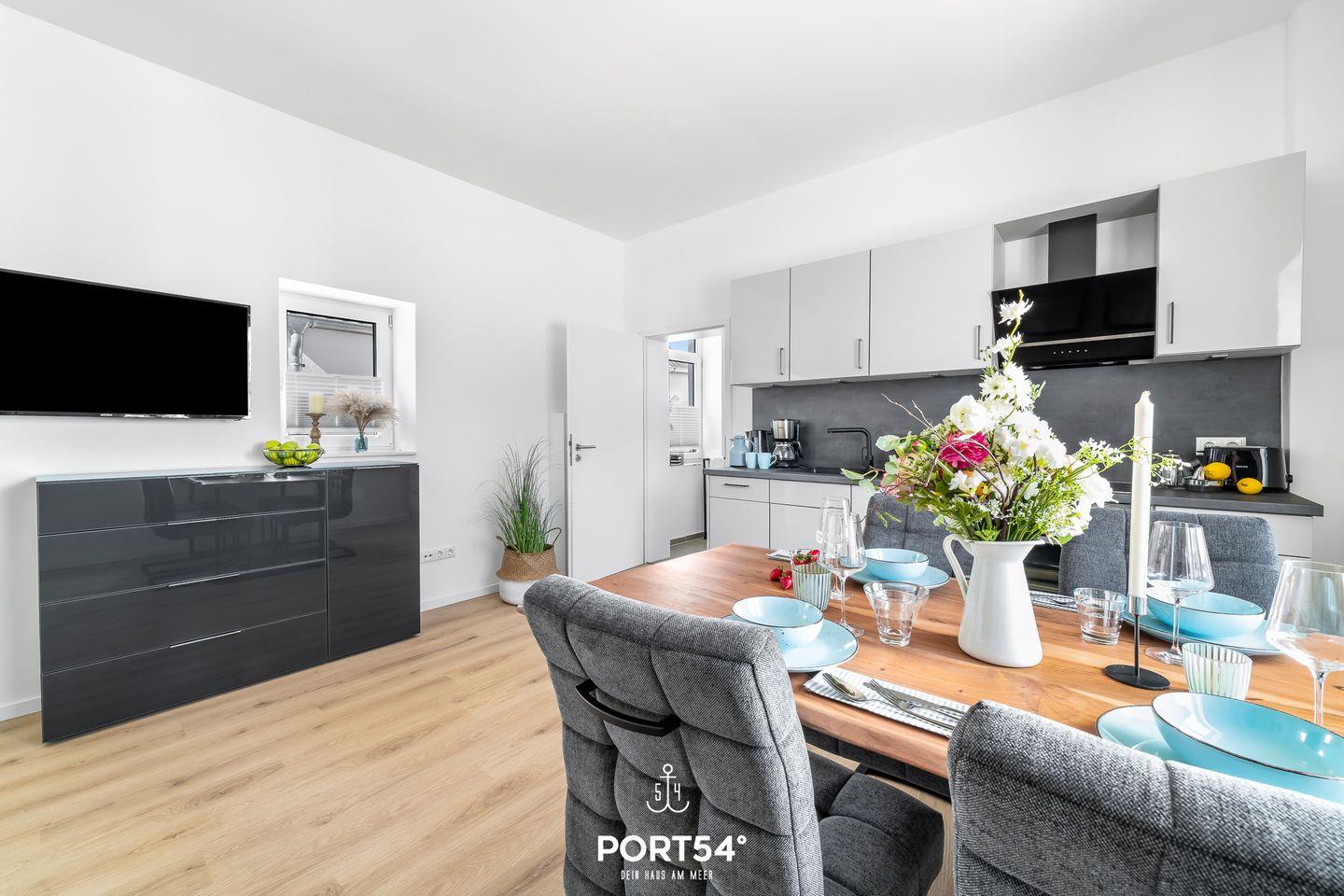 Die kernsanierte Ferienwohnung "Strandmuschel" bietet auf 43m² einen offenen Wohnbereich mit integrierter Küchenzeile und Schlafsofa, ein offen gestaltetes Schlafzimmer und ein Duschbad. Vom Wohnbereich aus lässt sich die möblierte Terrasse betreten. Laue Sommerabende lassen sich hier perfekt am Elektrogrill verbringen. Am Haus befindet sich ein gemeinschaftlicher Abstellraum für Fahrräder.