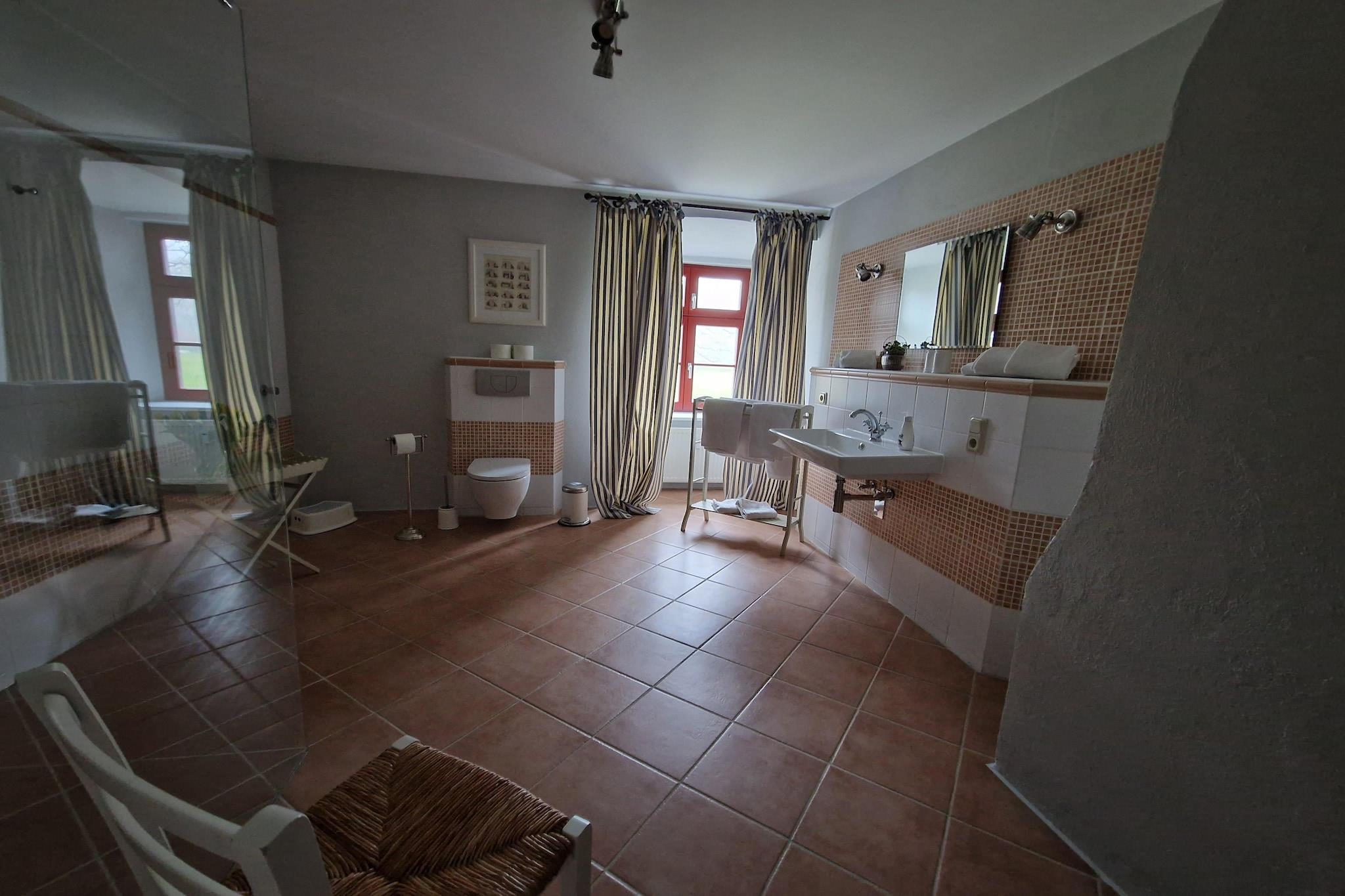 Umgeben von der ruhigen Landschaft von Gerdshagen bietet diese charmante Erdgeschosswohnung einen erholsamen Rückzugsort für bis zu vier Gäste. Mit zwei Doppelzimmern, zwei Klappbetten und liebevollen Details wie einem Kinderbett und einem Hochstuhl ist sie ideal für Familien. Die voll ausgestattete Küche, Sat-TV und WLAN sorgen für Komfort, während das gemeinschaftliche Kaminzimmer, der angelegte Garten und die Terrasse mit Grill zum Entspannen im Freien einladen. Kinder werden das Trampolin, den Sandkasten, die Spielgeräte und die Tischtennisplatte lieben, während Erwachsene in der Hängematte entspannen oder eine Partie Tischfußball spielen können. Der Ostseestrand ist nur 22 km entfernt, und Tagesausflüge nach Rostock (31 km) oder Wismar (39 km) bieten kulturellen Charme und Küstenflair. Für lokale Spezialitäten speisen Sie im Gasthaus Lütten-Klein und genießen herzhafte norddeutsche Küche. Oder erkunden Sie das historische Herrenhaus Gerdshagen, ein Renaissancejuwel mit jahrhundertealten Bäumen und saisonalen Veranstaltungen. Ob Sie durch die Wiesen radeln oder im Garten grillen, dieser Aufenthalt in Gerdshagen verbindet rustikalen Charme mit familienfreundlichem Spaß.