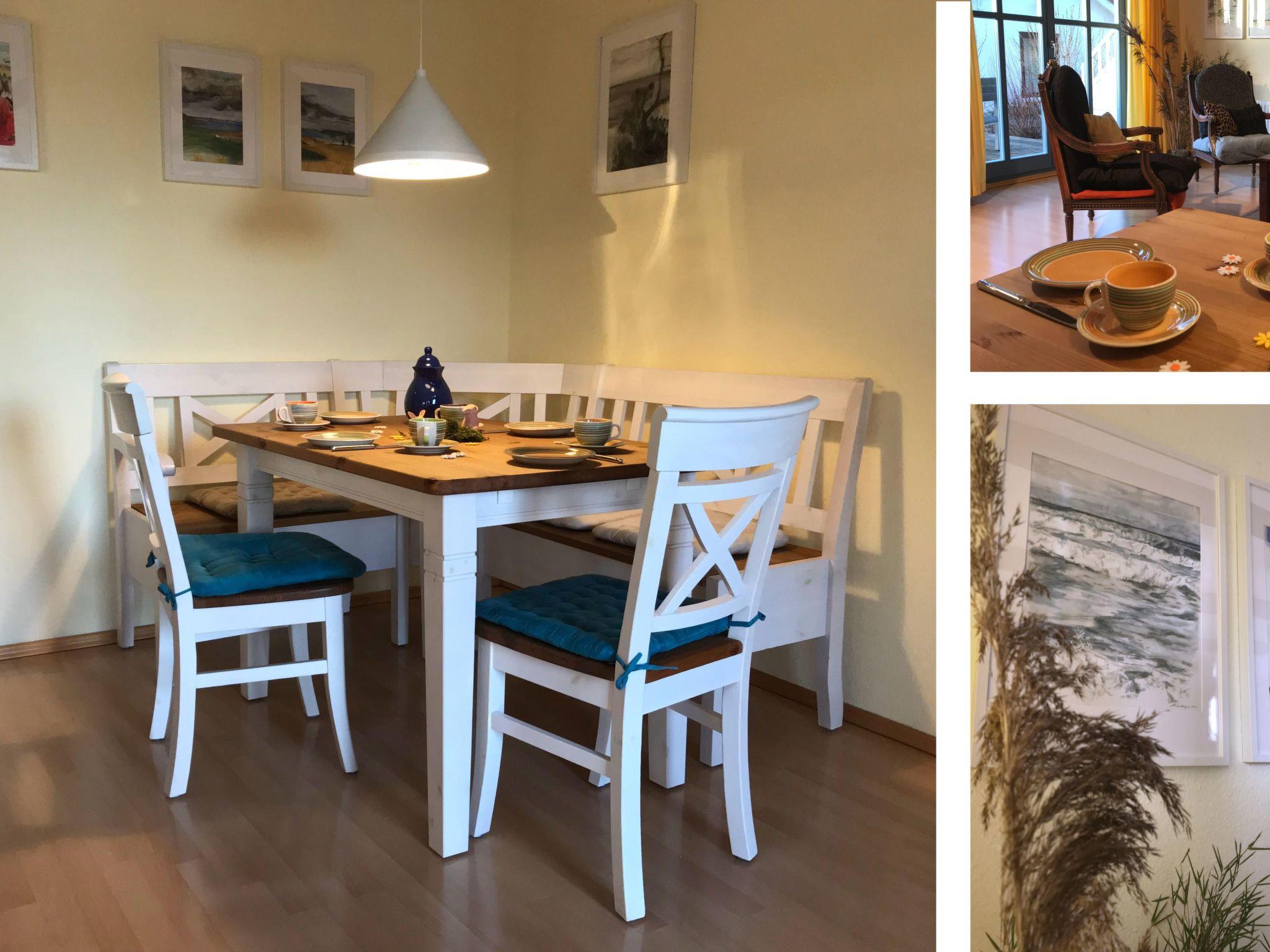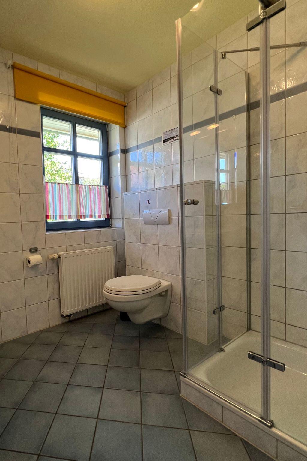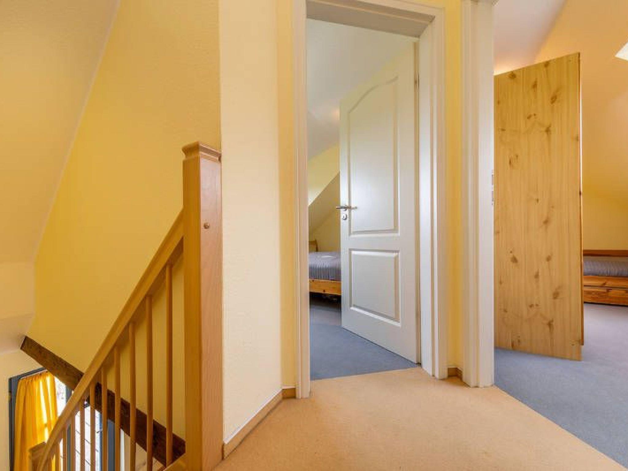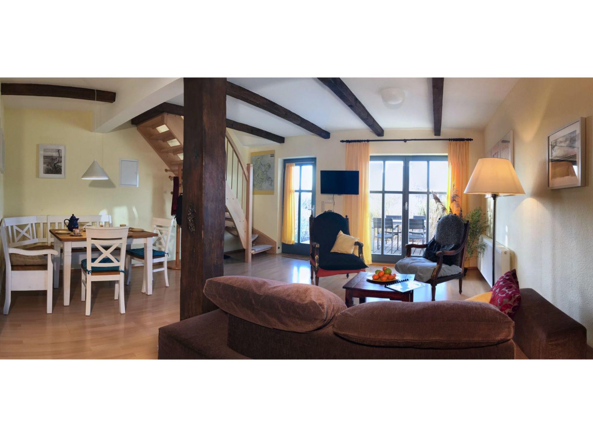 Das Ferienhaus ist etwa 61m² groß und hat 2 Etagen. In der oberen befinden sich zwei Schlafzimmer, eines mit Doppelbett und Kinderreisebett und eines mit zwei Einzelbetten (teils als Aufbettung ausziehbar). Das Erdgeschoß besticht mit historischem Balkenwerk. Der offen gestaltete Wohnbereich mit Schlafcouch (Aufbettung für die 5. Pers., TV-Flatscreen, WLAN), Essbereich (6Pers.) und offener Küche (Herd, Backofen, Kühlschrank/Gefrierfach, Geschirrspüler, Kaffeemaschine, Toaster) wirkt durch die große Fensterfront zum Garten wirklich großzügig. Das Bad/WC mit Duschkabine verfügt über ein Fenster zur Straßenseite. Bettwäsche (Abrechnung pro Person/Aufenthalt) und/oder Handtücher (Abrechnung pro Person/Aufenthalt) können dazu gebucht werden. Die Kosten überweisen Sie direkt an den Vermieter. Die Terrasse ist mit wetterfesten Gartenmöbeln ausgestattet (Polster im OG). Zu jeder Wohnung gehört ein eigener Parkplatz vorm Haus. Im Fahrradraum, der allen Gästen zur Verfügung steht, können nicht nur Fahrräder eingeschlossen, sondern auch weitere Gartenmöbel ausgeliehen werden, ebenso wie Kinderhochstülhe und Spielsachen. Bitte achten Sie in der Hauptsaison auf die Mindestbuchung von 5 Nächten. Lückenbuchungen ab 2 Nächten sind auf Anfrage möglich.
