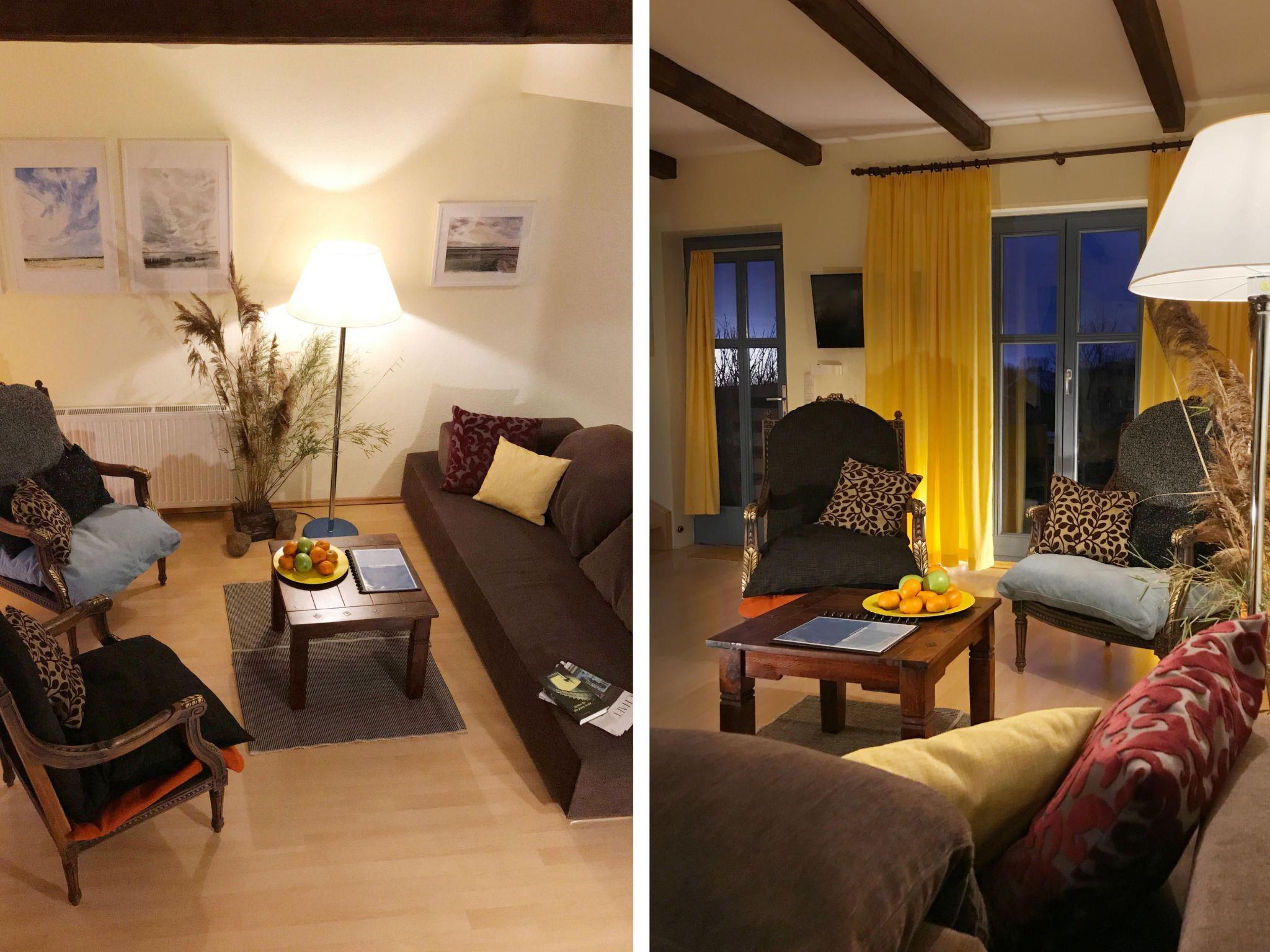 Wenn Sie mal nicht selbst kochen mögen, sorgt die sehr gute Küche (mediterran angehaucht, deutsch) des "Wirtshauses Neuenkirchen" auch kulinarisch für Entspannung. Für den täglichen Bedarf ist der Einkauf im Kaufmannsladen (Brötchen außer Sonntag) schräg gegenüber wie eine kleine Zeitreise in eine heile Welt. Beides erreichen sich in ca. 50 m Entfernung. Leckerste Steaks, kaufen Sie am Besten im Hofladen „Wild und Rind" am Anfang der Dorfstraße. Ebenfalls fußläufig ist der kleine, hübsche Sandstrand zum Plantschen oder abendliche Abkühlung im Lebbiner Bodden empfohlen, ca. 20 Min. direkt an der ehemaligen Kulisse der Robbenstation von "Hallo Robbie". Robben werden Sie hier eher nicht antreffen, aber sauberes Bodden-Wasser, da je nach Wetterlage ein starker Wasseraustausch zwischen Ostsee und den Bodden zirkuliert. Der Hausberg von Neuenkirchen ist der "Hoch Hilgor". Wanderung ca. 25 Min. von der Ferienanlage entfernt. Vom Aussichtsturm haben Sie einen fantastisches Rundumblick über die Insel und bei ganz klarer Sicht bis nach Dänemark zum Møns Klint.