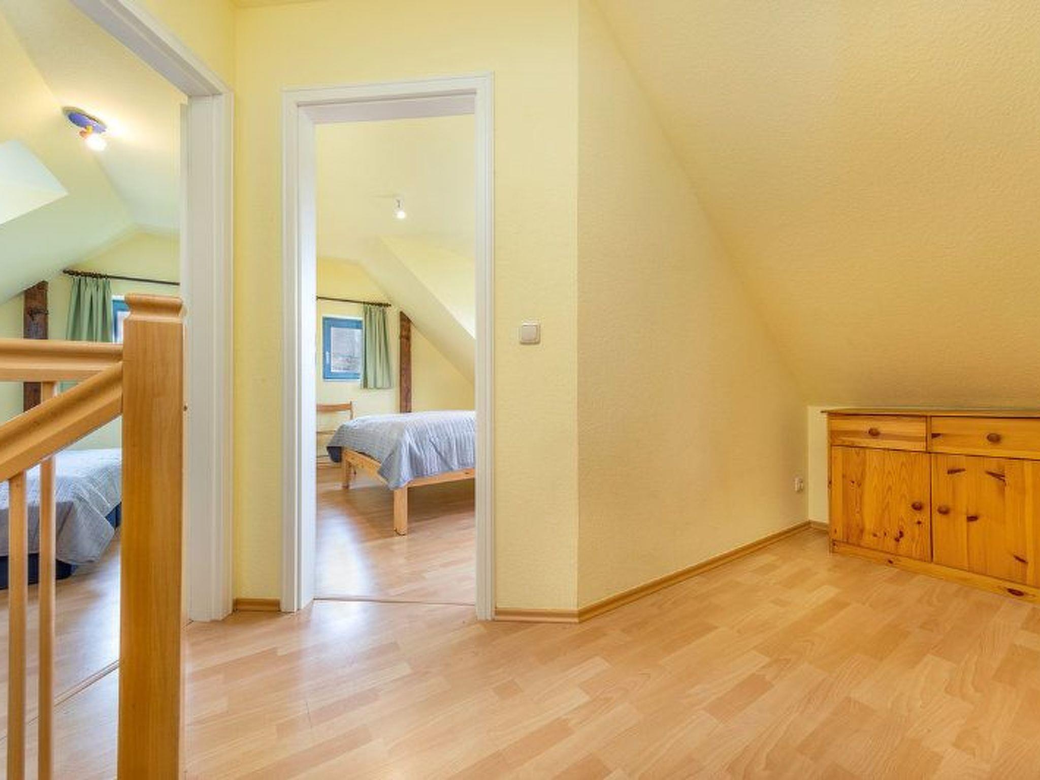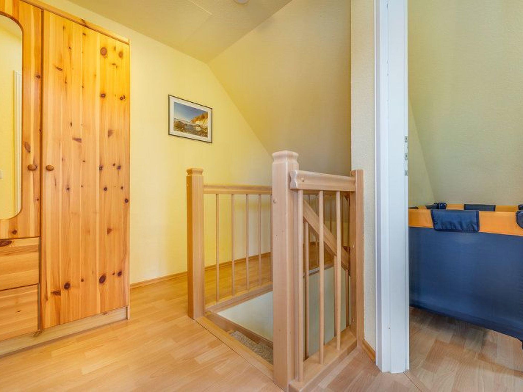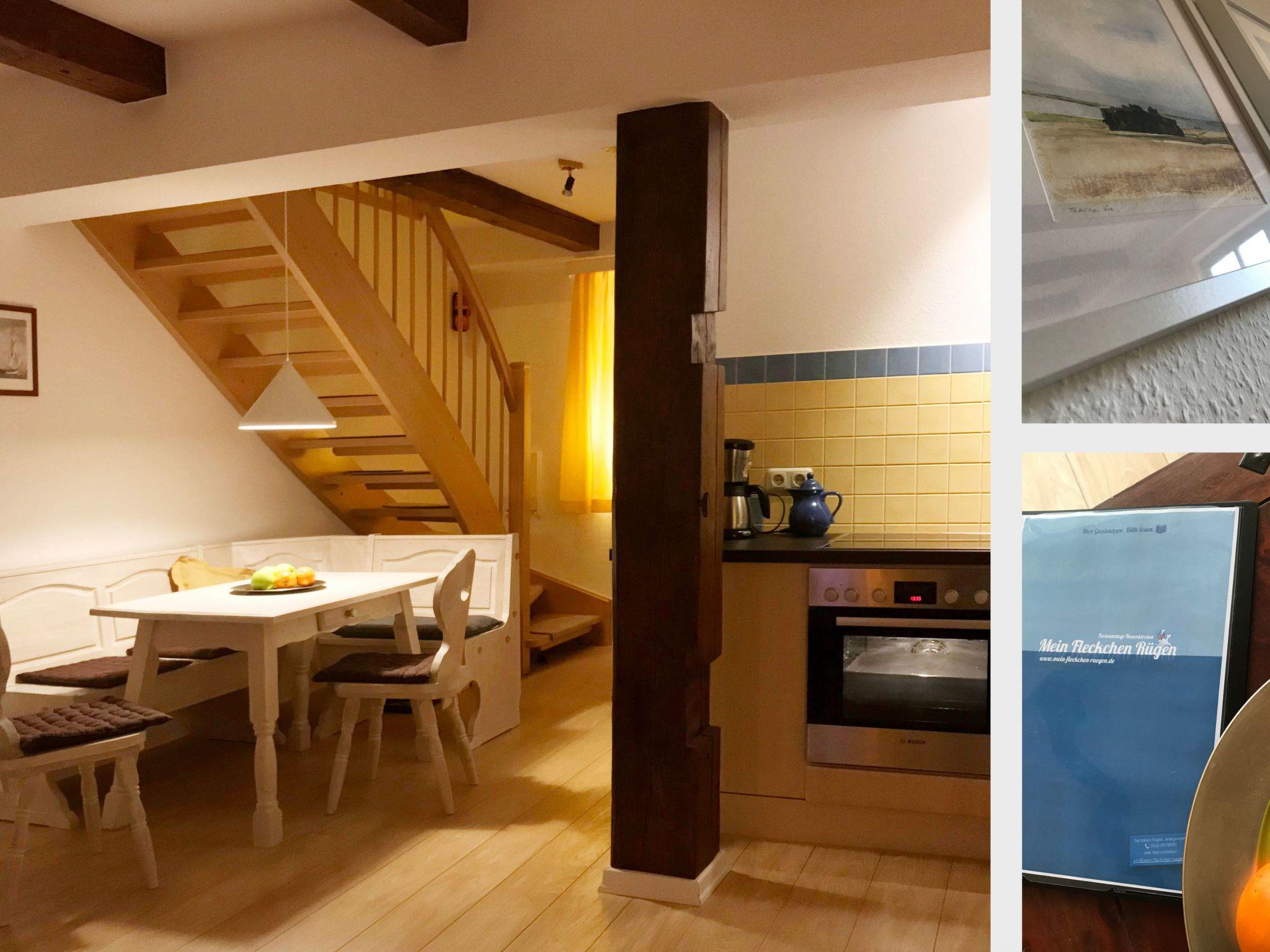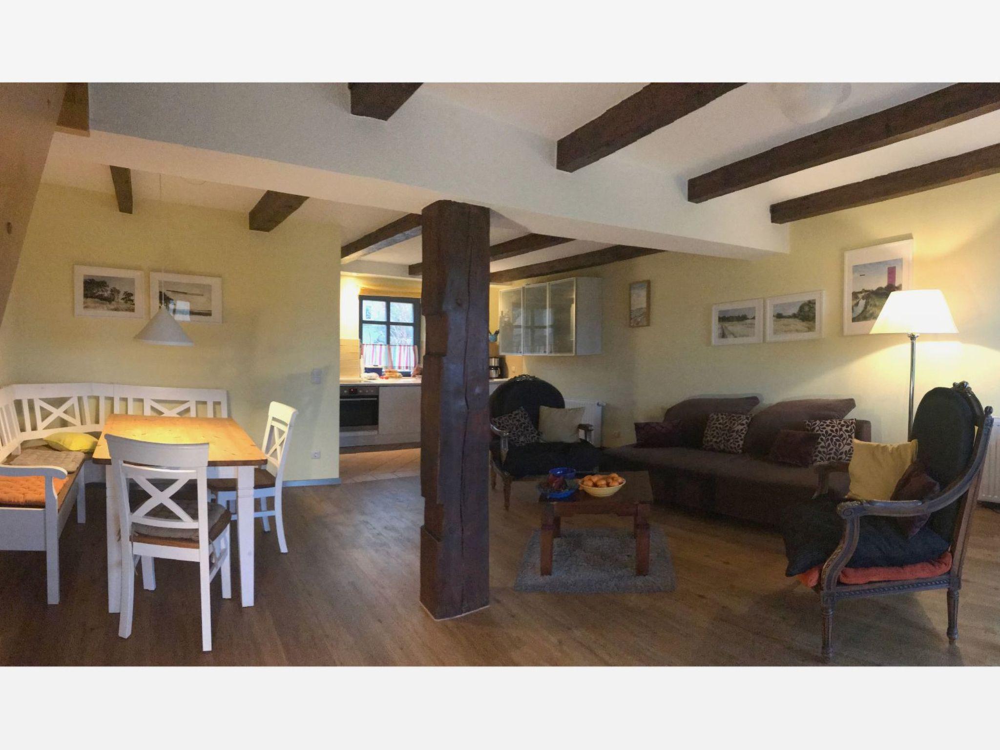 Das Ferienhaus ist etwa 61m² groß und hat 2 Etagen. In der oberen befinden sich zwei Schlafzimmer, eines mit Doppelbett und Kinderreisebett und eines mit zwei Einzelbetten (teils als Aufbettung ausziehbar). Das Erdgeschoss besticht mit historischem Balkenwerk. Der offen gestaltete Wohnbereich mit Schlafcouch (Aufbettung für die 5. Pers., TV-Flatscreen, WLAN), Essbereich (6Pers.) und offener Küche (Herd, Backofen, Kühlschrank/Gefrierfach, Geschirrspüler, Kaffeemaschine, Toaster) wirkt durch die große Fensterfront zum Garten wirklich großzügig. Das Bad/WC mit Duschkabine verfügt über ein Fenster zur Straßenseite. Bettwäsche (Abrechnung pro Person/Aufenthalt) und/oder Handtücher (Abrechnung pro Person/Aufenthalt) können dazu gebucht werden. Die Kosten überweisen Sie direkt an den Vermieter. Die Terrasse ist mit wetterfesten Gartenmöbeln ausgestattet (Polster im OG). Zu jeder Wohnung gehört ein eigener kostenloser Parkplatz vorm Haus. Im Fahrradraum, der allen Gästen zur Verfügung steht, können nicht nur Fahrräder eingeschlossen, sondern auch weitere Gartenmöbel ausgeliehen werden, ebenso wie Kinderhochstühle und jede Menge Spielsachen. Bitte achten Sie in der Hauptsaison auf die Mindestbuchung von 5 Nächten. Lückenbuchungen ab 2 Nächten sind auf Anfrage möglich.