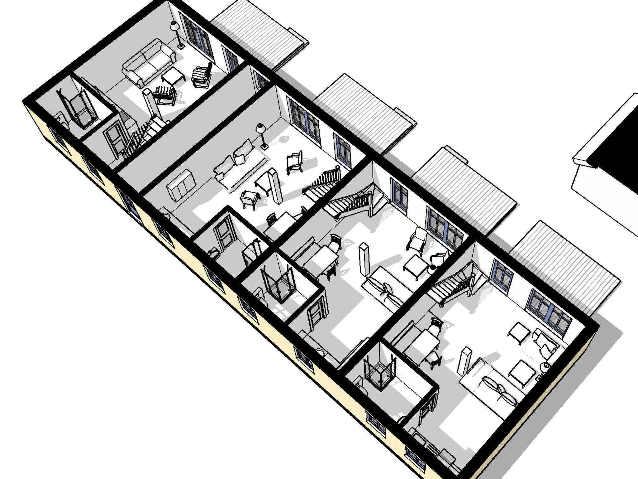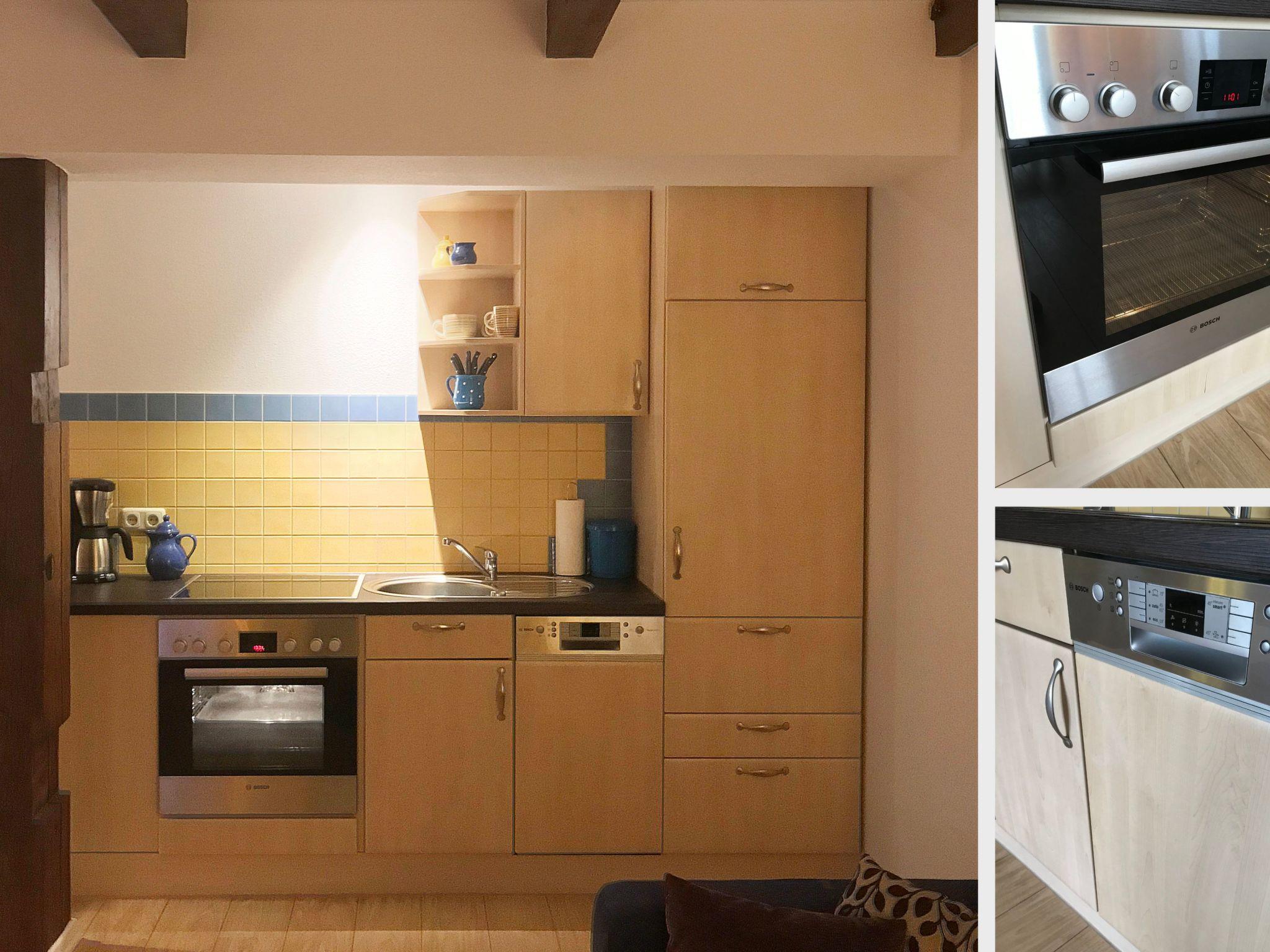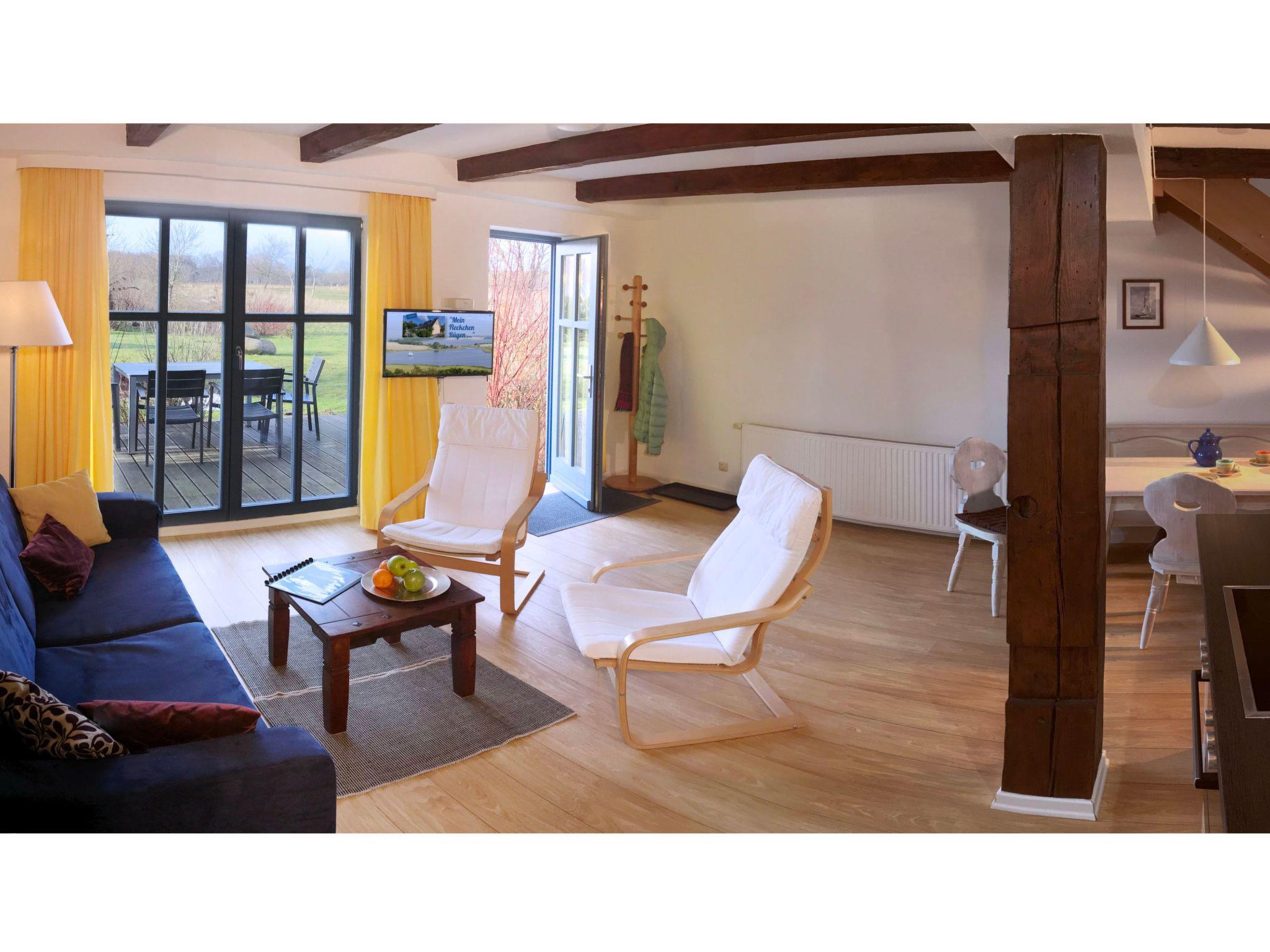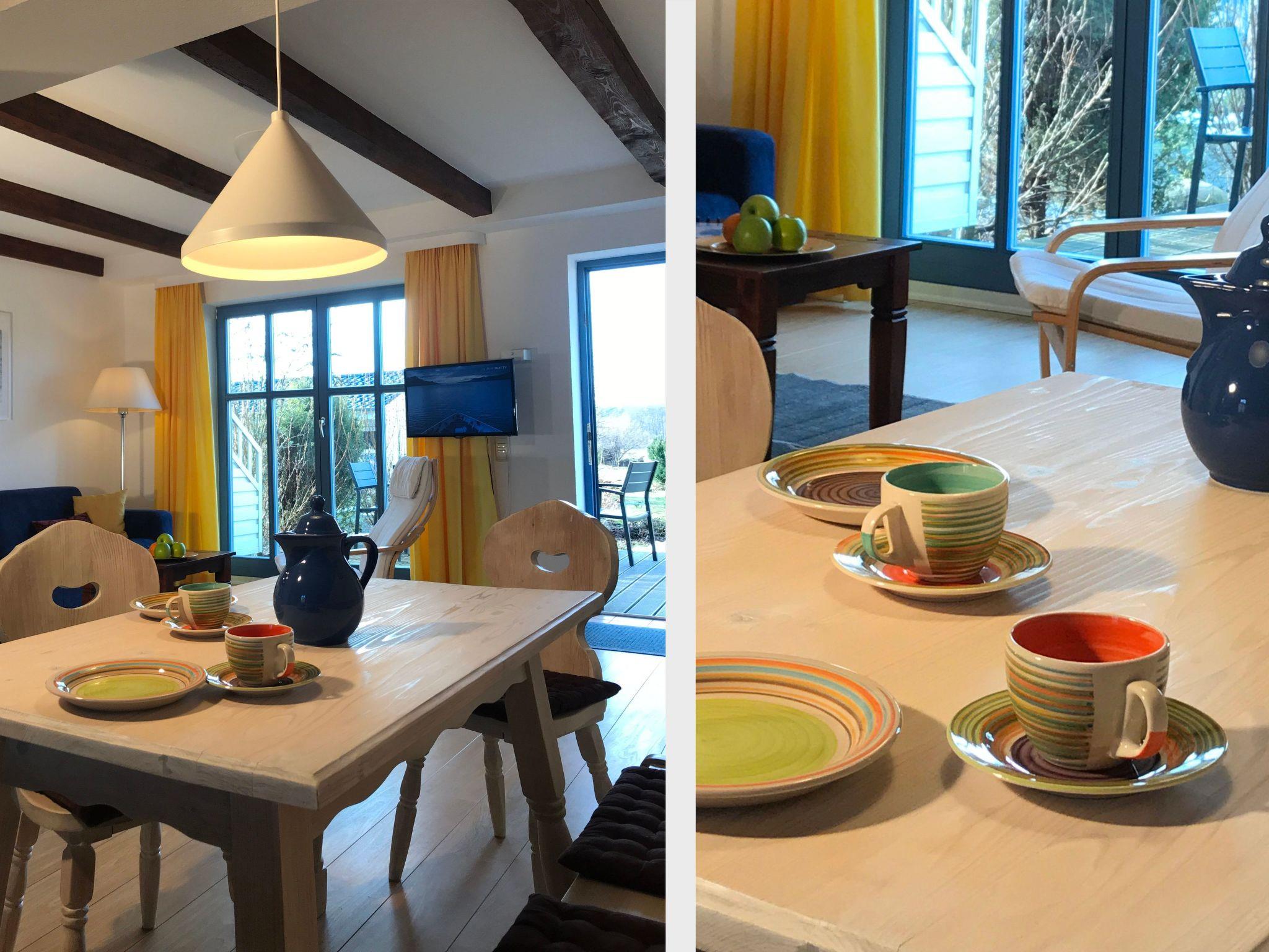 Das Ferienhaus ist etwa 61m² groß und hat 2 Etagen. In der oberen befinden sich zwei Schlafzimmer, eines mit Doppelbett und Kinderreisebett und eines mit zwei Einzelbetten (teils als Aufbettung ausziehbar). Das Erdgeschoss besticht mit historischem Balkenwerk. Der offen gestaltete Wohnbereich mit Schlafcouch (Aufbettung für die 5. Pers., TV-Flatscreen, WLAN), Essbereich (6Pers.) und offener Küche (Herd, Backofen, Kühlschrank/Gefrierfach, Geschirrspüler, Kaffeemaschine, Toaster) wirkt durch die große Fensterfront zum Garten wirklich großzügig. Das Bad/WC mit Duschkabine verfügt über ein Fenster zur Straßenseite. Bettwäsche (Abrechnung pro Person/Aufenthalt) und/oder Handtücher (Abrechnung pro Person/Aufenthalt) können dazu gebucht werden. Die Kosten überweisen Sie direkt an den Vermieter. Die Terrasse ist mit wetterfesten Gartenmöbeln ausgestattet (Polster im OG). Zu jeder Wohnung gehört ein eigener kostenloser Parkplatz vorm Haus. Im Fahrradraum, der allen Gästen zur Verfügung steht, können nicht nur Fahrräder eingeschlossen, sondern auch weitere Gartenmöbel ausgeliehen werden, ebenso wie Kinderhochstühle und jede Menge Spielsachen. Bitte achten Sie in der Hauptsaison auf die Mindestbuchung von 5 Nächten. Lückenbuchungen ab 2 Nächten sind auf Anfrage möglich.