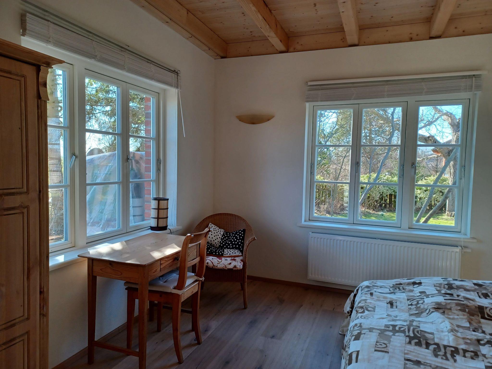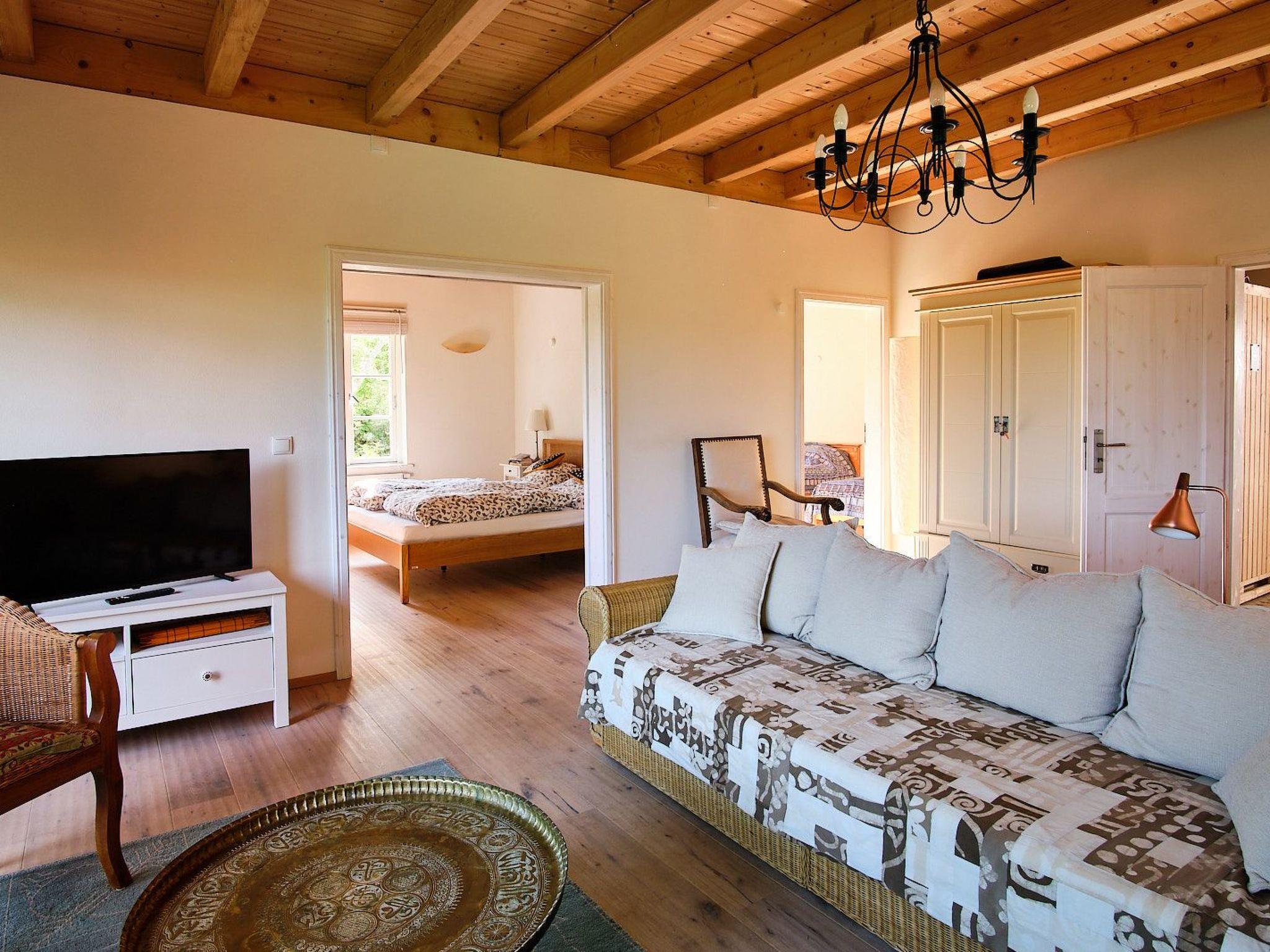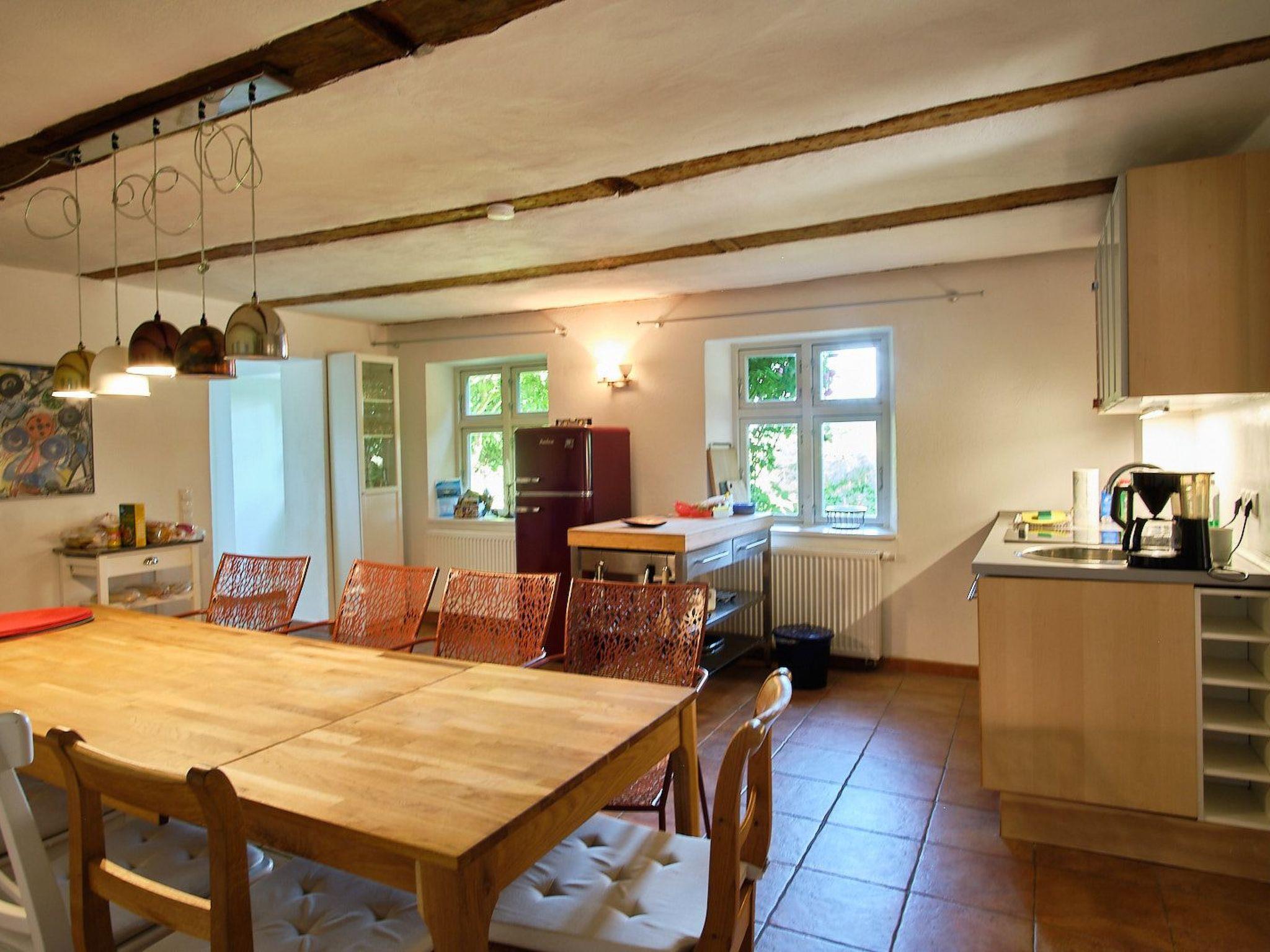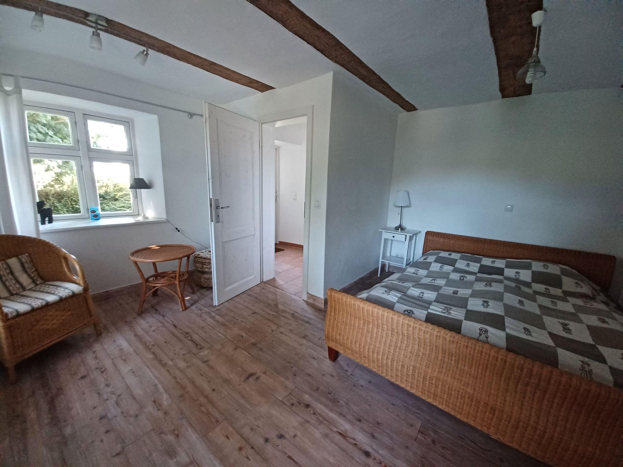 Das gesamte Haus setzt sich aus Südwestflügel und Westflügel zusammen. Der Südwestflügel besteht aus einem alten Teil (rennoviert Juni 2021) und einem Neubau (errichtet 2021 und fertiggestellt Juni 2021). Er hat einen eigenen Zugang und ist sicht und geräuschtechnisch vom anderen Teildes Hauses separiert. Das ehemalige Gutshaus von 1870 (mit älteren Fundamenten) ist nach denkmalschützerischen Gesichtspunkten in 2009 und 2010 restauriert worden und allergikerfreundlich. Die Schlafräume sind telweise mit Lehm verputzt und bieten so eine besseres Raumklima. Das gesamte Haus wird zentral beheizt. Der Südwestflügel liegt im Erdgeschoß mit insgesamt 5 Räumen auf 124 qm: Diele, ca 3 qm, drei Schlafzimmer für jew. 2 Personen zusammen ca. 50 qm, Wohnraum (Wintergarten) mit der Aufbettungsmöglichkeit für 2 bis max.4 weitere Personen im Wintergarten (27qm), Eßzimmer mit Küche und Kaminofen (26 m), 2 Bäder (6+12qm). Das 2. Bad hat eine getrennte Toilette sowie eine Sauna (ca. 4 qm) , die sich als finnische oder Bio Sauna nutzen läßt (Bank über Eck). Außen-Terrassen nach 2 Seiten (35 qm) und Gartenzugang mit eigenem Gartenanteil. Alle Zimmer haben Garten/Landschaftsblick. Abstand zum Haus des Nachbarn: ca 30 Meter.