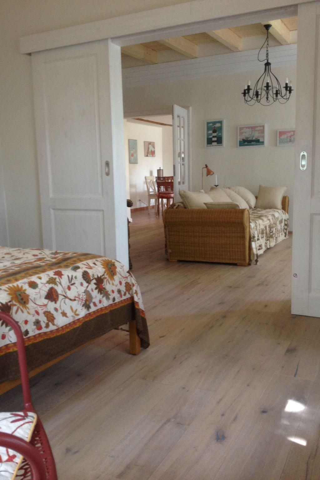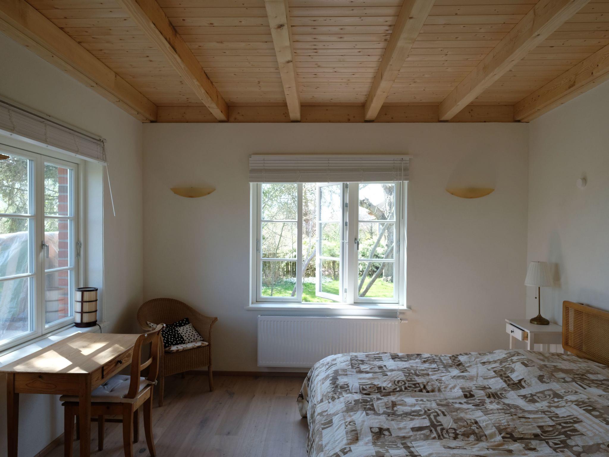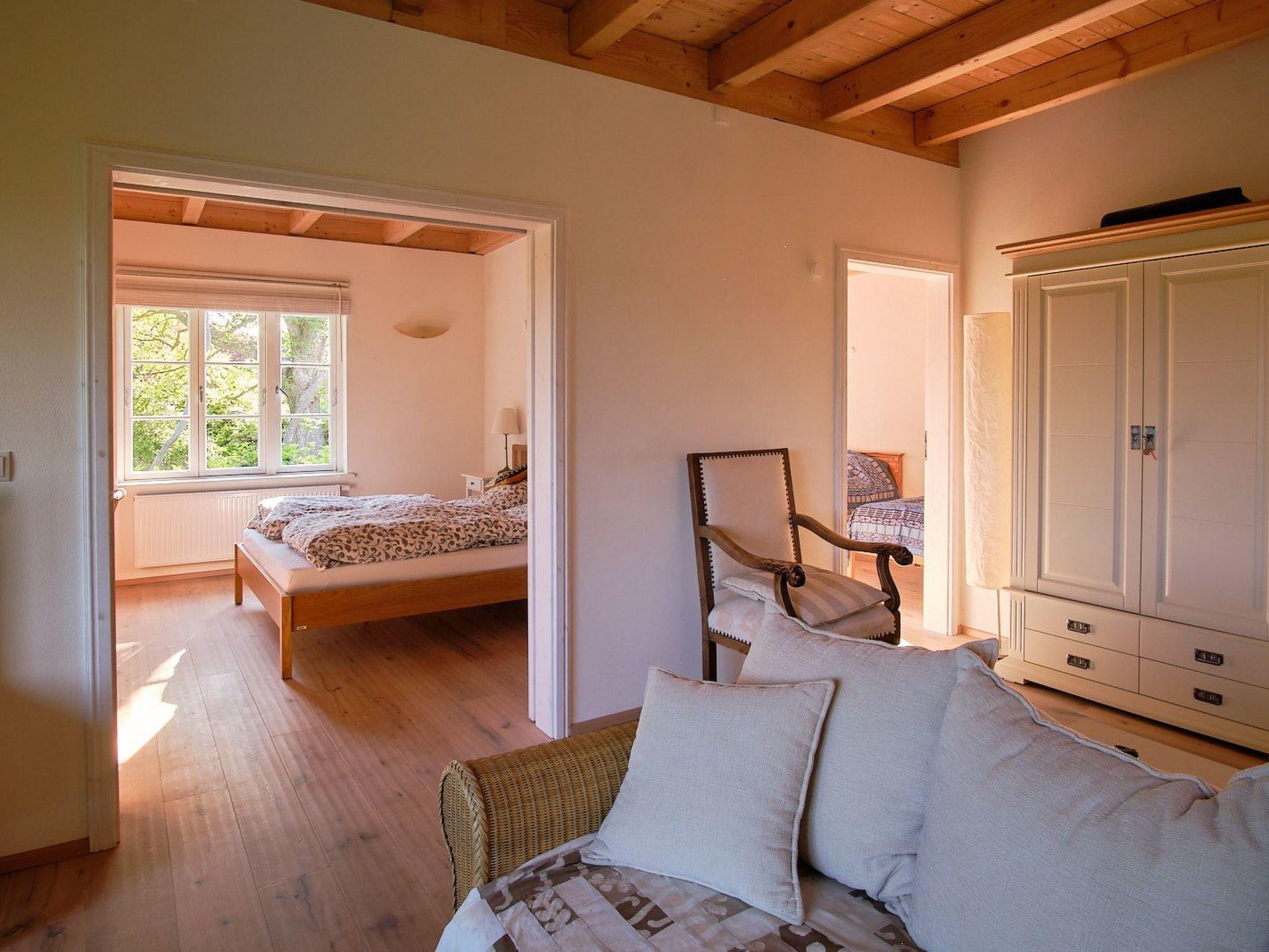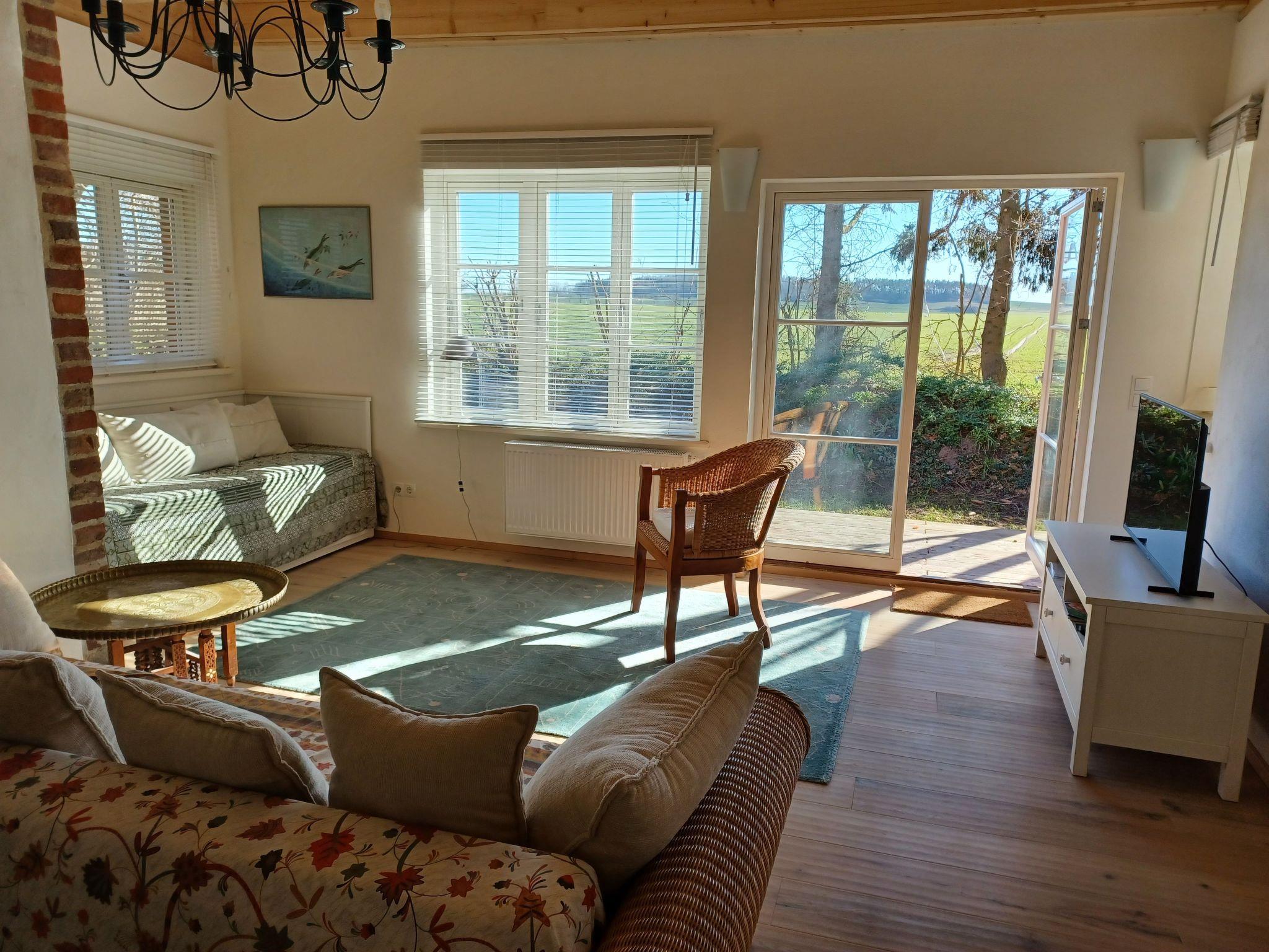 Das gesamte Haus setzt sich aus Südwestflügel und Westflügel zusammen. Der Südwestflügel besteht aus einem alten Teil (rennoviert Juni 2021) und einem Neubau (errichtet 2021 und fertiggestellt Juni 2021). Er hat einen eigenen Zugang und ist sicht und geräuschtechnisch vom anderen Teildes Hauses separiert. Das ehemalige Gutshaus von 1870 (mit älteren Fundamenten) ist nach denkmalschützerischen Gesichtspunkten in 2009 und 2010 restauriert worden und allergikerfreundlich. Die Schlafräume sind telweise mit Lehm verputzt und bieten so eine besseres Raumklima. Das gesamte Haus wird zentral beheizt. Der Südwestflügel liegt im Erdgeschoß mit insgesamt 5 Räumen auf 124 qm: Diele, ca 3 qm, drei Schlafzimmer für jew. 2 Personen zusammen ca. 50 qm, Wohnraum (Wintergarten) mit der Aufbettungsmöglichkeit für 2 bis max.4 weitere Personen im Wintergarten (27qm), Eßzimmer mit Küche und Kaminofen (26 m), 2 Bäder (6+12qm). Das 2. Bad hat eine getrennte Toilette sowie eine Sauna (ca. 4 qm) , die sich als finnische oder Bio Sauna nutzen läßt (Bank über Eck). Außen-Terrassen nach 2 Seiten (35 qm) und Gartenzugang mit eigenem Gartenanteil. Alle Zimmer haben Garten/Landschaftsblick. Abstand zum Haus des Nachbarn: ca 30 Meter.
