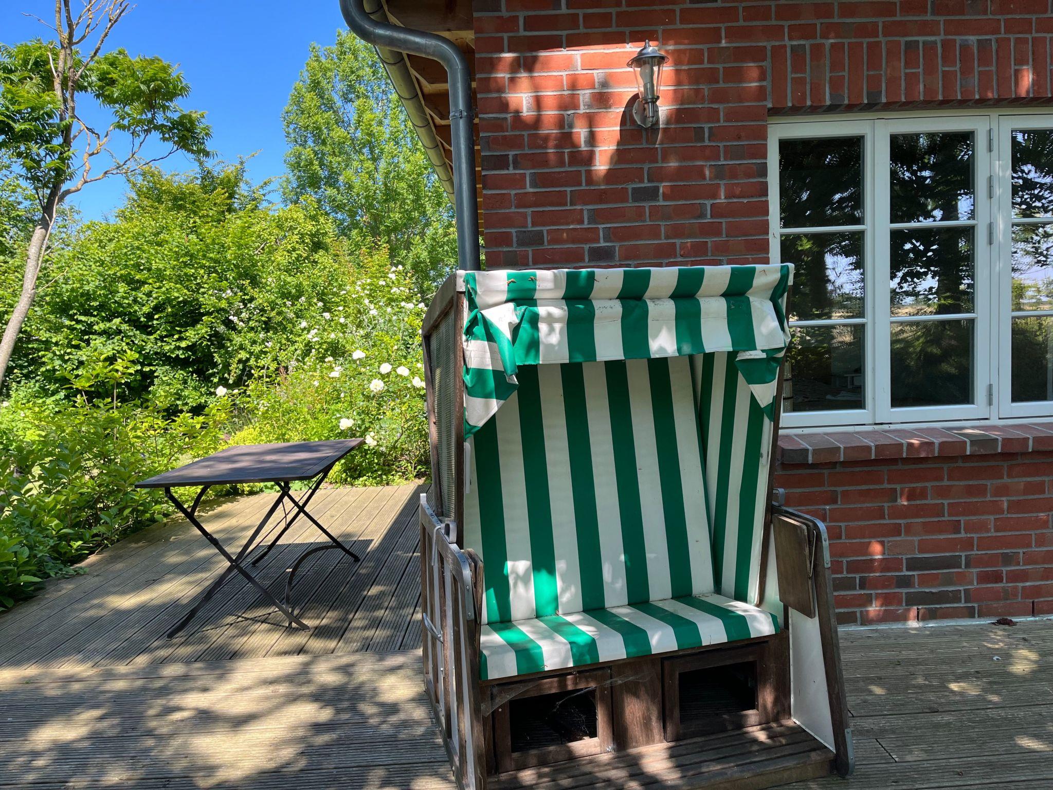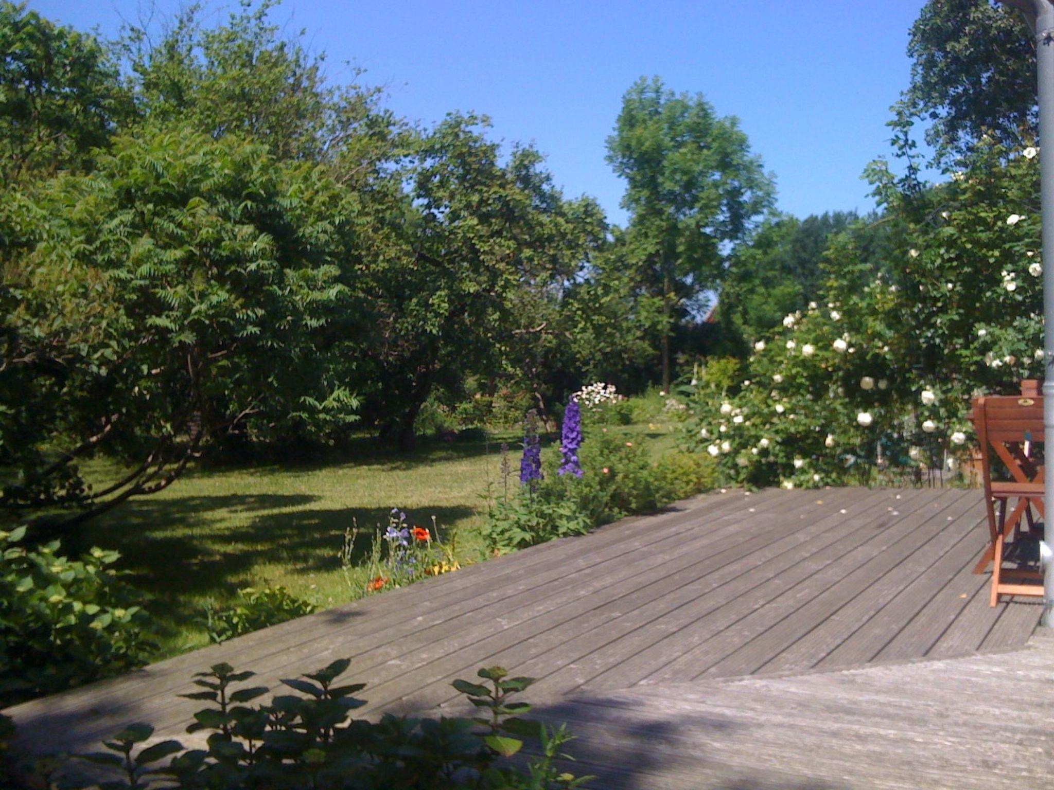 Terassen mit Gartenliegen und - Stühlen, großer Garten mit unterschiedlichen Bäumen und Obstbäumen, Beerensträuchern, Stauden, Blumenbeet und Rasenflächen. Der Garten ist weitgehend umgrenzt durch unterschiedliche Hecken, es gibt aber keinen Zaun, An den Garten schließt sich eine knapp 1 ha große Pachtweide an, die den Gästen ebenfalls zur Verfügung steht und fast bis zum Hafendorf reicht (Vorsicht vor Zecken!).