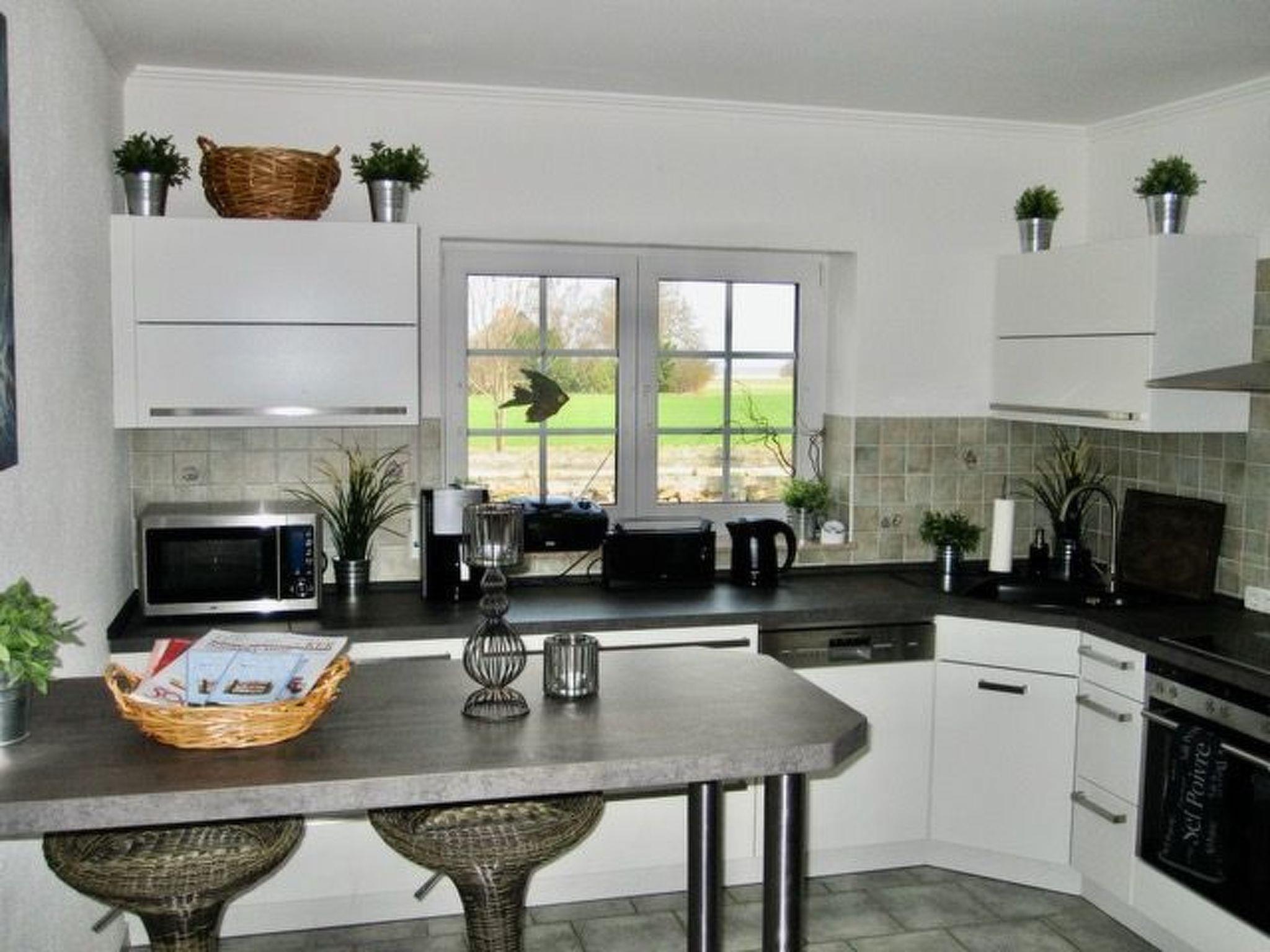 Küche ausgestattet mit: Bartresen mit Boddenblick, Induktionsherd, Backofen, Mikrowelle, Kühlschrank mit Tiefkühlfächer, Kaffeemaschine, Teekanne, Thermoskannen, Mixer, Handrührgerät, Wasserkocher etc.