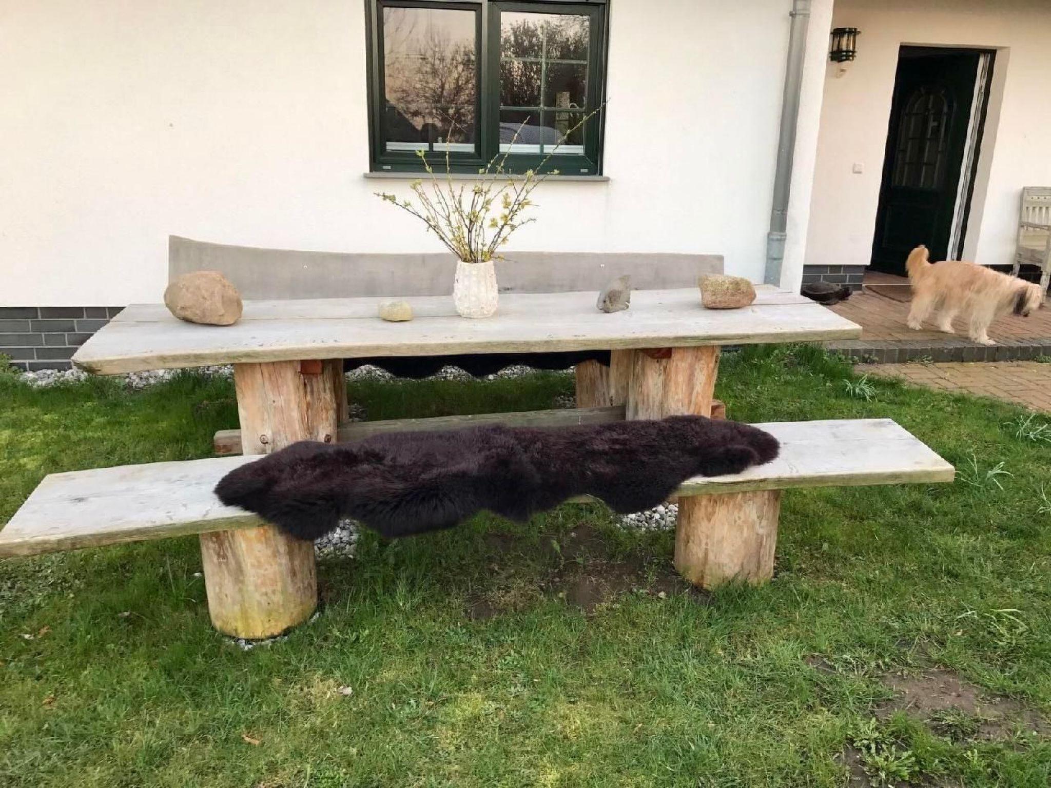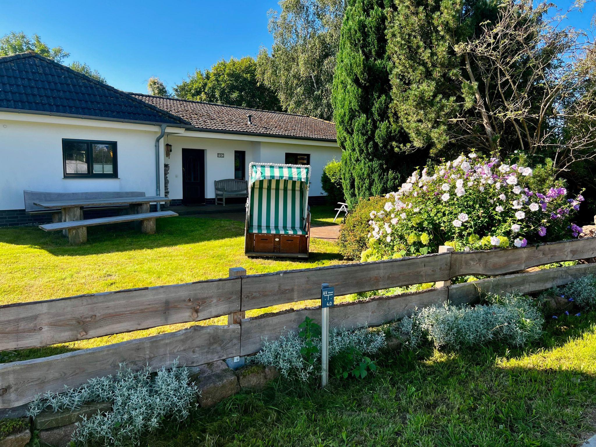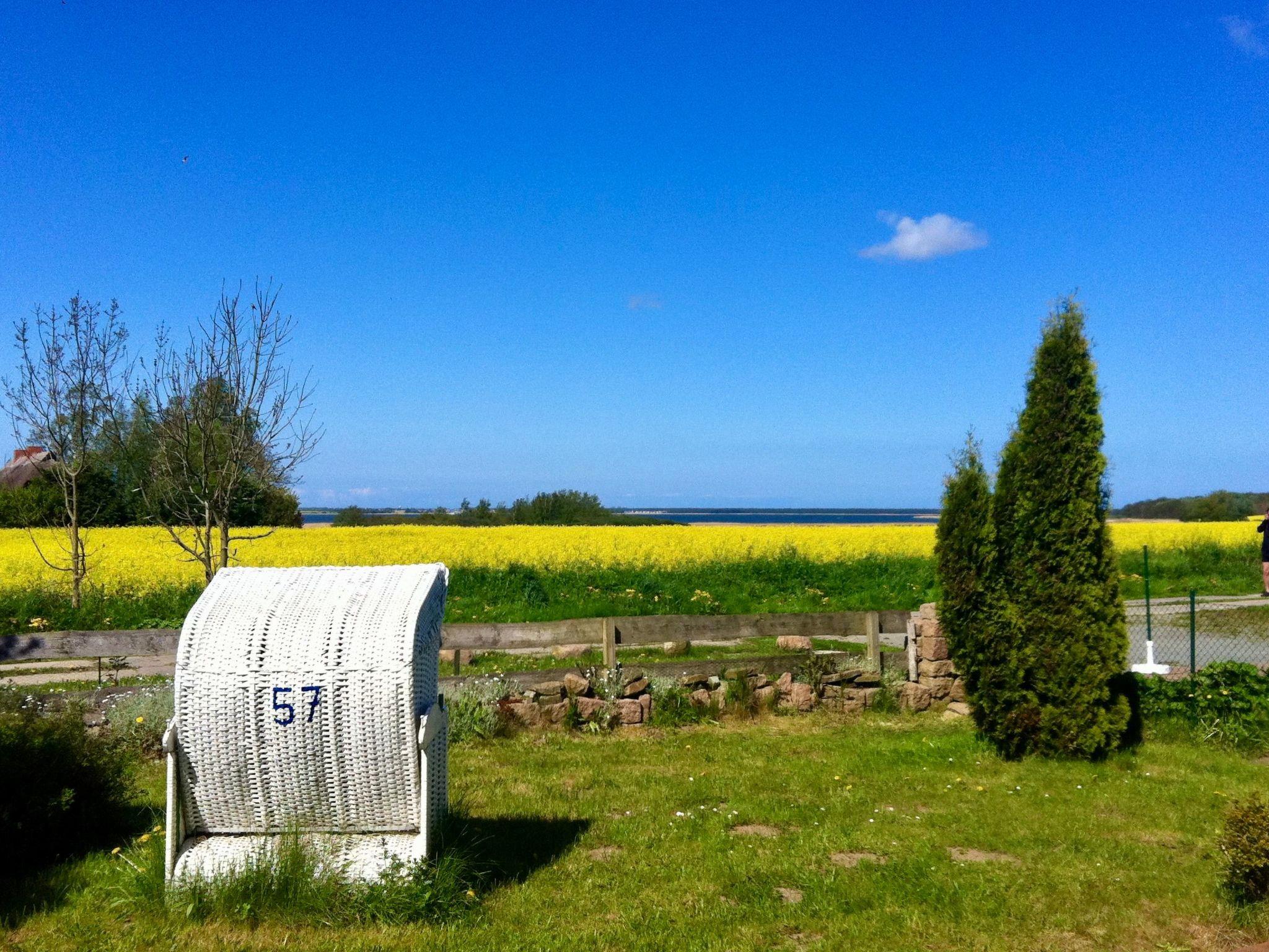 Ursprünglicher großer umzäunter Garten; mehrere gemütliche Sitzgruppen vorm und hinterm Haus, Terrasse hinterm Haus ist teilüberdacht und windgeschützt, Sonnenschirm, Strandkorb im vorderen Garten mit herrlichen Boddenblick, Holzkohlen-Grill + Elektro-Grill vorhanden.