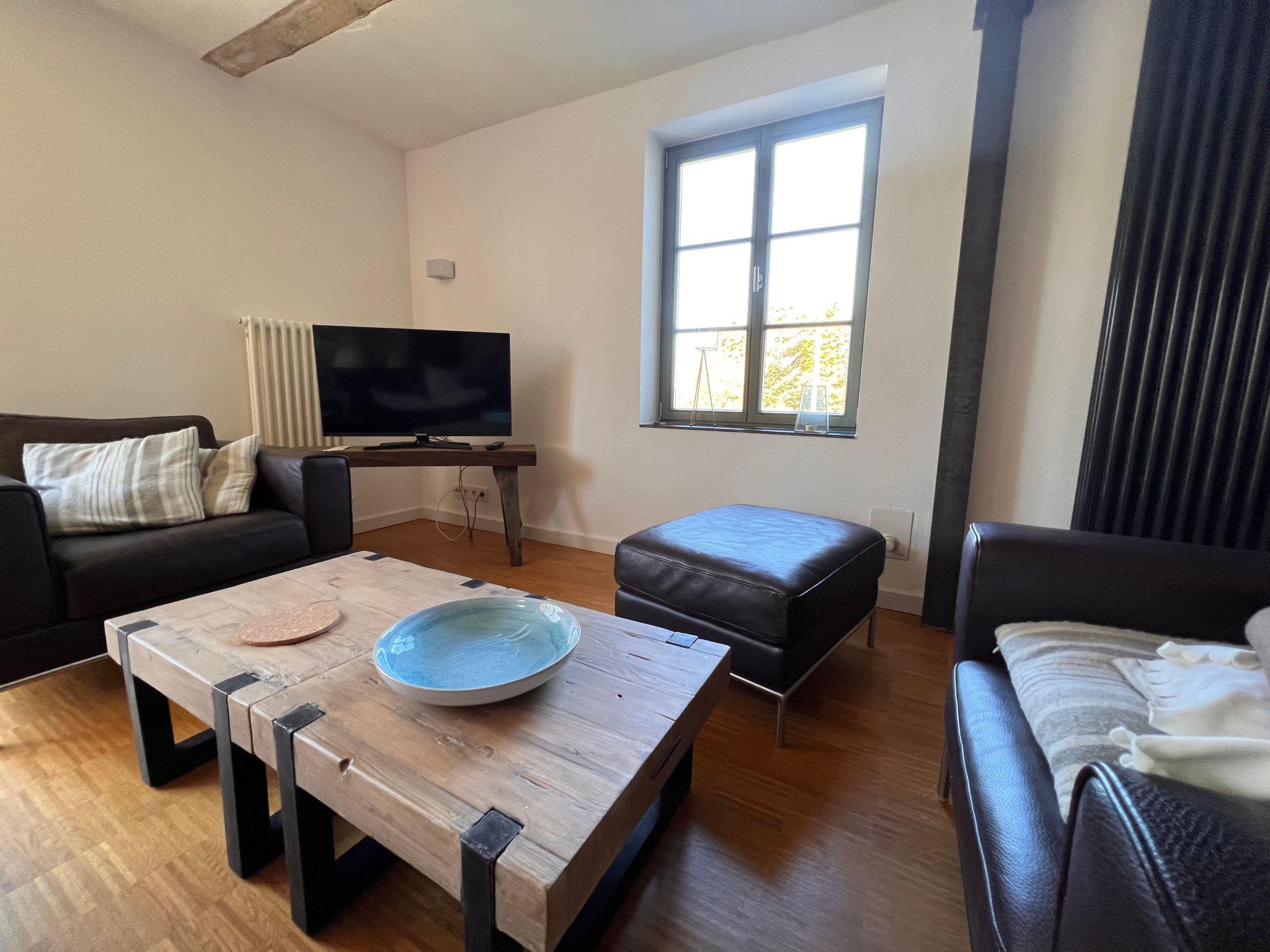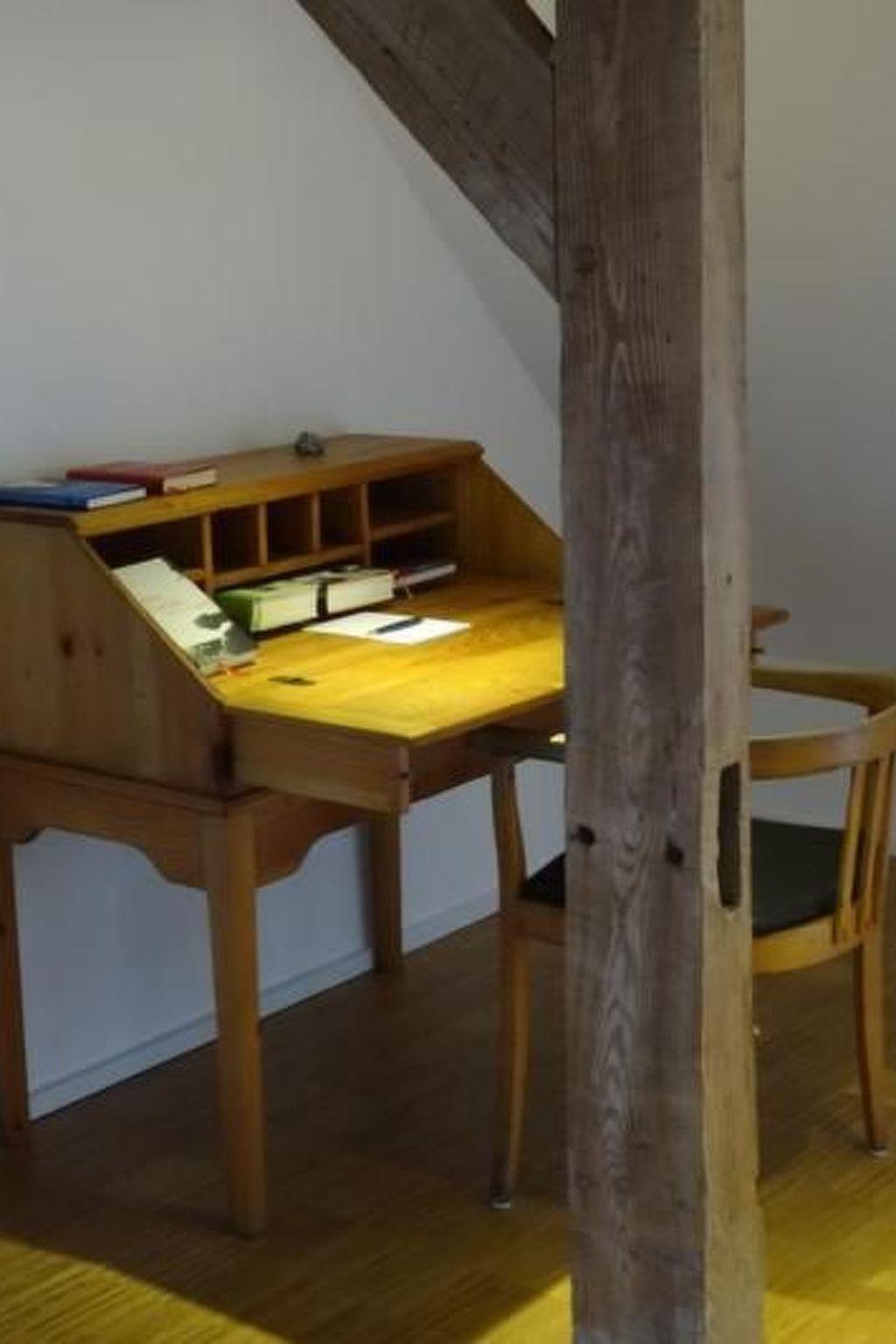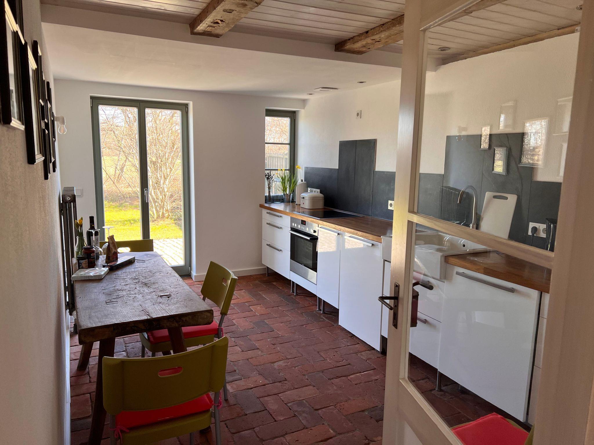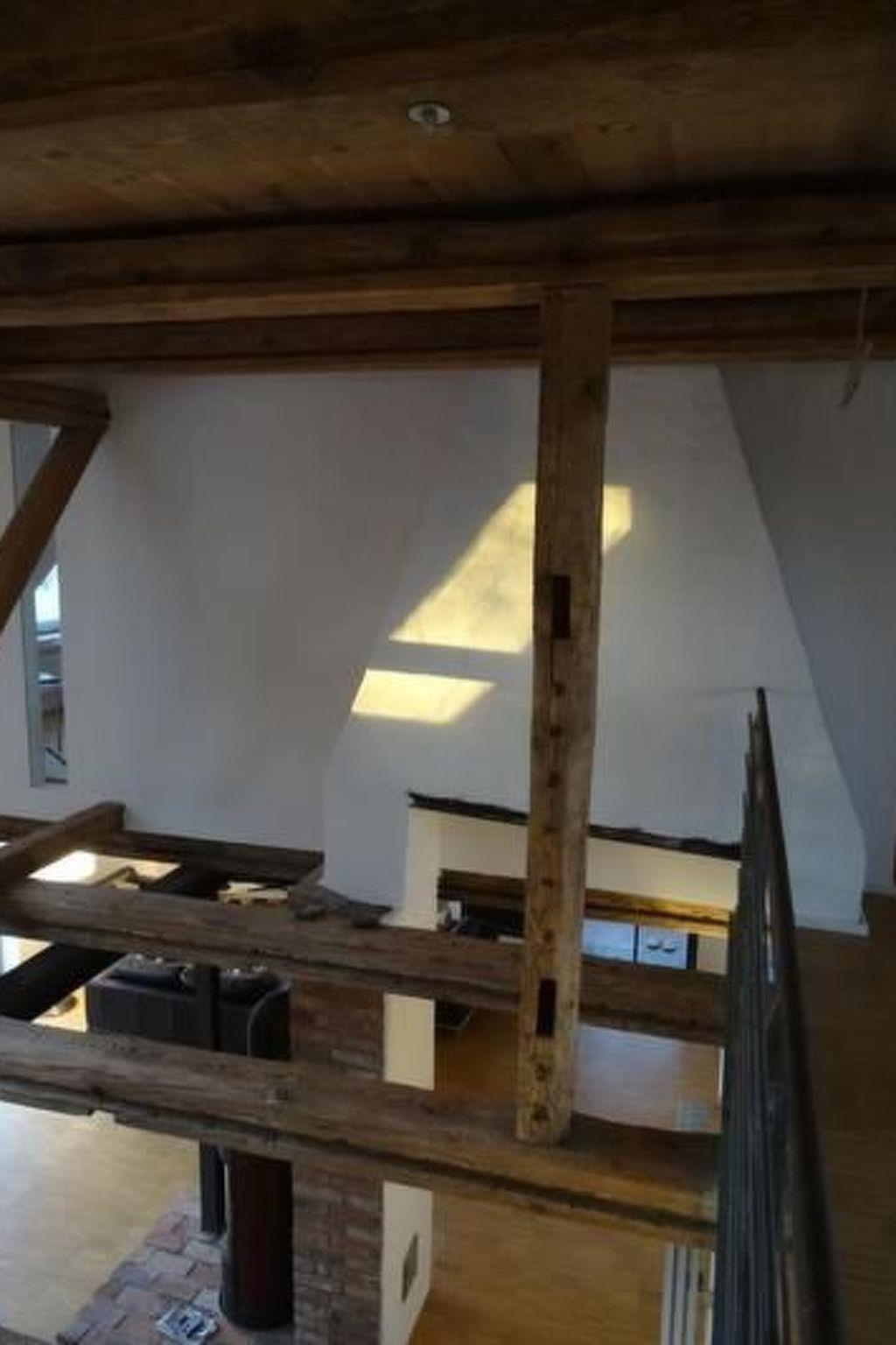 Im Innern erwartet Sie eine offene und lichtdurchflutete Raumgestaltung mit Holzparkettböden und einer Küche mit historischem Ziegelbelag. Eine Roheisenstahltreppe mit Bauholzbelag führt Sie auf die offene Galerie, die zu Lesestunden mit Blick auf weitläufige Feldlandschaften einlädt. Die Bäder sind mit Naturstein und Sanitärobjekten von Philippe Starck edel ausgestattet, während die offen liegenden Balken und die teilweise mit Lehmziegeln ausgefachten Wände den historischen Charme unterstreichen. Zusätzlichen Komfort bieten zwei Schlafzimmer und zwei Badezimmer, die gemütliche Rückzugsorte in diesem einzigartigen Ambiente darstellen.