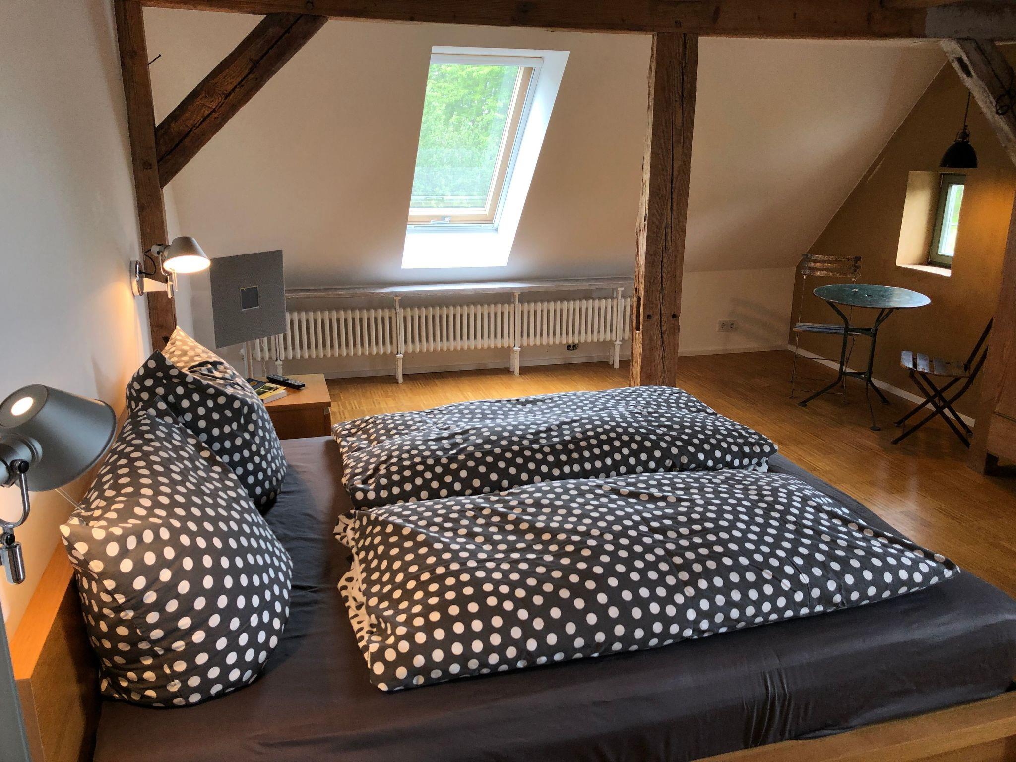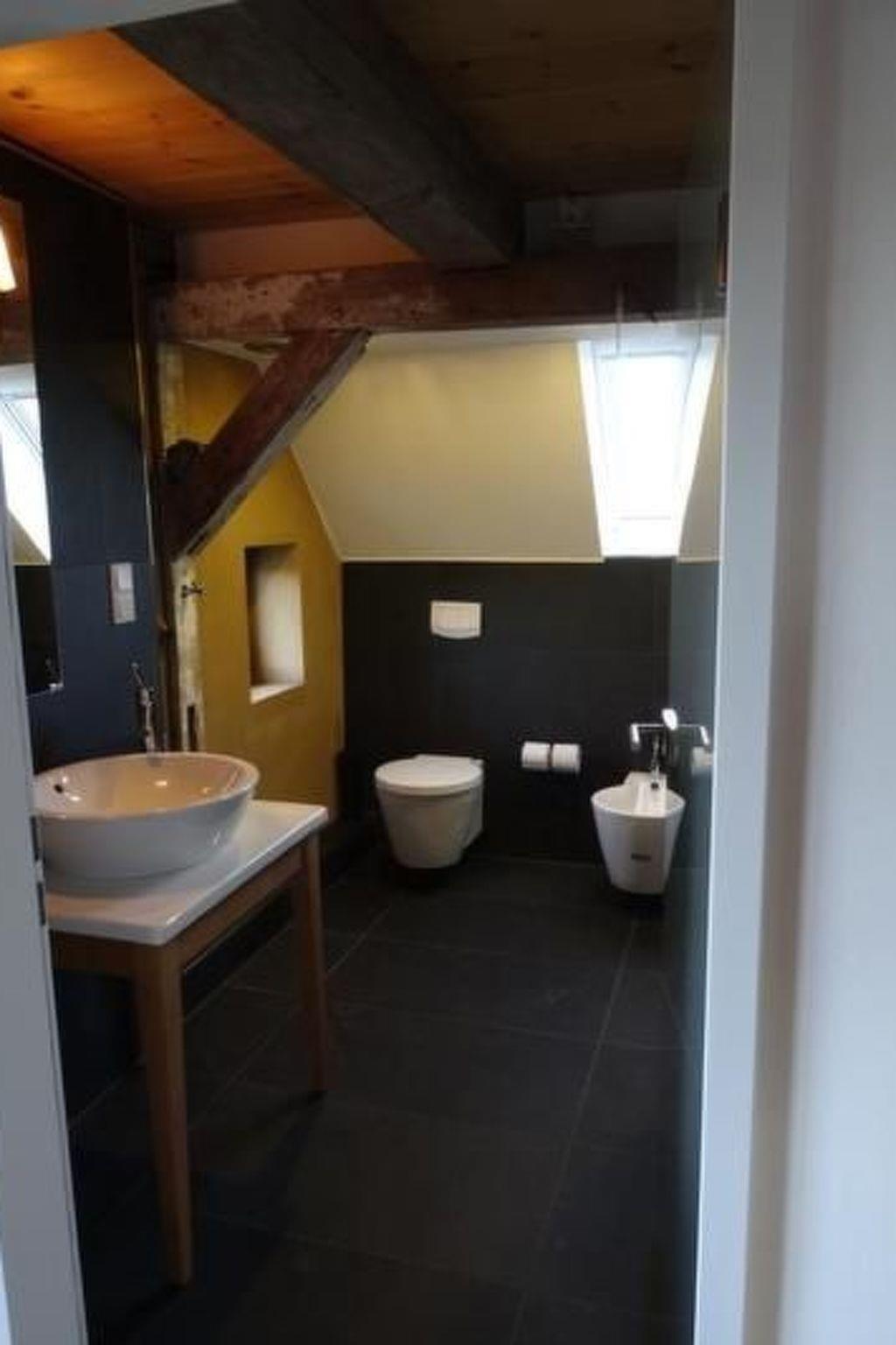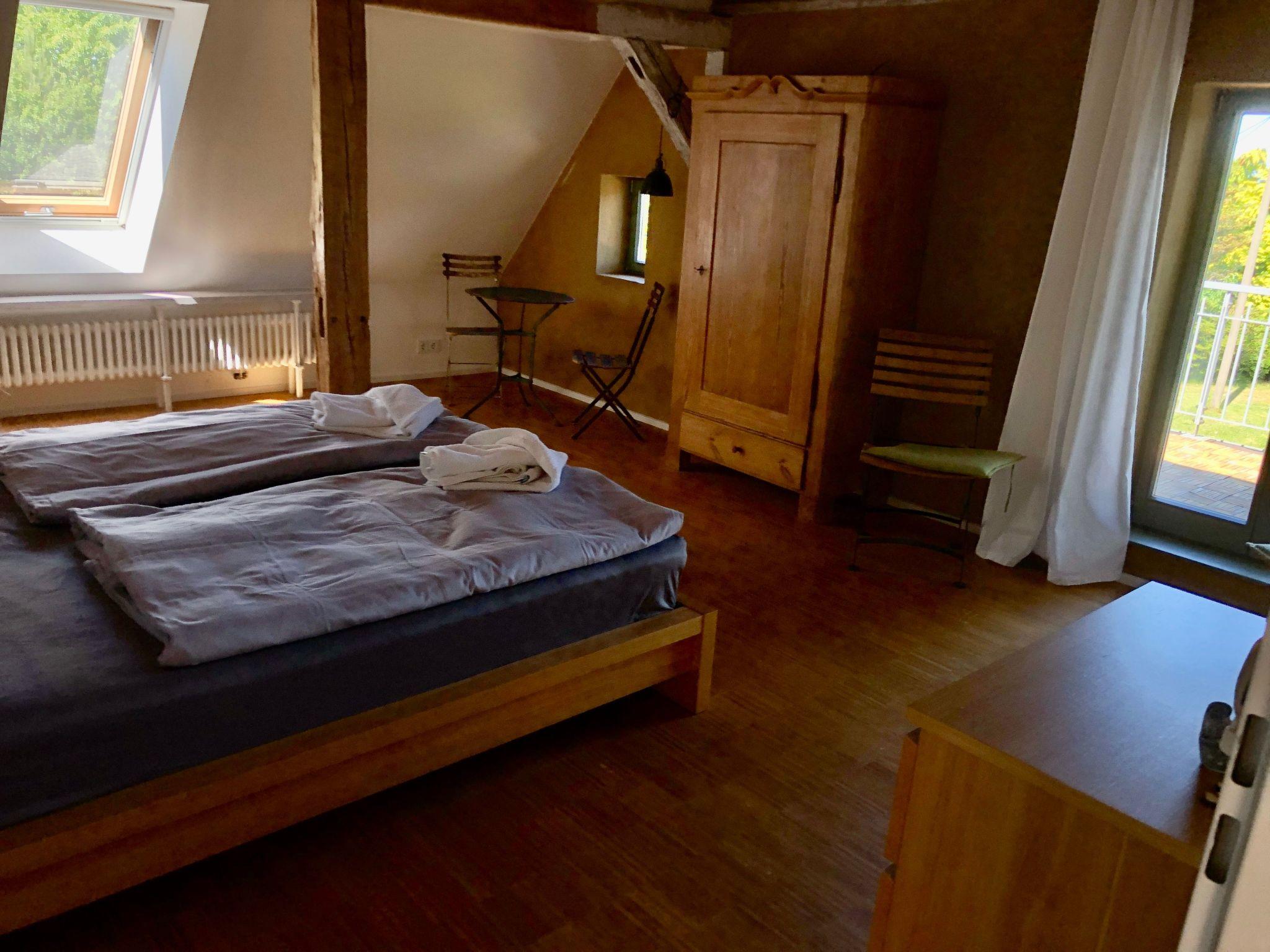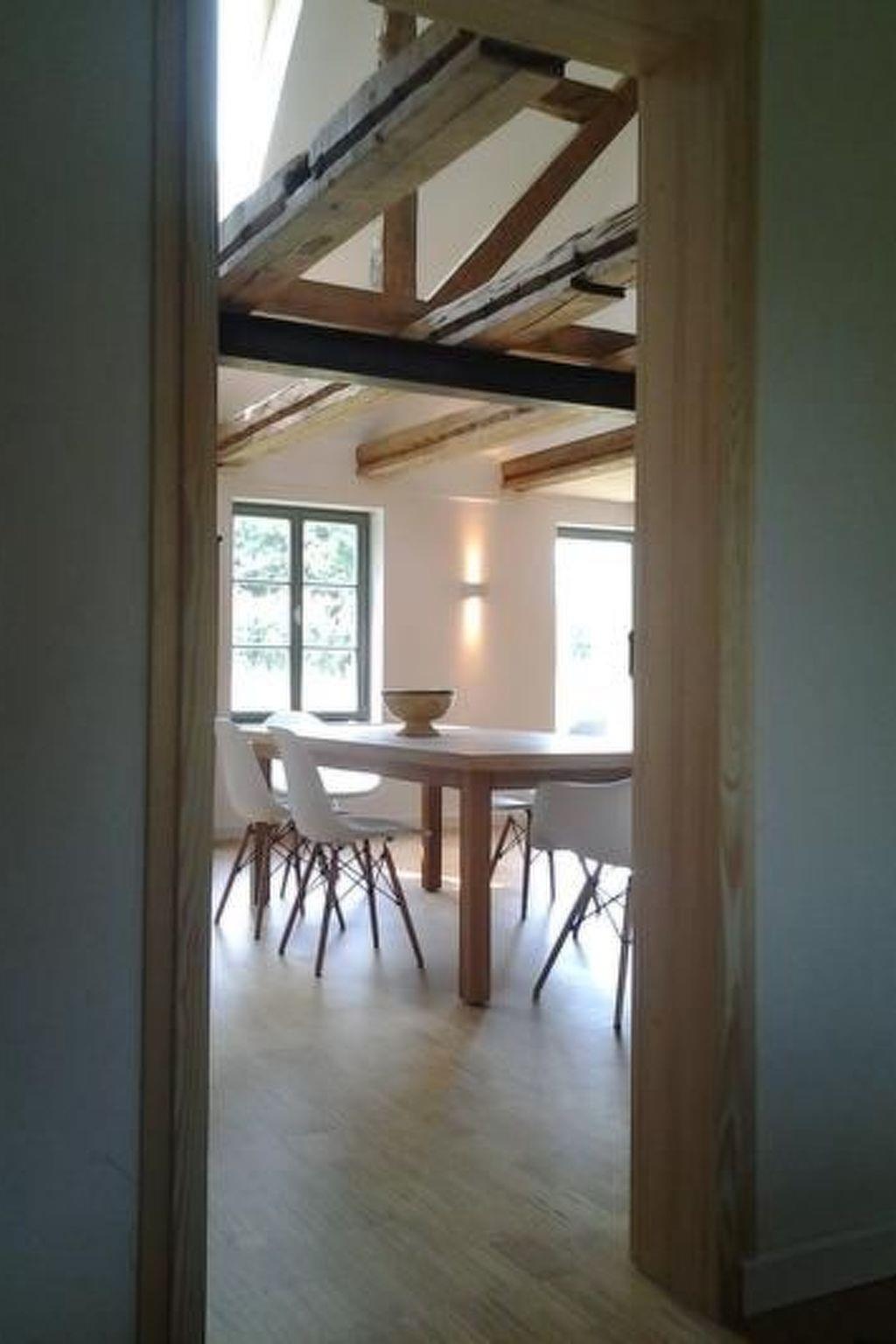 Im Innern erwartet Sie eine offene und lichtdurchflutete Raumgestaltung mit Holzparkettböden und einer Küche mit historischem Ziegelbelag. Eine Roheisenstahltreppe mit Bauholzbelag führt Sie auf die offene Galerie, die zu Lesestunden mit Blick auf weitläufige Feldlandschaften einlädt. Die Bäder sind mit Naturstein und Sanitärobjekten von Philippe Starck edel ausgestattet, während die offen liegenden Balken und die teilweise mit Lehmziegeln ausgefachten Wände den historischen Charme unterstreichen. Zusätzlichen Komfort bieten zwei Schlafzimmer und zwei Badezimmer, die gemütliche Rückzugsorte in diesem einzigartigen Ambiente darstellen.