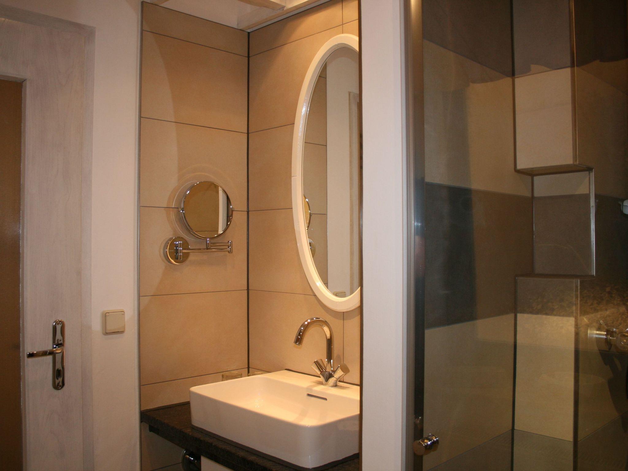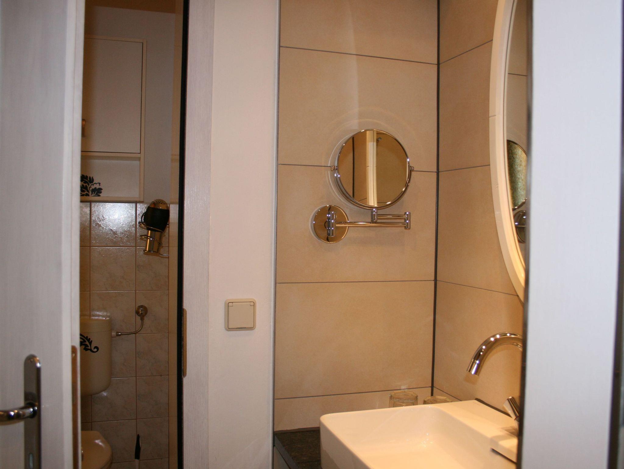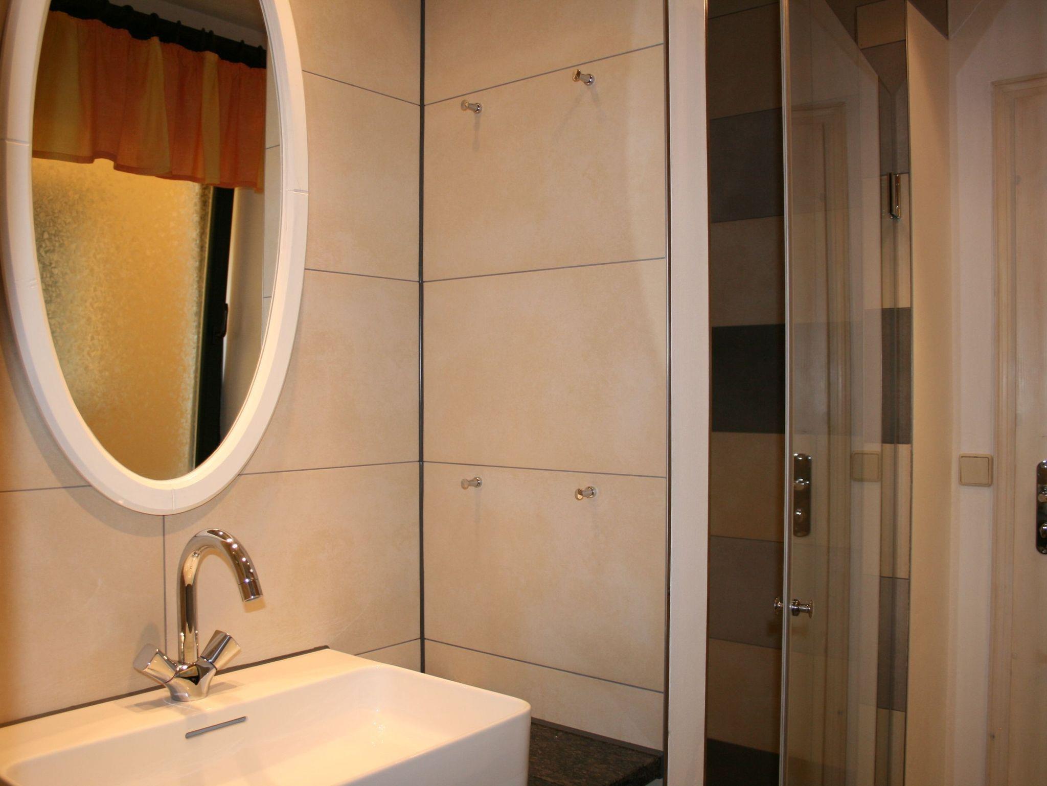 Der Sanitärbereich hat eine ebenerdige Dusche (inkl. Regenbrause). Dort befinden sich bei gewählter Zusatzleistung Handtücher, Waschlappen, Duschvorleger und Badehandtücher. Zudem schließt sich hier ein separates WC an .
