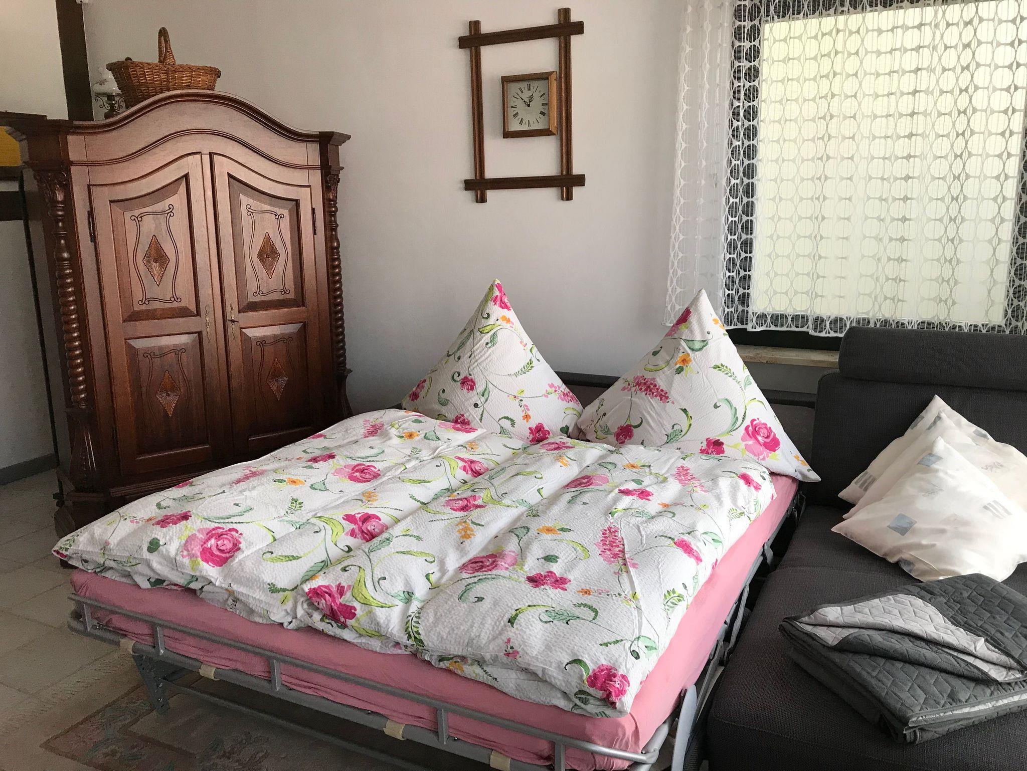 Im offenen Wohnbereich befindet sich eine komfortable Sitzecke. Das integrierte Schlafsofa, in Ausstattung mit Lattenrost und Matratze (150x200), ist Schlafstätte für 2 Gäste. Zudem ist dort eine Aufstellmöglichkeit für ein Kinderreisebett (1 Kleinkind) gegeben. Zur Aufbewahrung von Bekleidung und Wäsche gibt es einen geräumigen Schrank, sowie eine Garderobe.