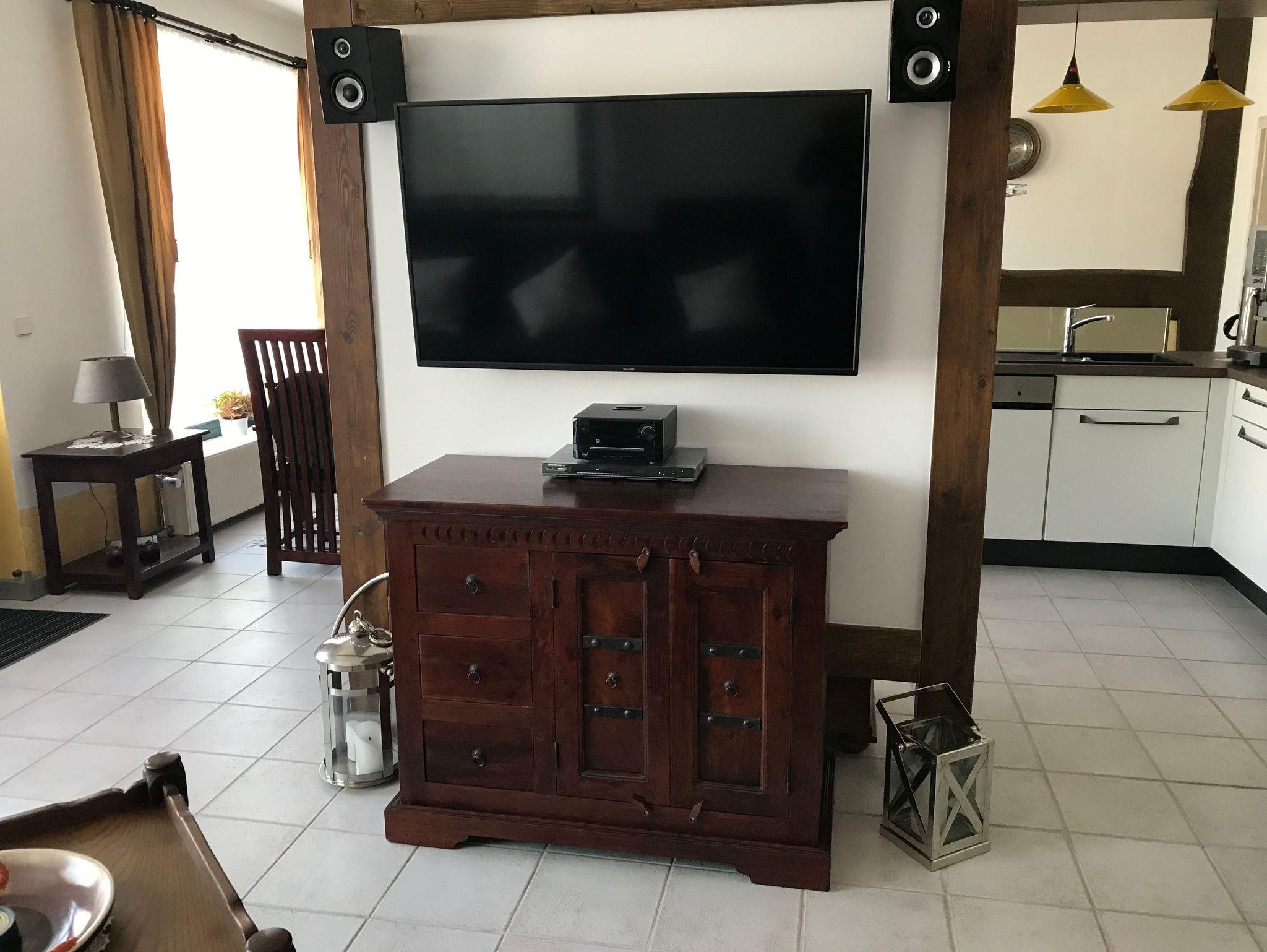 Die mit ca.45m² Wohnfläche versehene 1-Zimmer-Wohnung Kaufmann hat eine offene Wohngestaltung mit einem Wohn-, Eß- und Küchenbereich. Sie kann bis zu 3 Gäste (2 Erwachsene und 1 Kleinkind) als Ferienunterkunft beherbergen. Erzogene und stubenreine Hunde bis zu einer Rißhöhe von ca. 50 cm sind willkommen. Weiterhin steht der im hinteren Bereich des Hauses mit seinen allergikerfreundlichen Ferienwohnungen (ohne Hund) ca. 50m² große, separate Empfangs- und Dielenbereich (ohne Hunde) mit Kamin gemeinschaftlich zur Verfügung und läd zum verweilen bei Spieleabende oder zum lesen eines Buches ein.