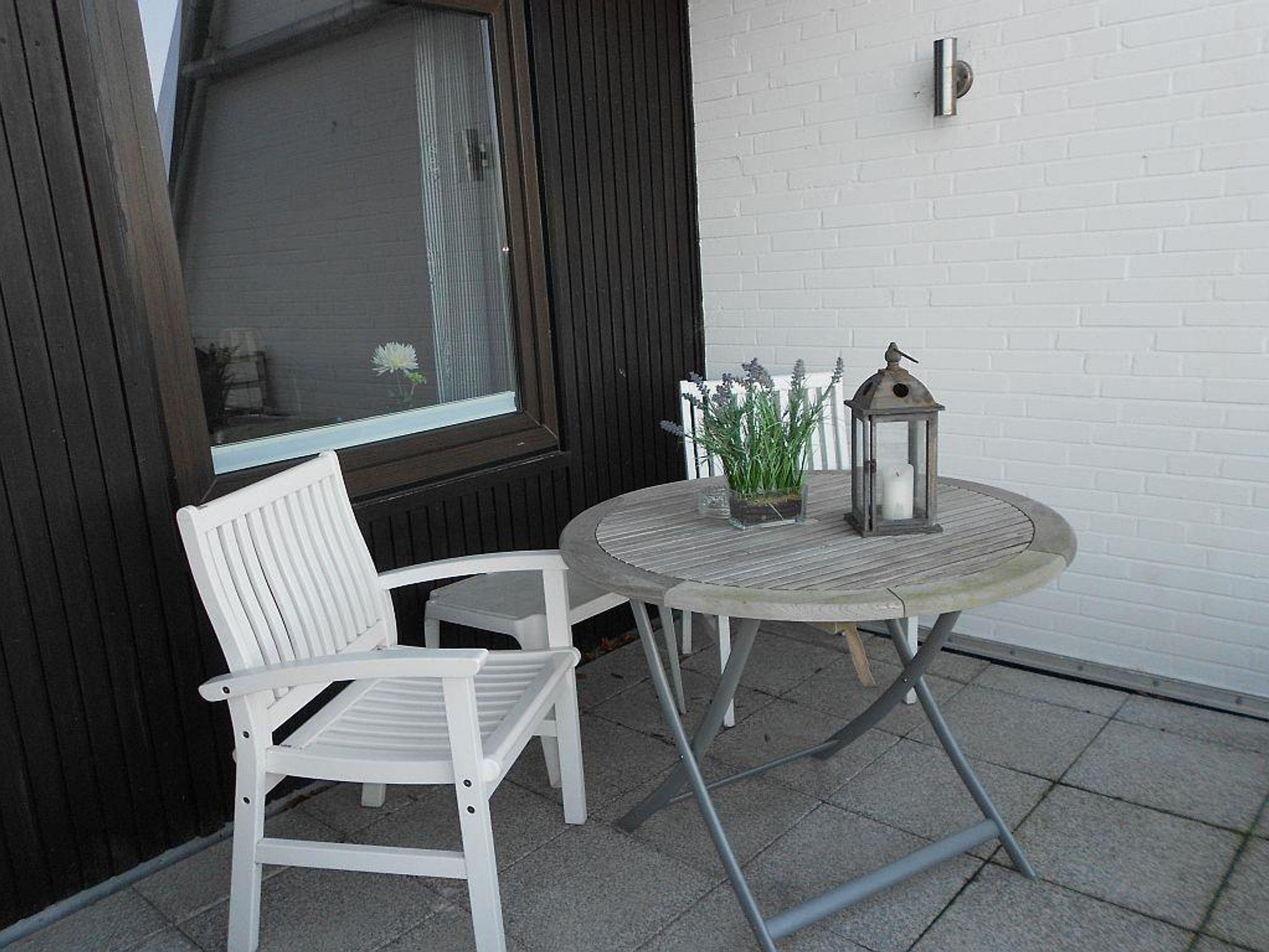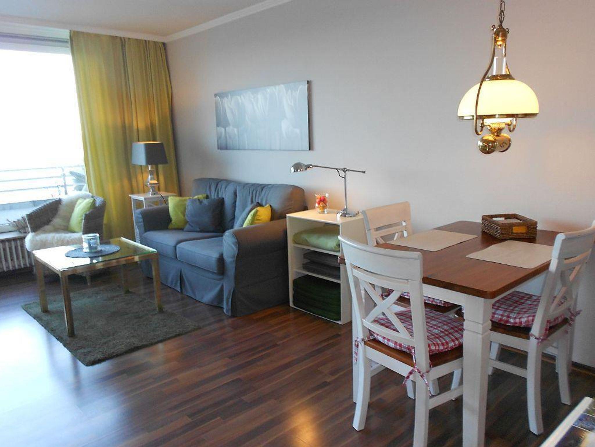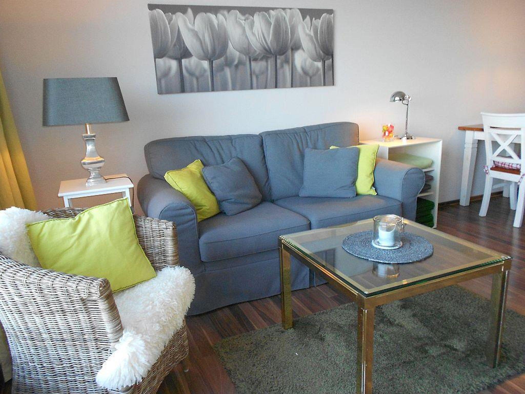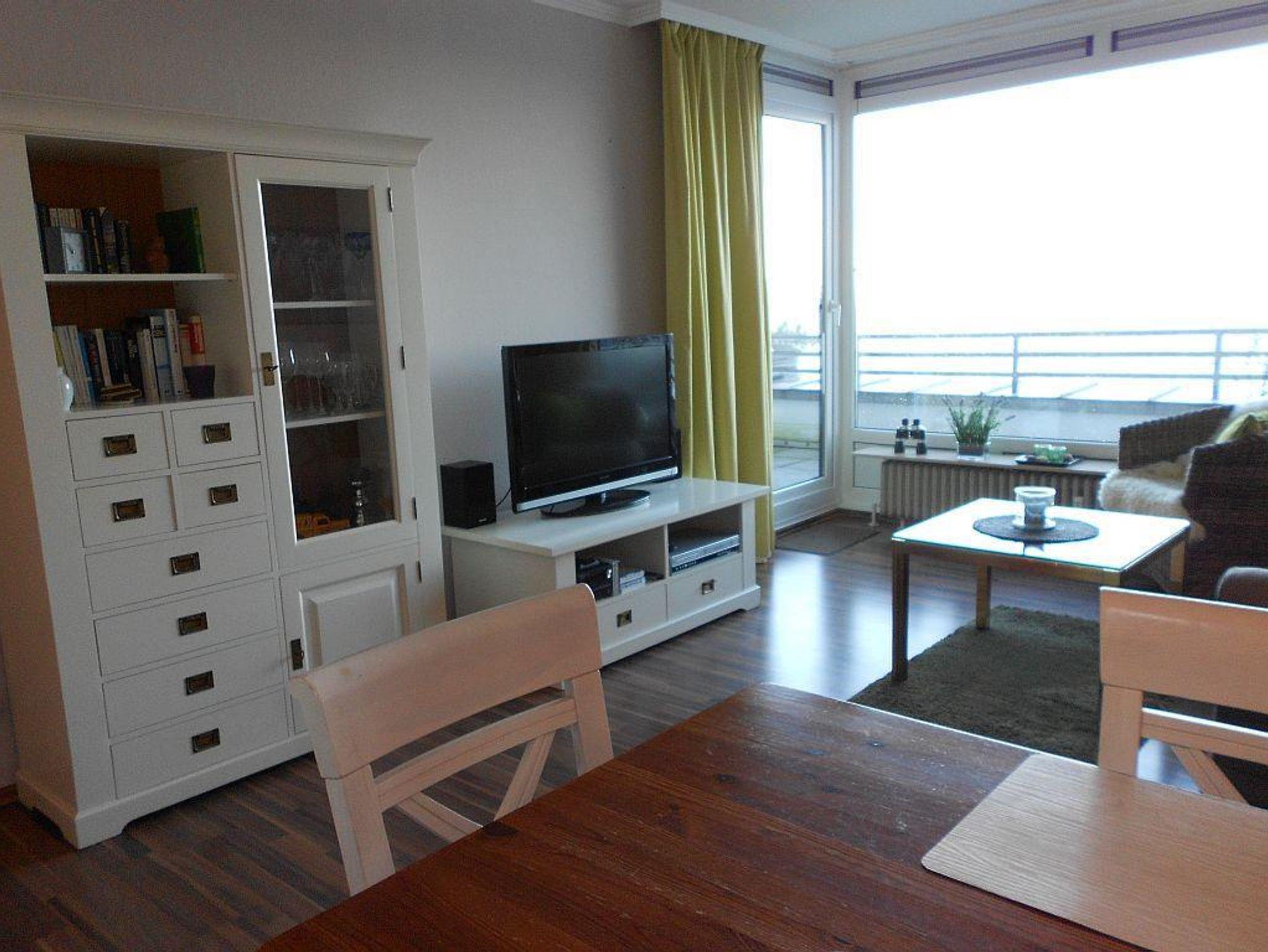 Die 53 qm Wohnung ist modern ausgestattet und für 2 Personen geeignet. Sie verfügt über ein Schlafzimmer, ein Wohnzimmer mit Essecke mit Zugang zur großen Seeterasse mit Blick über die Förde, WC und Dusche in getrennten Räumen und eine kleine Einbauküche.