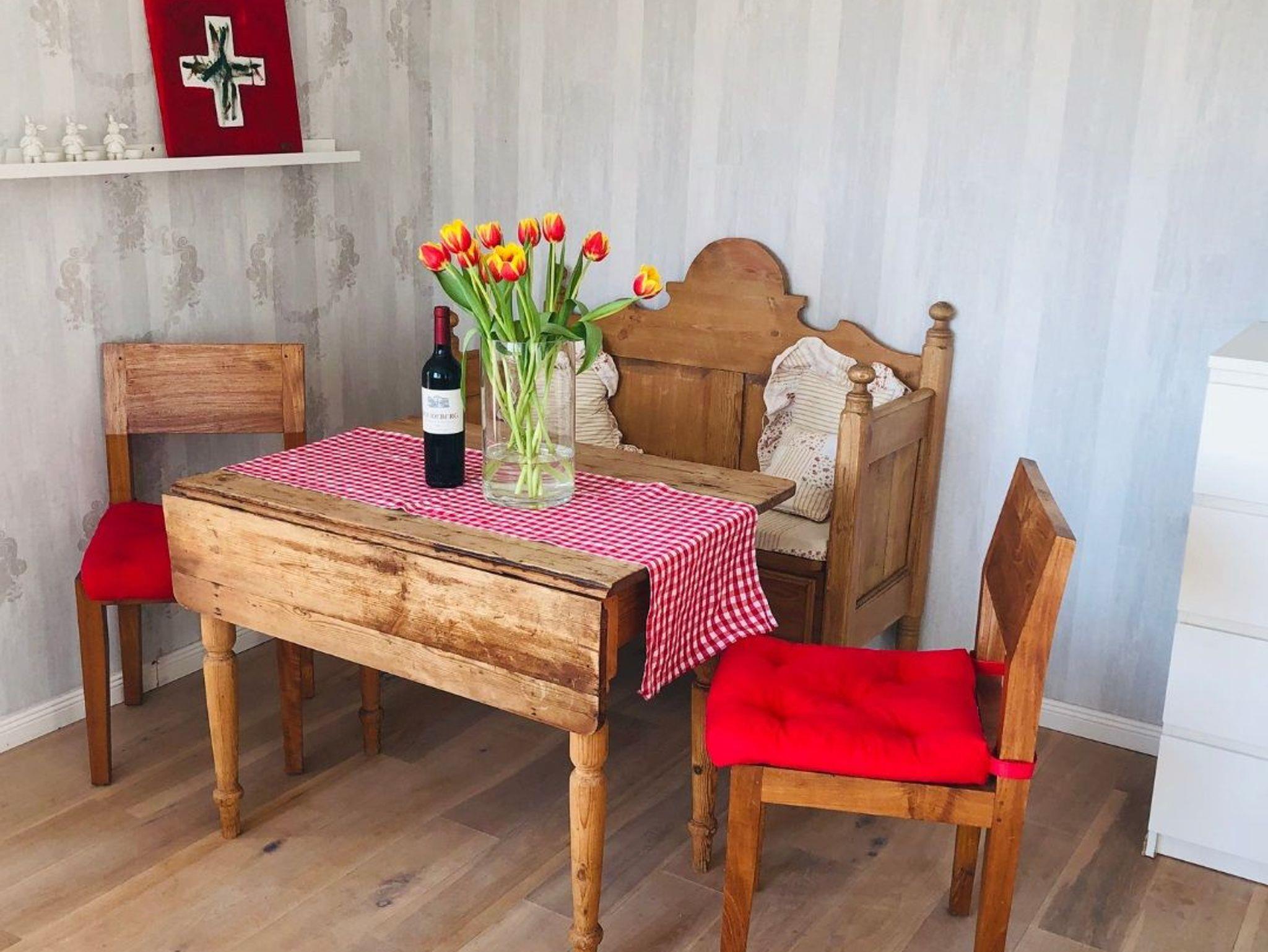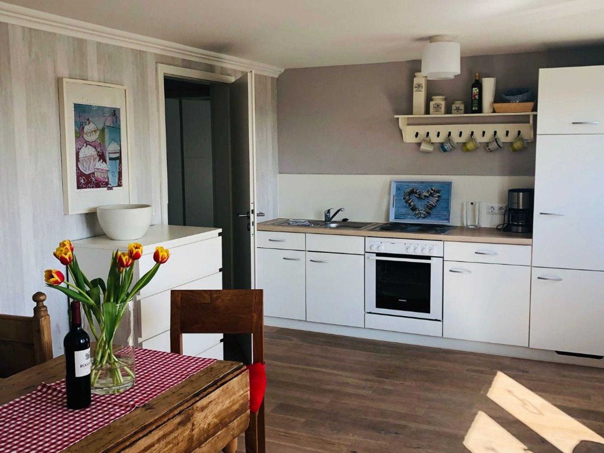 Der Essbereich ist mit einer Küchenzeile ausgestattet und mit friesischen Elementen wie einer antiken Bank und einem Tisch. Das liebevoll eingerichtete Wohnzimmer verfügt über eine Ausziehcouch, die als Bett(160cm) genutzt werden kann, TV und bodentiefen Fenstern. Im kuscheligen Schlafzimmer befindet sich ein Doppelbett. Neben dem Blick in die Natur ist das Highlight dieser Wohnung das hochwertig-ausgestattete Badezimmer mit begehbarer Dusche und einer XL-Badewanne.