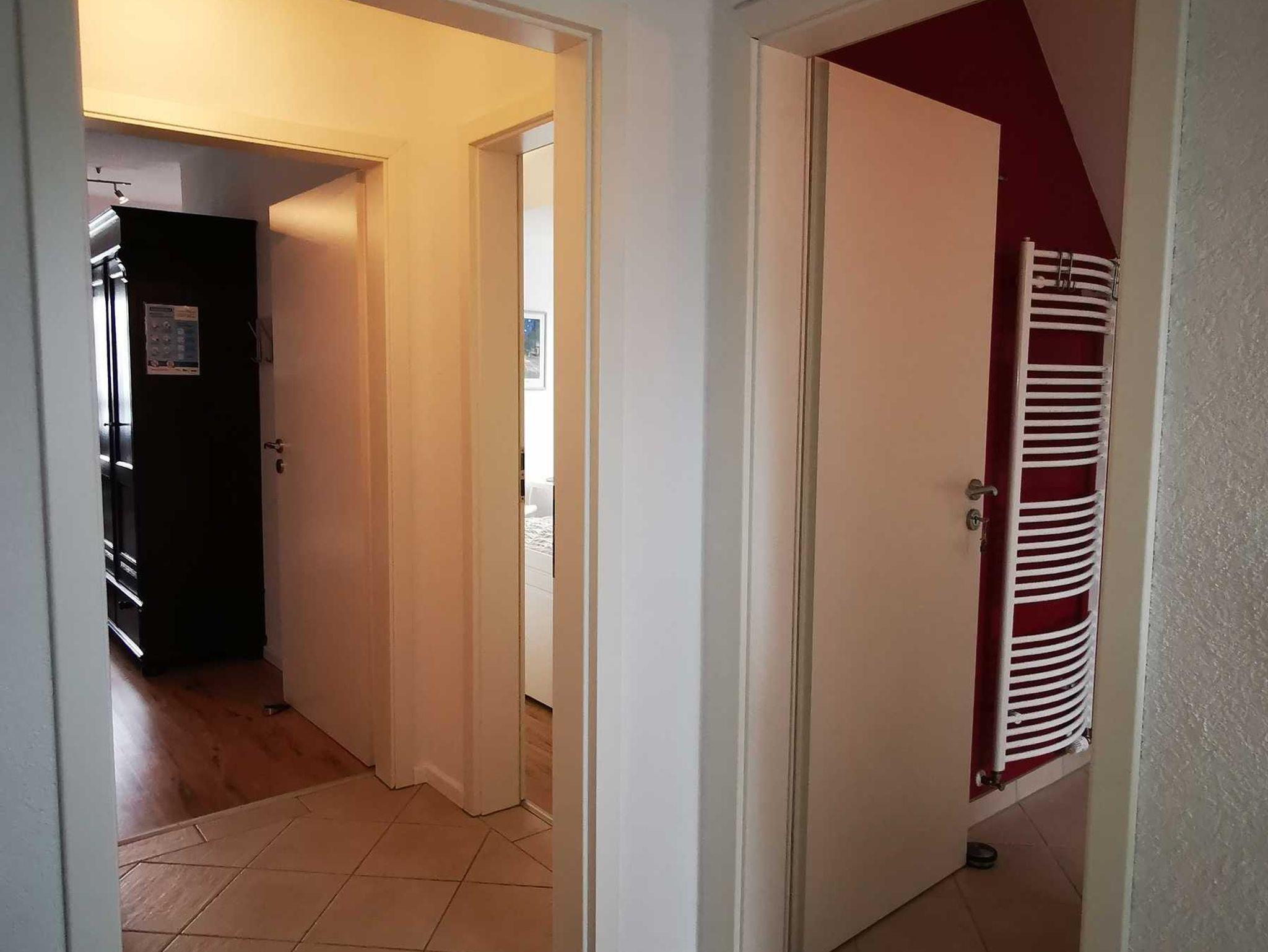 Dort bestehen zwei Eingänge zu einer Ferienwohnung und zu einem Appartement. Von dort aus gelangt man in den Wohnbereich.