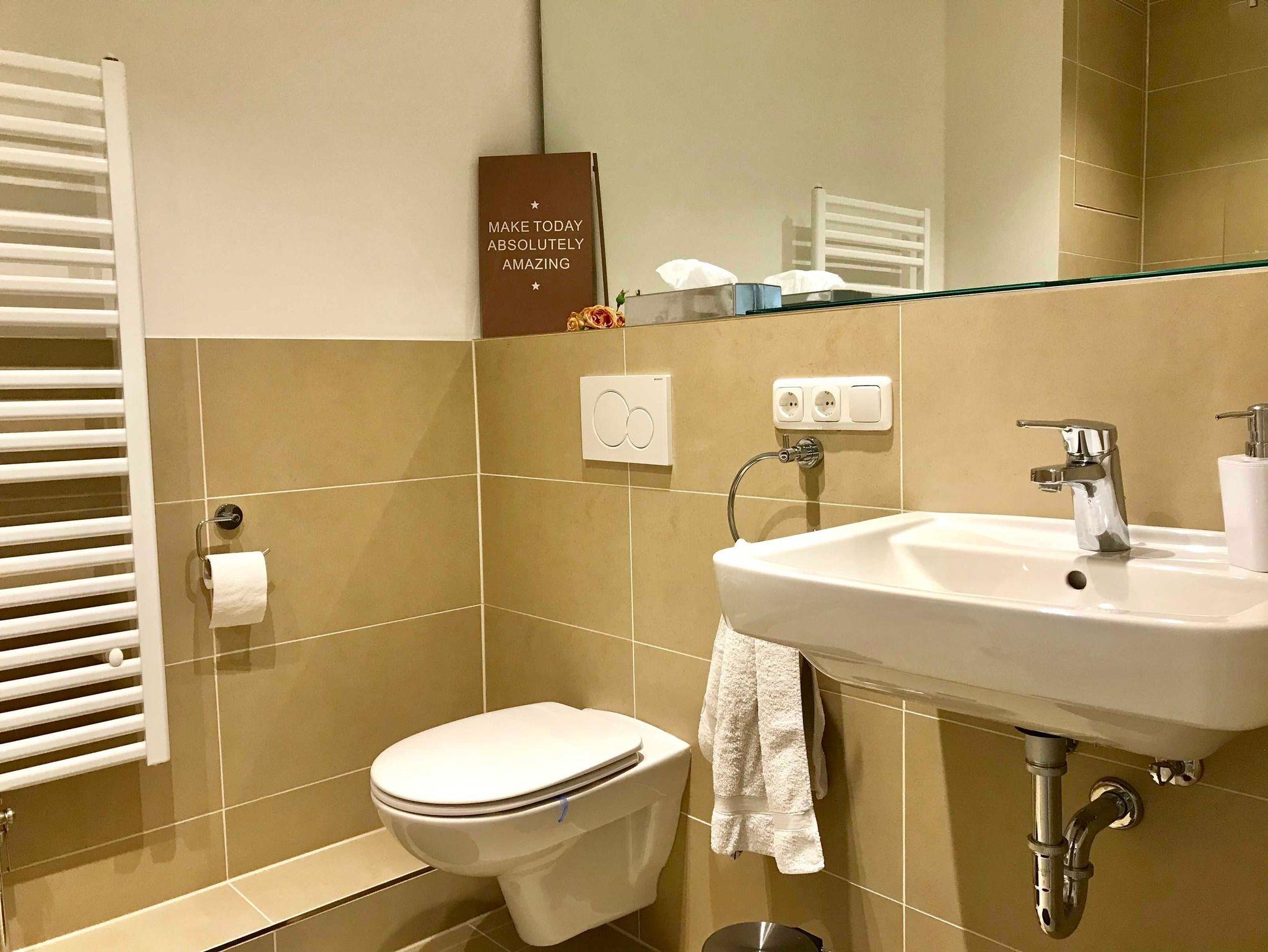 Das moderne und neuwertige Badezimmer inklusive Toilette bietet eine ebenerdige Dusche, einen Handtuchwärmer, einen Fön, einen großen Spiegel und einen kleinen Kosmetikspiegel.