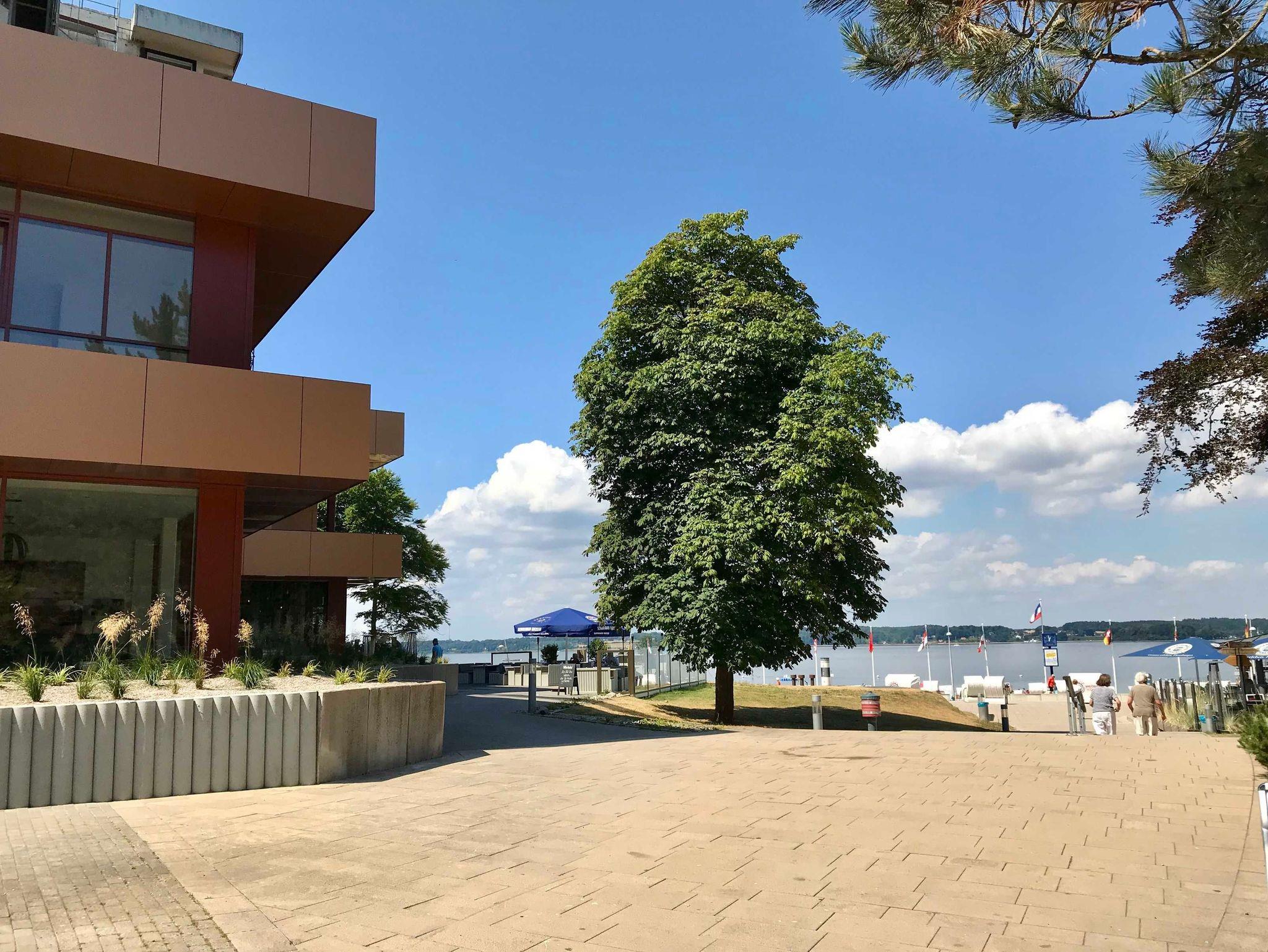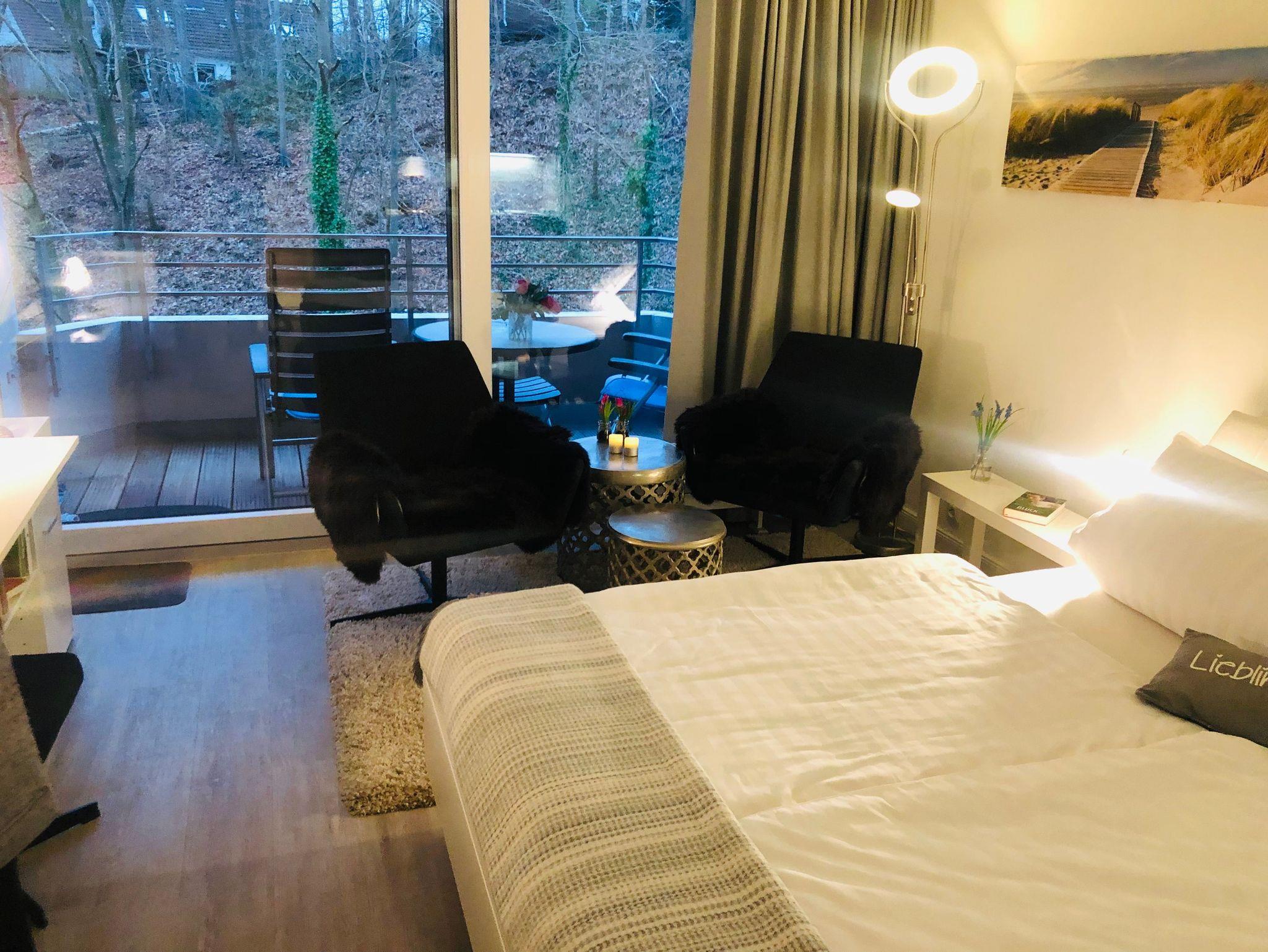 Das sonnenseitige 1-Zimmerappartement mit schönem Balkon befindet sich im 3. Stock des Hotel Intermar mit Blick ins Grüne. In wenigen Schritten erreicht man den Kurstrand, Wanderwege und die Fördeland Therme.